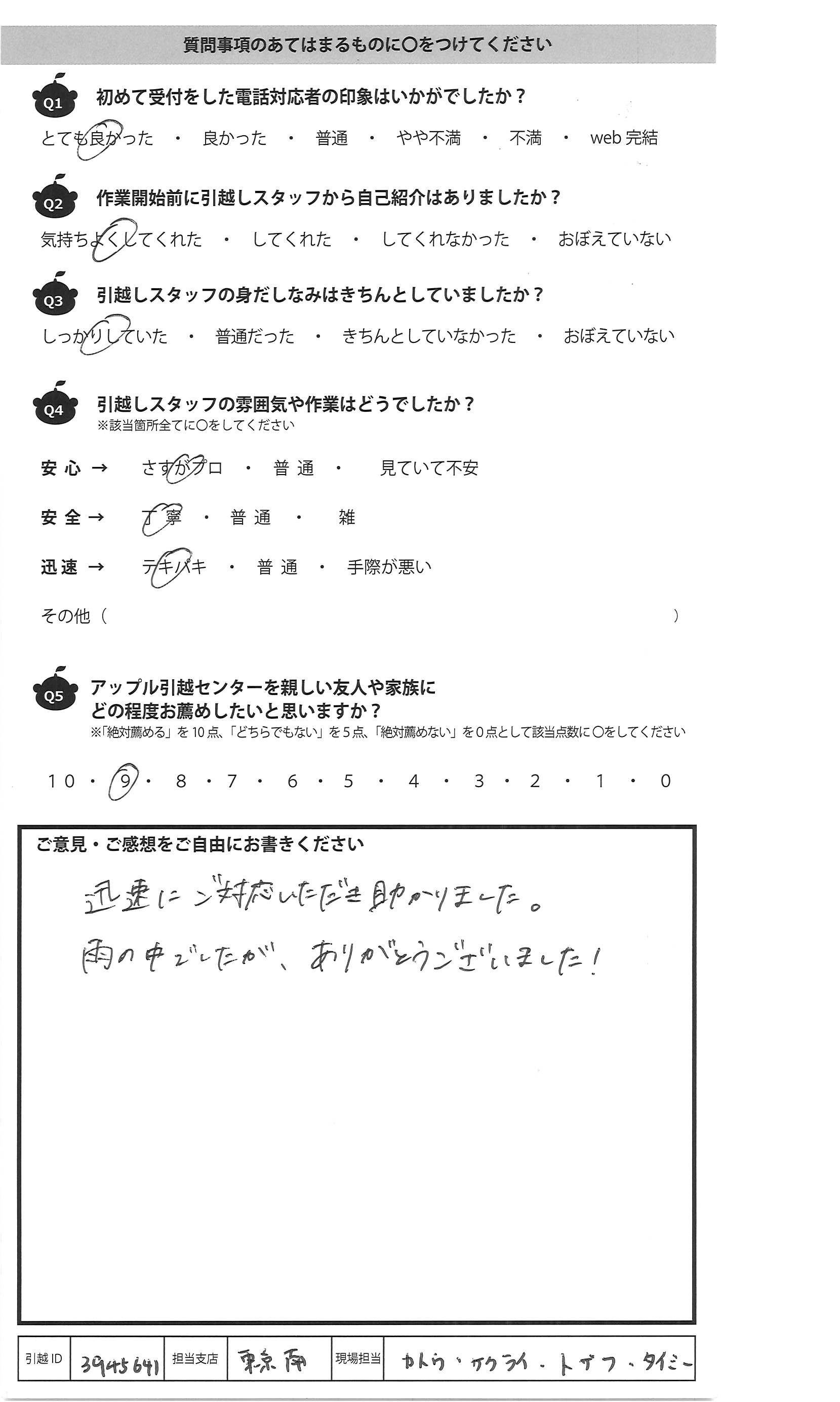 A.迅速にご対応いただき助かりました。 雨の中でしたが、ありがとうございました!