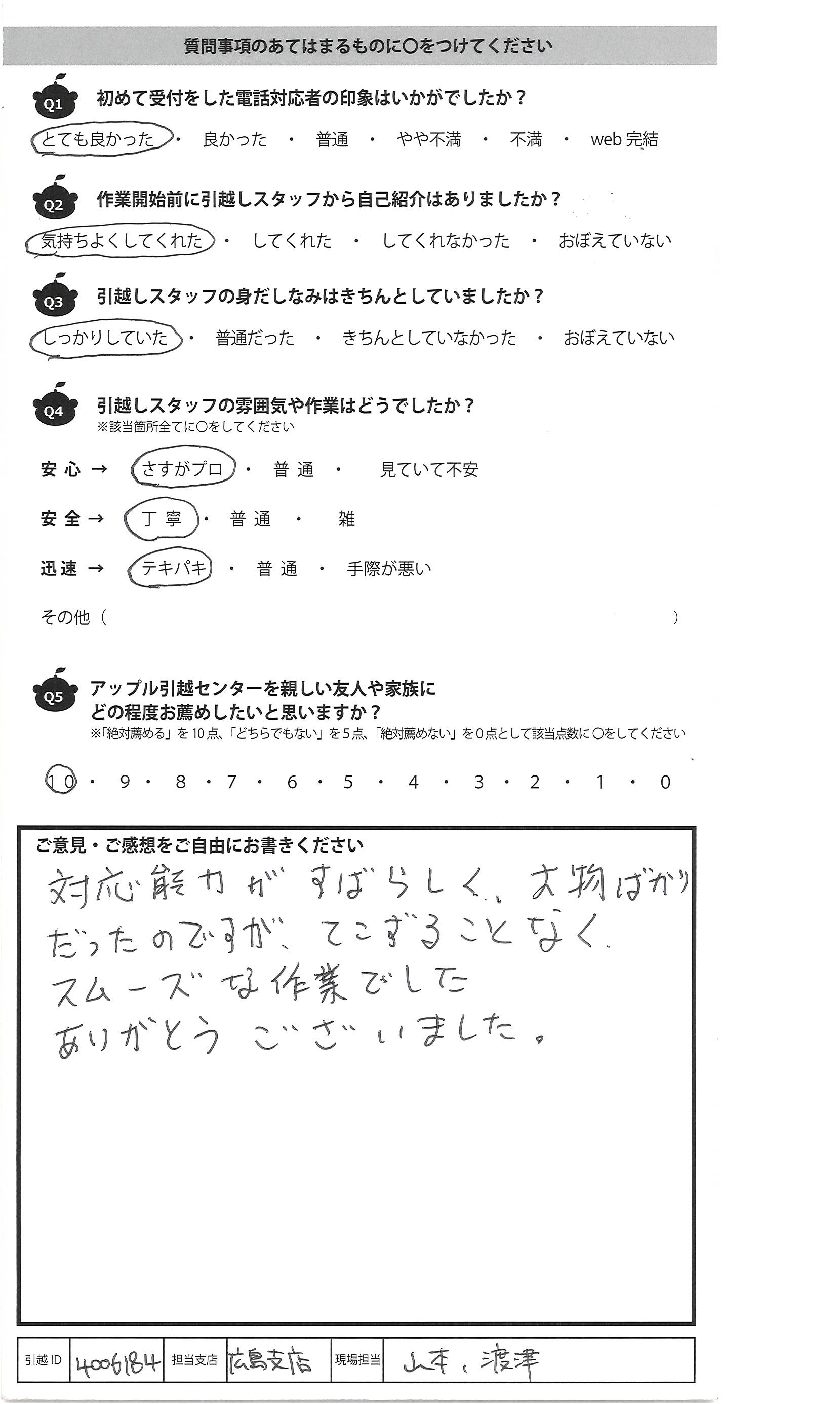 A.これまで大手の引越会社さんにお世話になってきたが それ以上のスピード、対応で良い意味でおどろいてます。 引越先の近隣の方へ、荷入れ前に念のためごあいさつを 率先してやっていただいた、サブリーダー(?)の方、また様々な ご相談にもフレキシブルい対応頂いた加藤様、みなさまに 感謝しています。 次回、また周りにもすすめます。