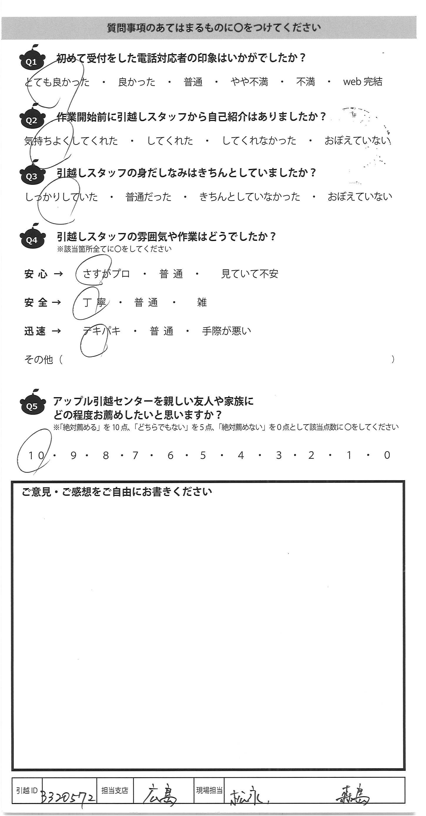 A.電話対応もとてもよく、メールにも案内が来て、助かりました。 当日の引っ越しは、沢山の荷物を運んで下さり、本当に有り難かったです。 重い荷物があるのに、階段でよく運んで下さったなぁと思っています。 また、約1年前もアップル引っ越しセンターさんを初めて利用させていただきました。 その時の対応が本当に素晴しく、今回の引っ越しもぜひ都合があえば、 アップル引っ越しセンターさんでと思っていました。信頼、安心に繋がって いました。2人のスタッフの方の連携もステキで、見ていて、気持ちよかった です。ただ1年前にアンケートをしておらず、仕事、片付け、手続き等で忙しく インターネットでできませんでした。申し訳ありまでん。今回は、この葉書を頂き、 アンケートに答えることができました。本当に、2回とも感謝の気持ちで一杯で す。素晴しいサービスで、また引っ越しをする際、都合があれば利用できたらと思って おります。ありがとうございました。(1回目は、福岡東上園さん)