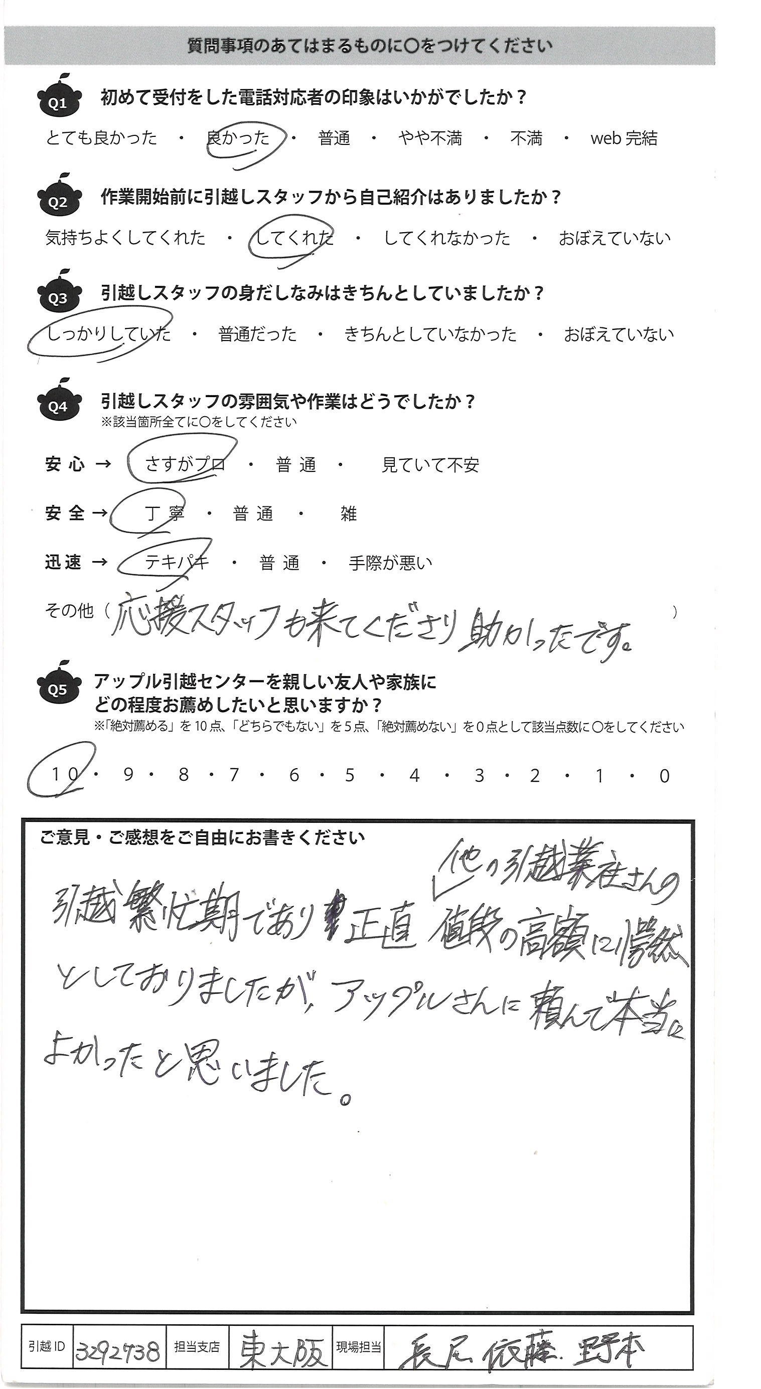 A.引越繁忙期であり正直他の引越業社さんの値段の高額に愕然 としておりましたが、アップルさんに頼んで本当に よかったと思いました。