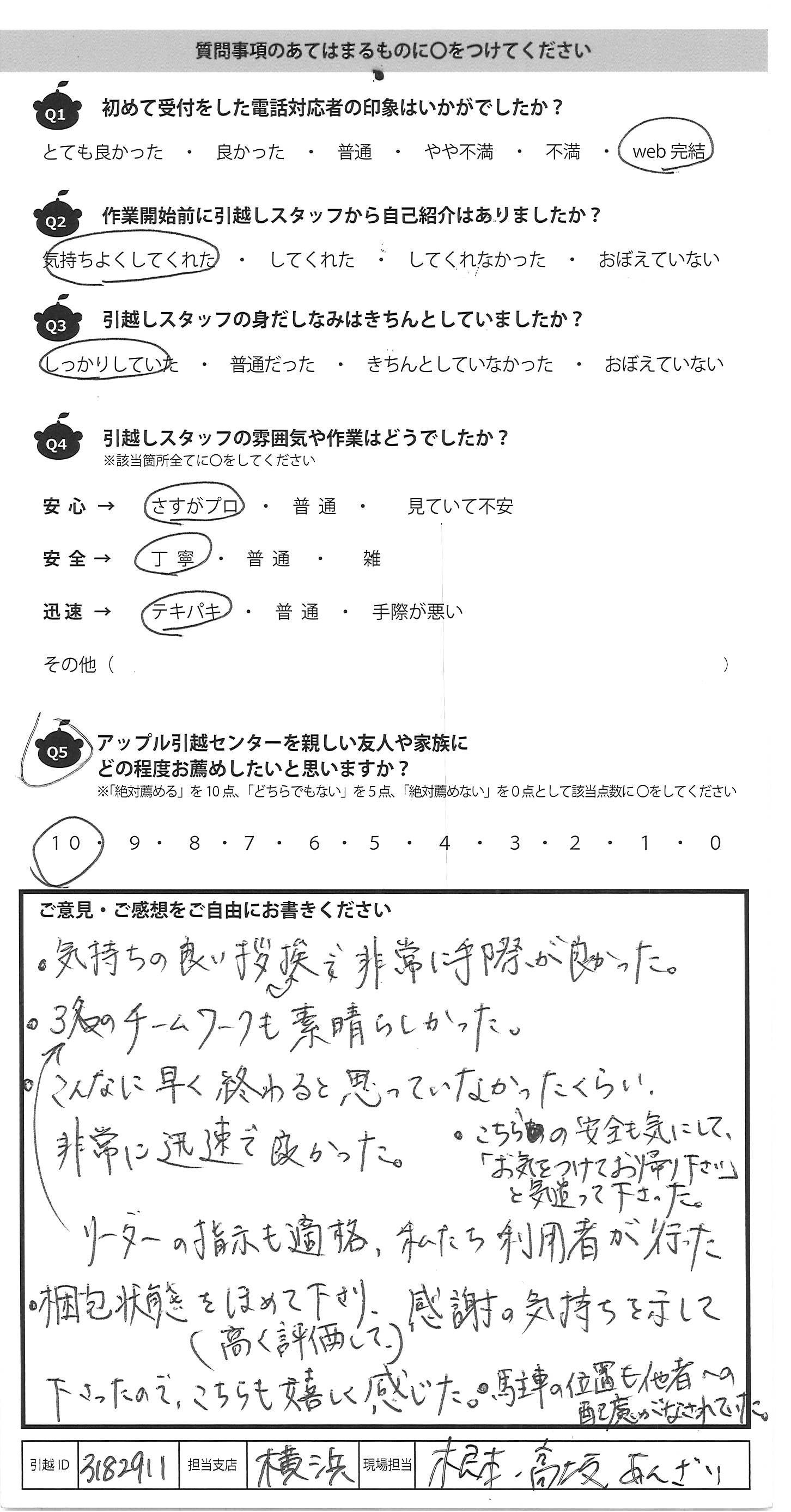 A.・気持ちの良い挨拶で非常に手際が良かった。 ・3名のチームワークも素晴らしかった。 リーダーの指示も適格、私たち利用者が行った ・こんなに早く終わると思っていなかったくらい。 非常に迅速で良かった。 ・こちらの安全も気にして、「お気をつけてお帰り下さい」と気遣って下さった。 ・梱包状態をほめて下さり、(高く評価して、)感謝の気持ちを示して 下さったので、こちらも嬉しく感じた。 ・駐車の位置も他者への配慮はなされていた。