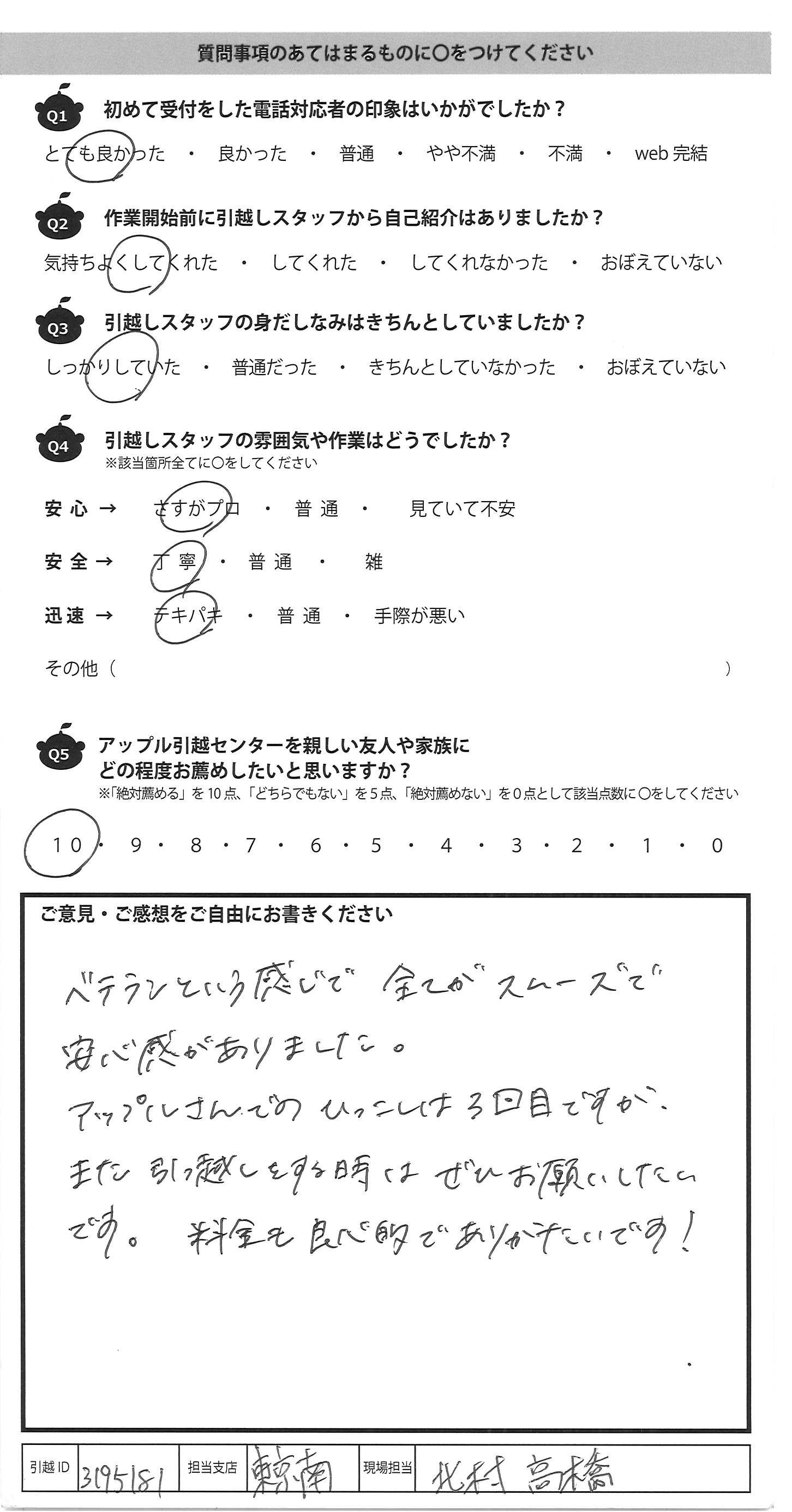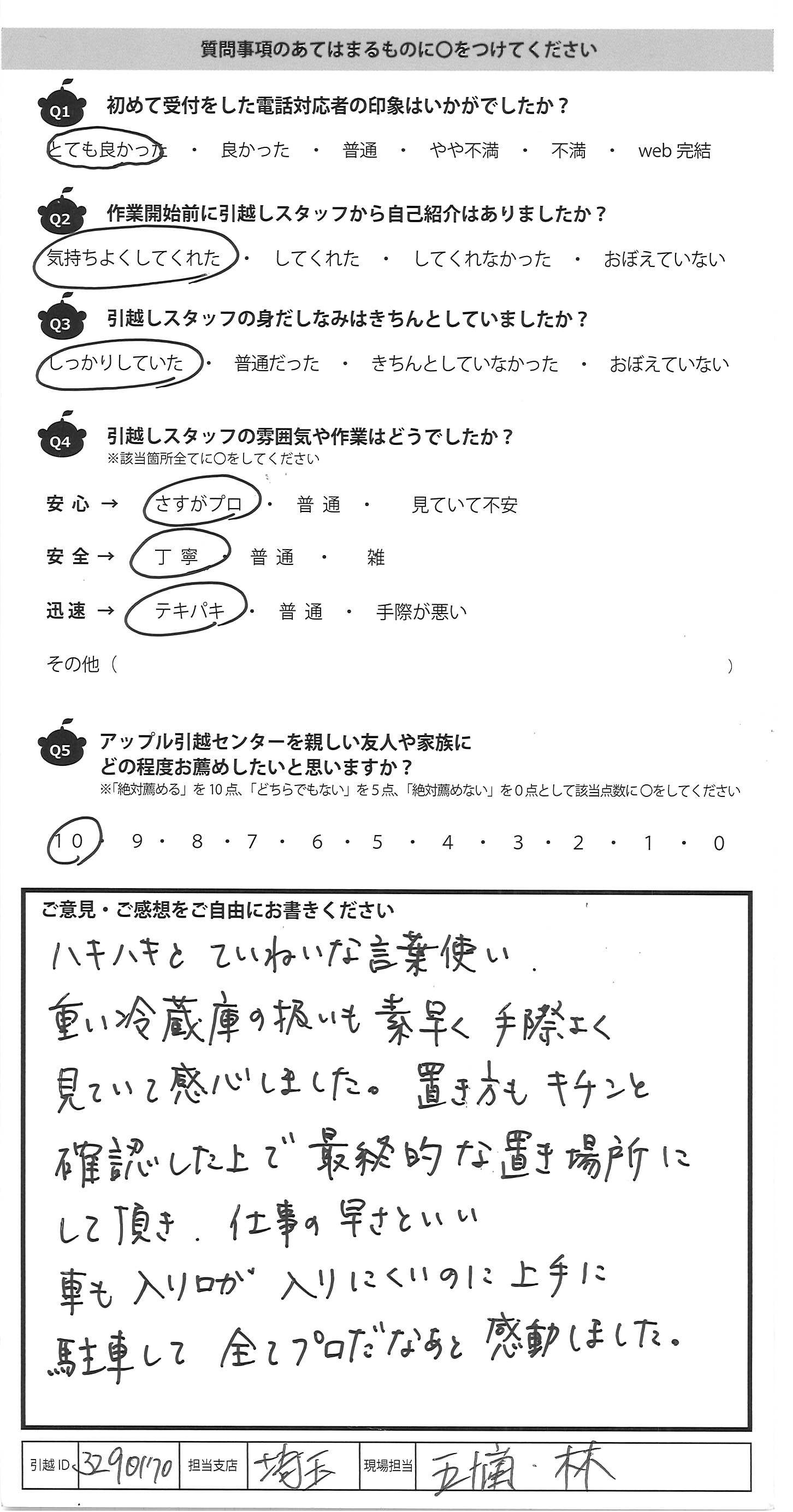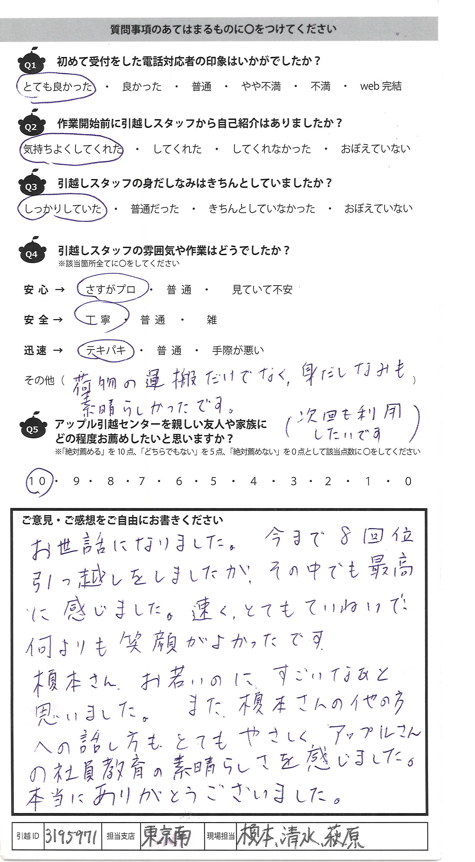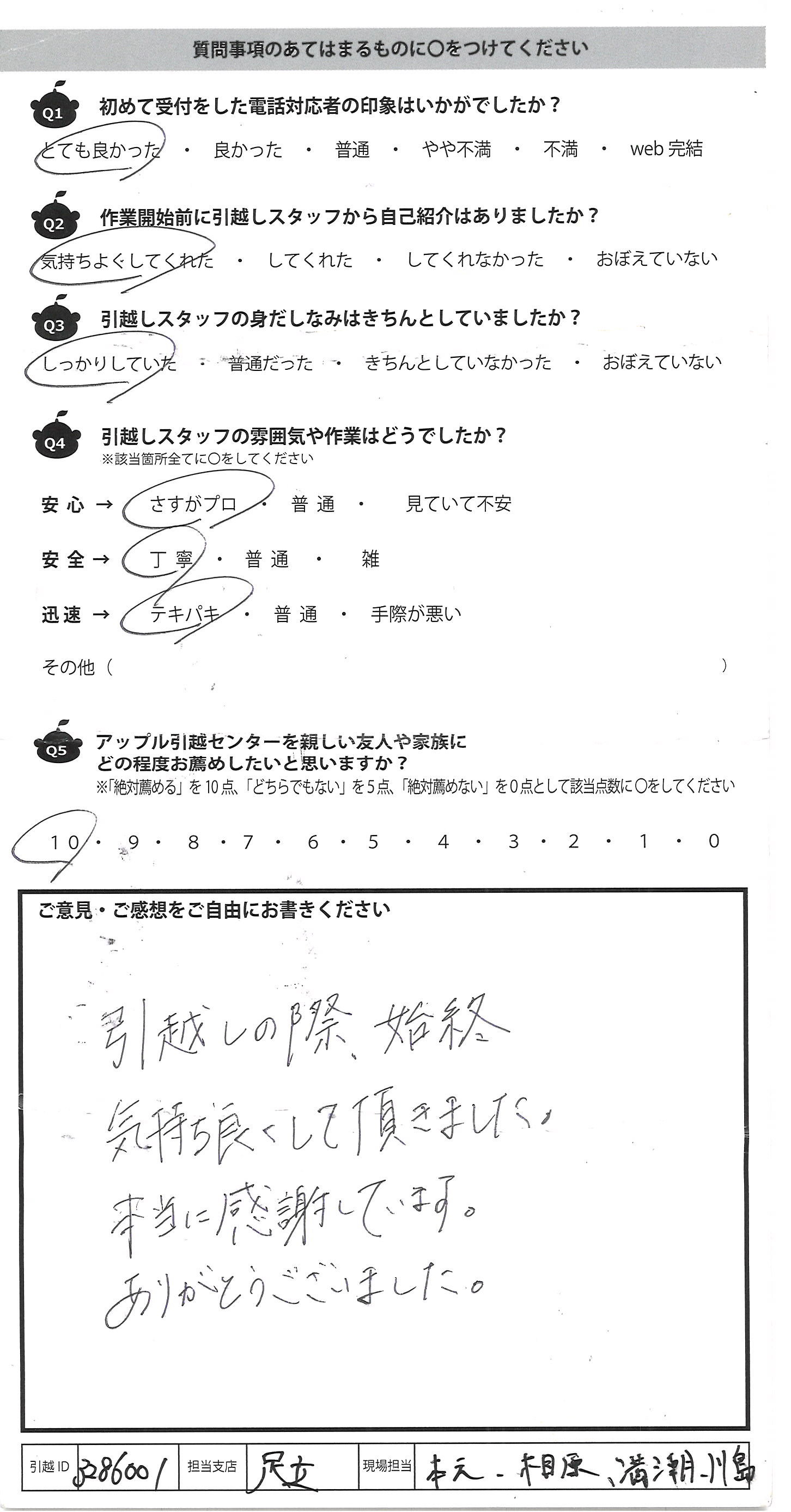 A.お世話になりました。今まで8回位 引っ越しをしましたが、その中でも最高 に感じました。速く、とてもていねいで 何より笑顔がよかったです。 榎本さん、お若いのにすごいなぁと 思いました。また、榎本さんの他の方 への話し方もとてもやさしく、アップルさん の社員教育の素晴らしさを感じました。 本当にありがとうございました。