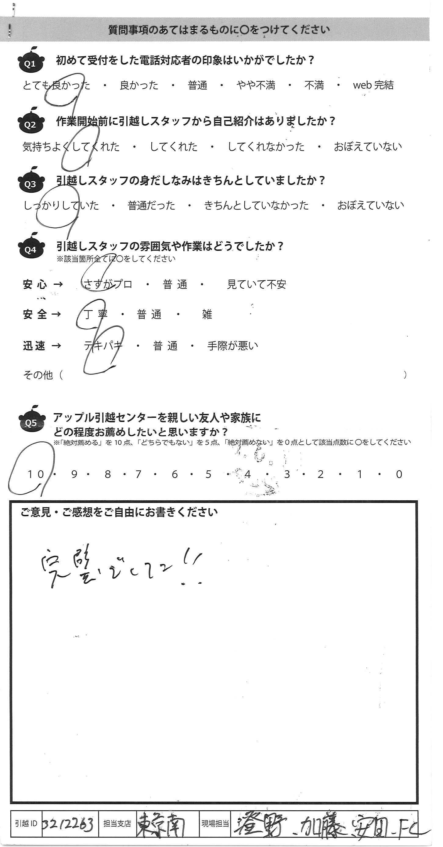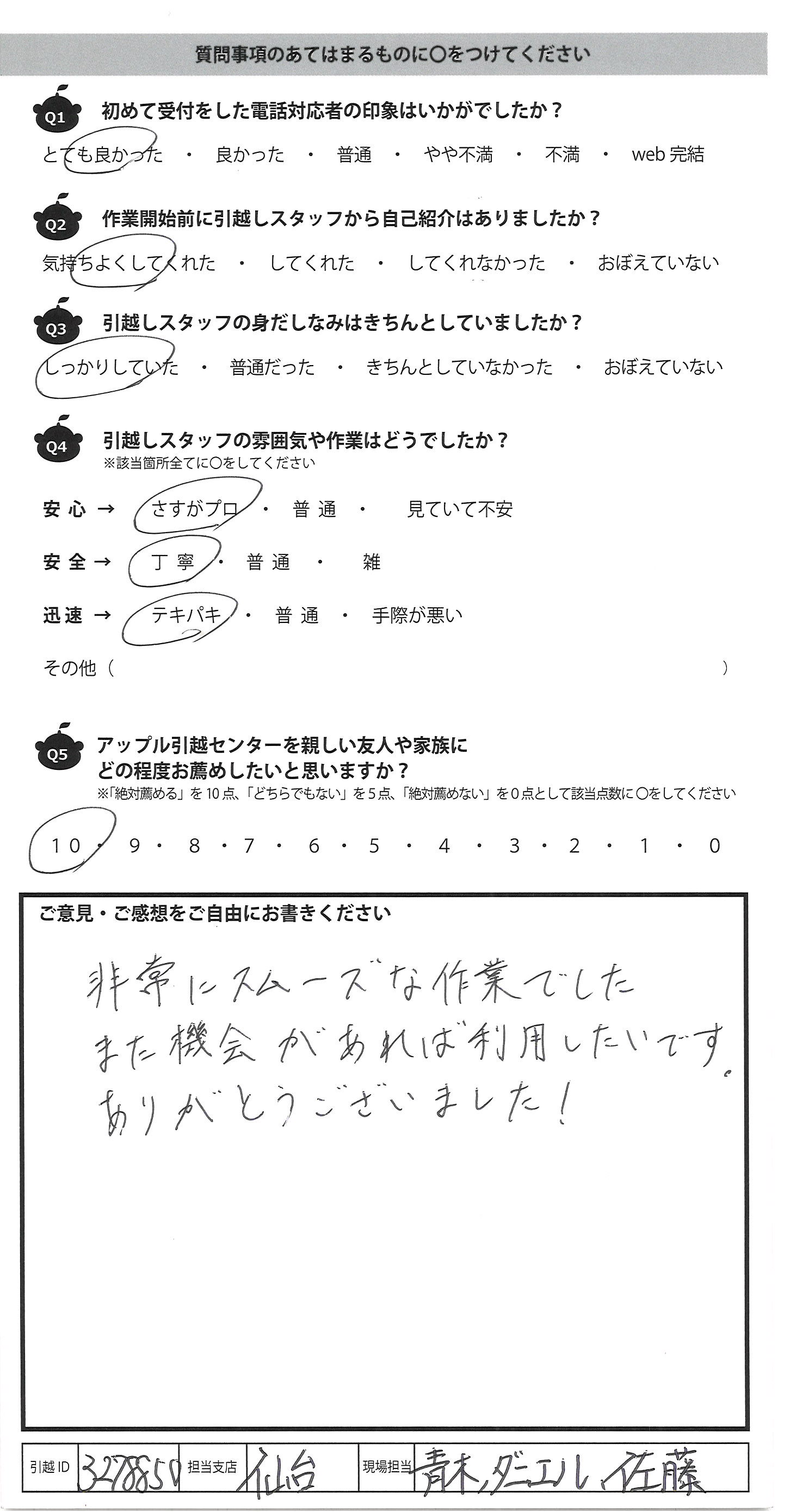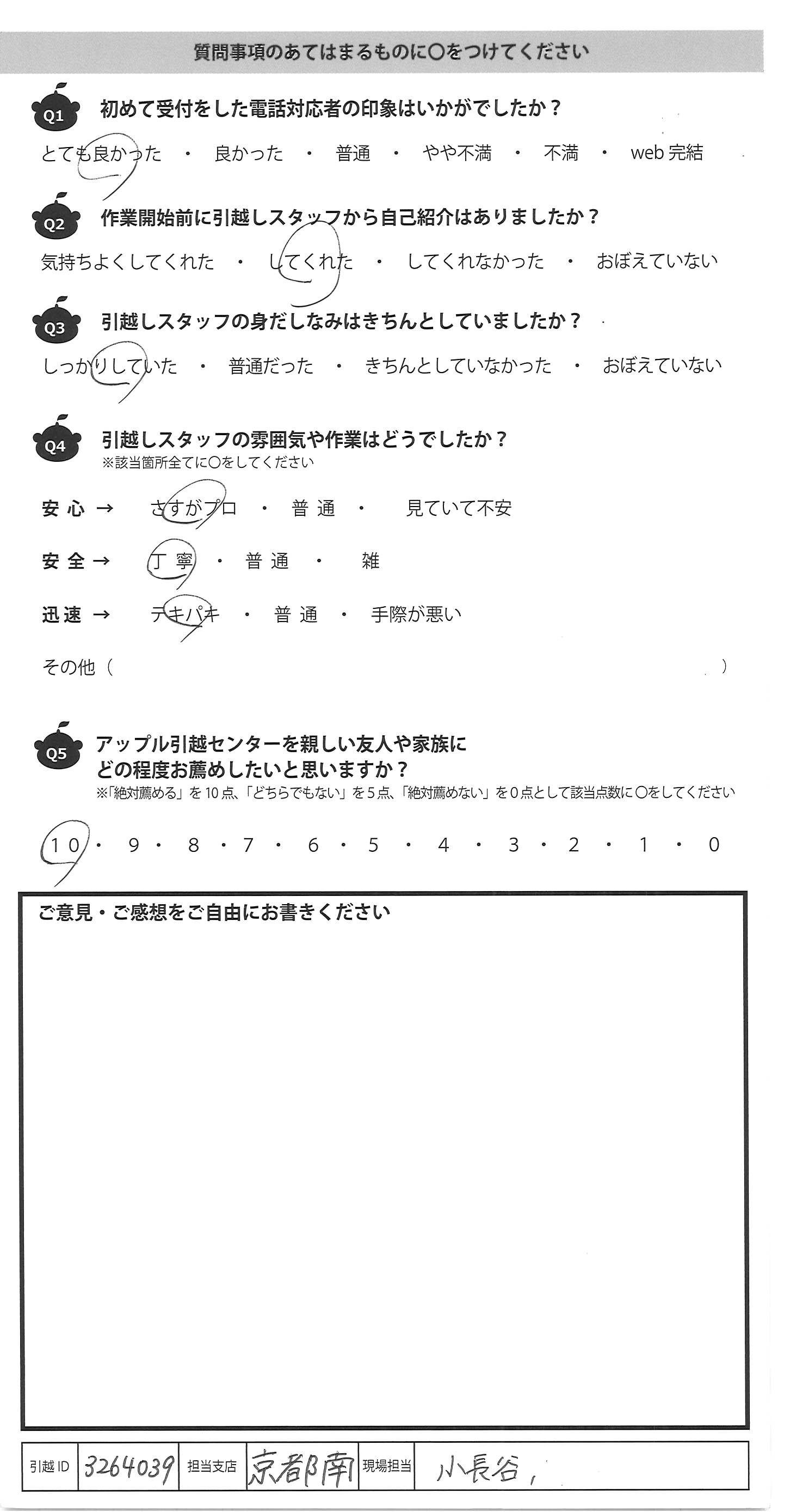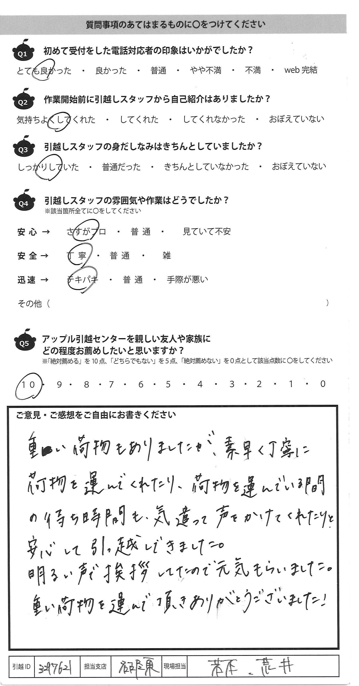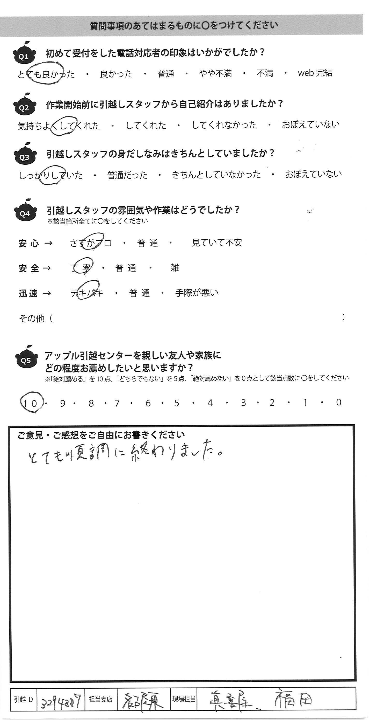 A.お世話になりました。今まで8回位 引っ越しをしましたが、その中でも最高 に感じました。速く、とてもていねいで 何より笑顔がよかったです。 榎本さん、お若いのにすごいなぁと 思いました。また、榎本さんの他の方 への話し方もとてもやさしく、アップルさん の社員教育の素晴らしさを感じました。 本当にありがとうございました。