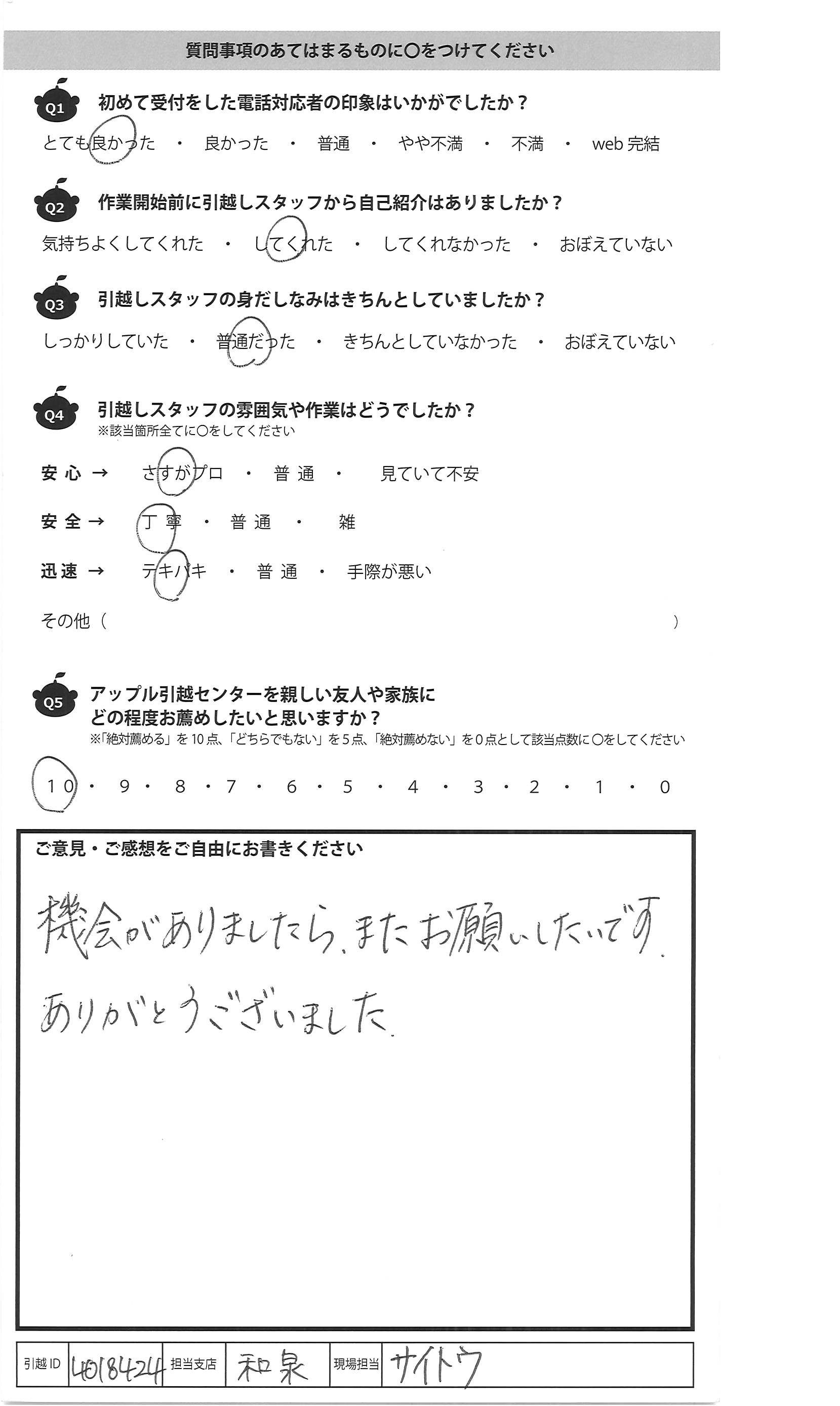 A.丁寧に対応してくださりありがとうございました。 また引越しの際はお願いしたいです。
