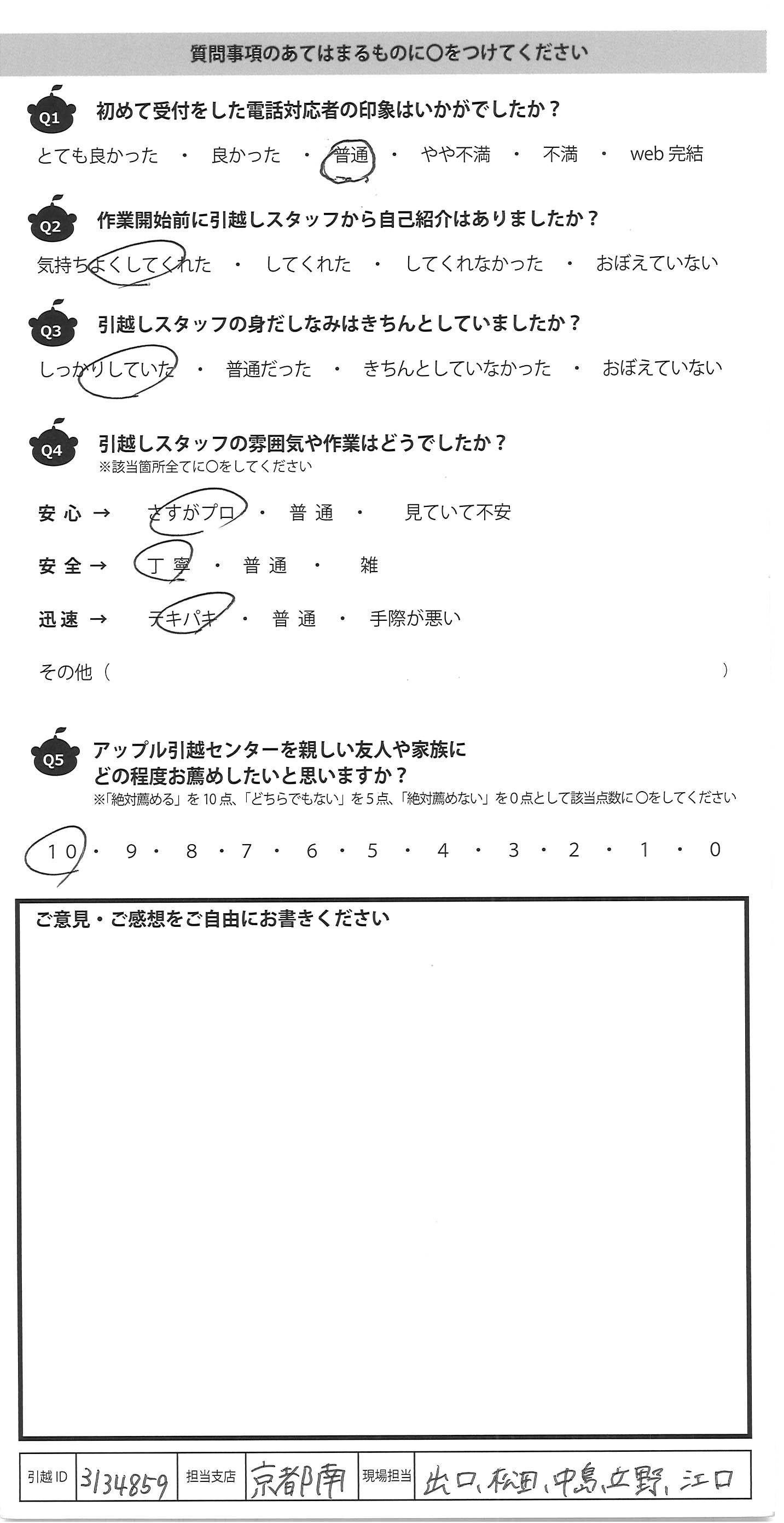 A.テキパキと運び出していただきました。 また、配置も丁寧に確認してくださり、 助かりました。 もしできれば壊れやすい家具などは 2名以上で運んでいただけるとありがたかったです。 お世話になり、誠にありがとうございました。