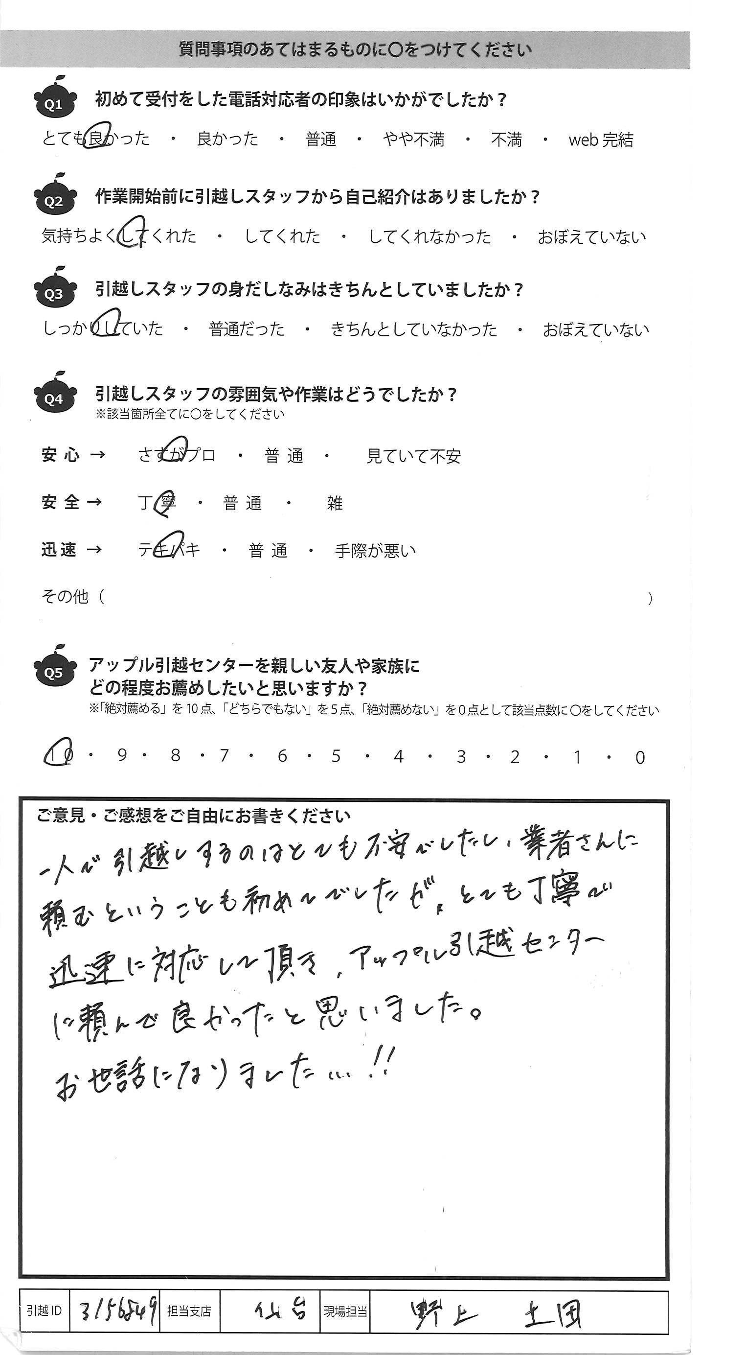 A.一人で引越しするのはとても不安でしたし、業者さんに 頼むということも初めてでしたが、とても丁寧で 迅速に対応して頂き、アップル引越センター に頼んで良かったと思いました。 お世話になりました…!!