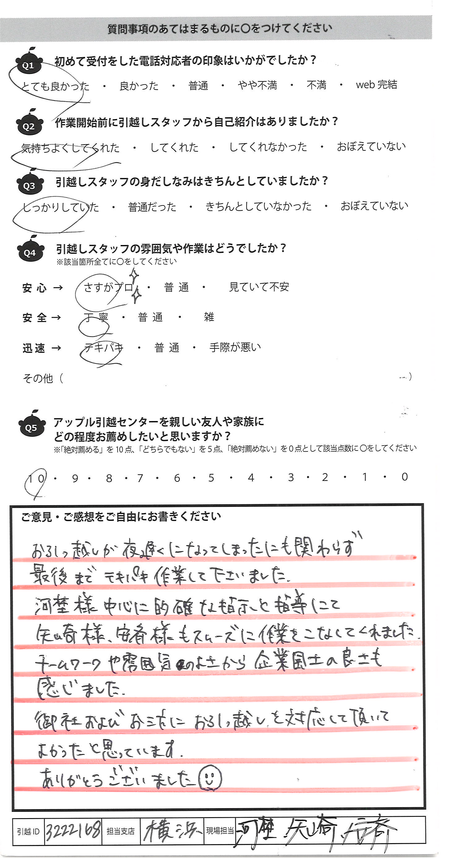 A.お引っ越しが夜遅くになってしまったにも関わらず 最後までテキパキ作業して下さいました。 河埜様中心に的確な指示と指導にて 矢崎様、安斉様もスムーズに作業をこなしてくれました。 チームワームや雰囲気のよさから企業風土の良さも 感じました。 御社およびお三方にお引っ越しを対応して頂いて よかったと思っています。 ありがとうございました