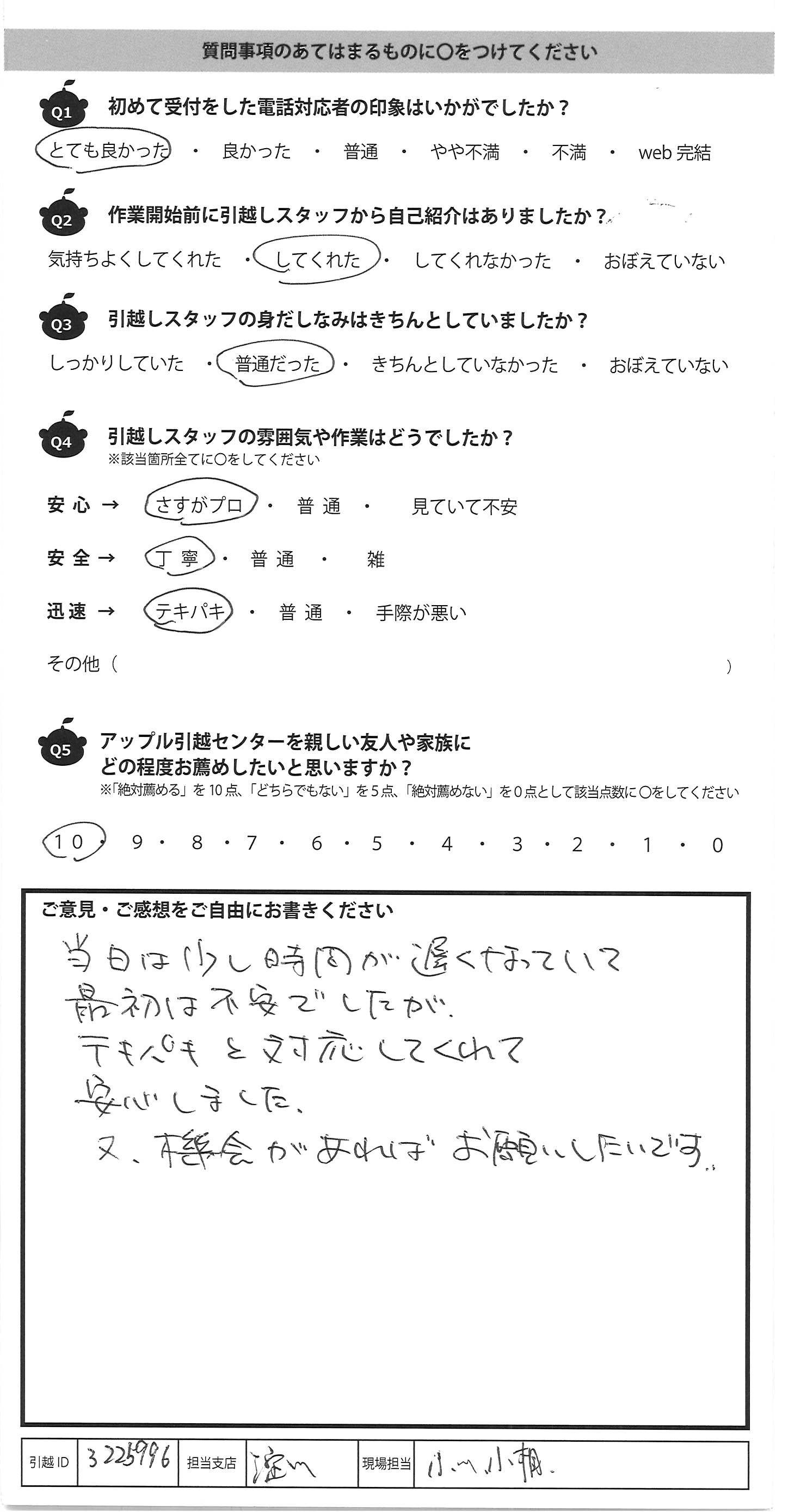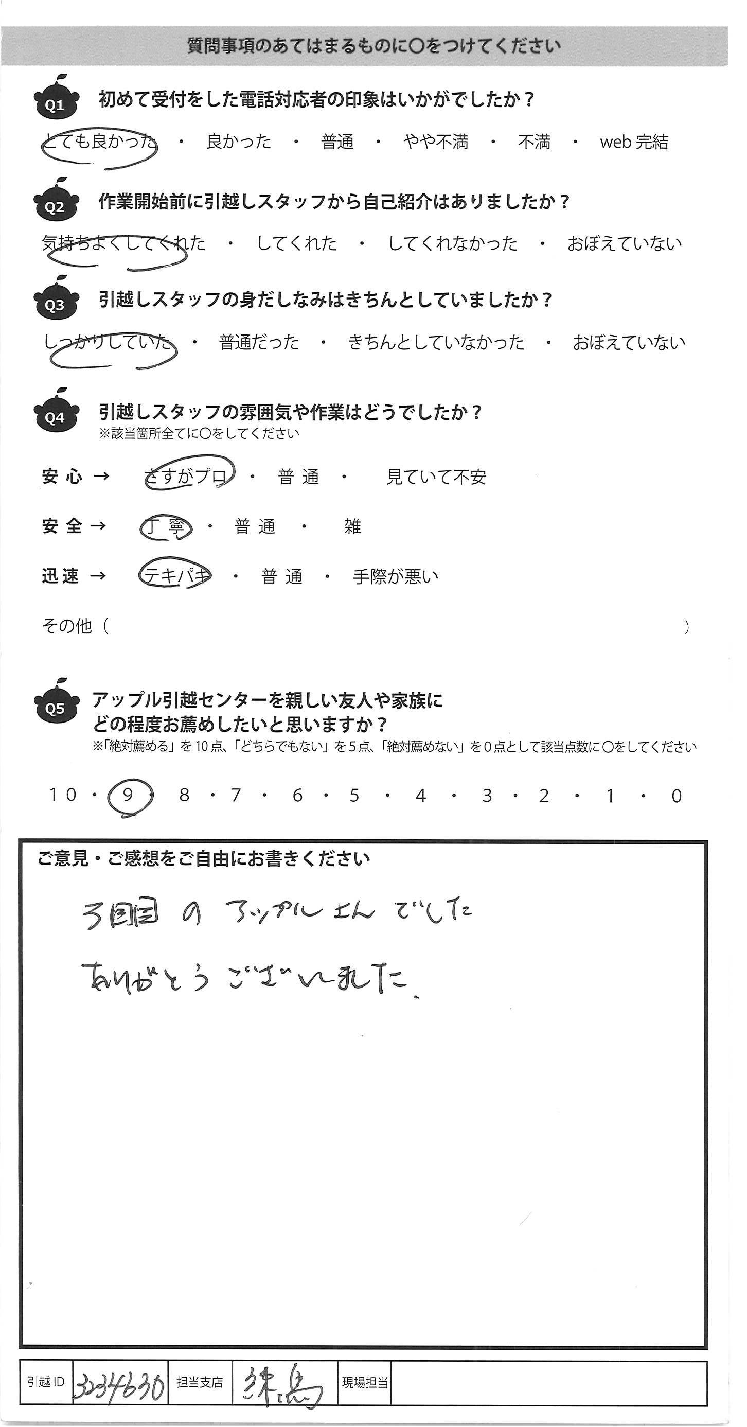 アップル引越センターでは、面映いお褒めの言葉も、胸に突き刺さるお叱りのコメントも、