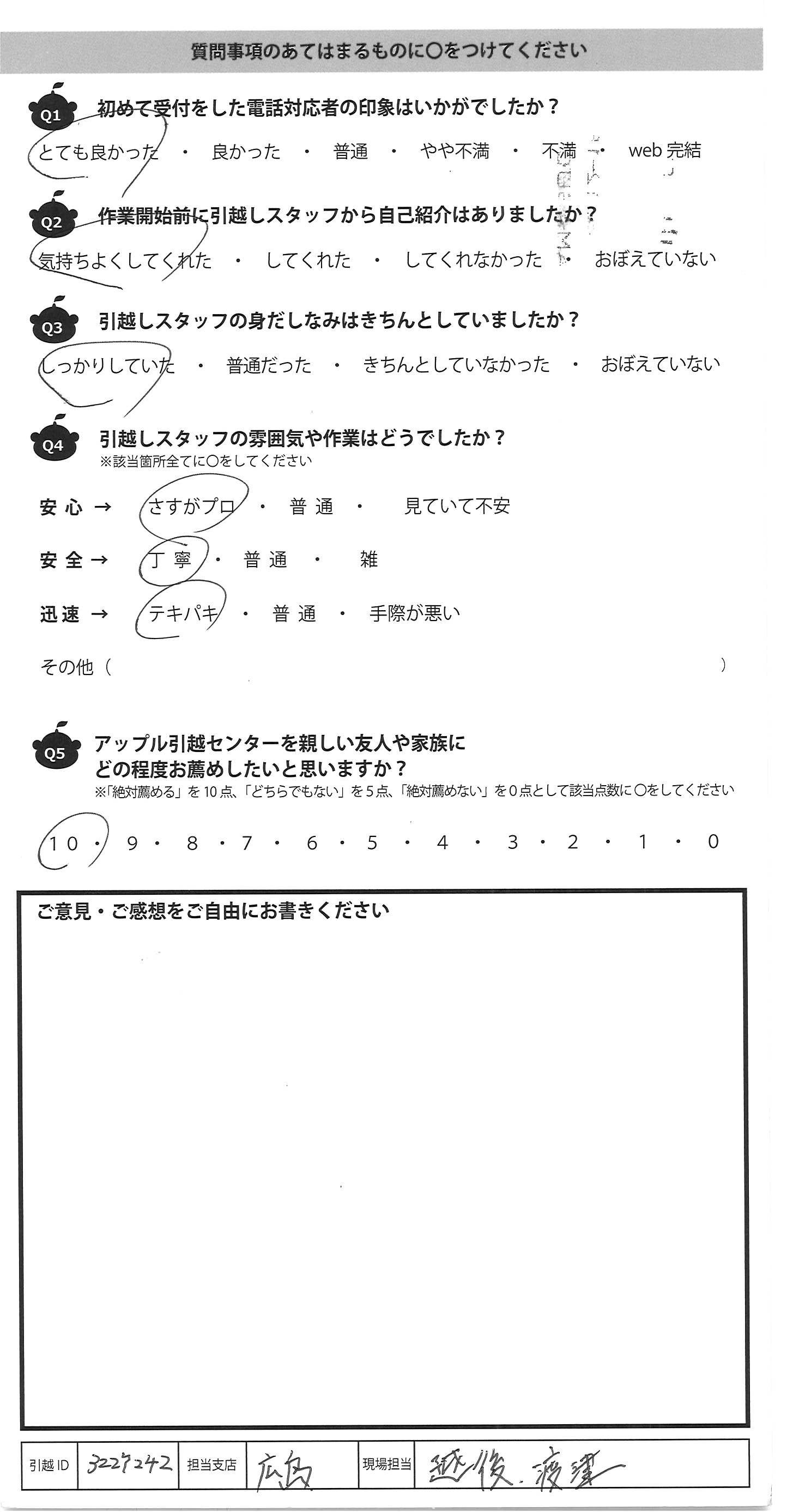 A.引っ越しは不安なものですが、山里さんの様子や 話し方、世間話などで安心することができました かなり柔軟に対応いただき、洗濯機設置で は親身になって動作が確実になるまで作業 いただきとても助かりました、搬出時は山里さん 1人になってしまったようでしたが、少なくない荷物 量にもかかわらず、しっかり完了いただきました。搬 入時はヒイラギさんが外とトラック作業、山里さん が中の作業と分担されていてとてもスムーズでした ありがとうございました。次回もぜひお願いします(ヒイラギ)