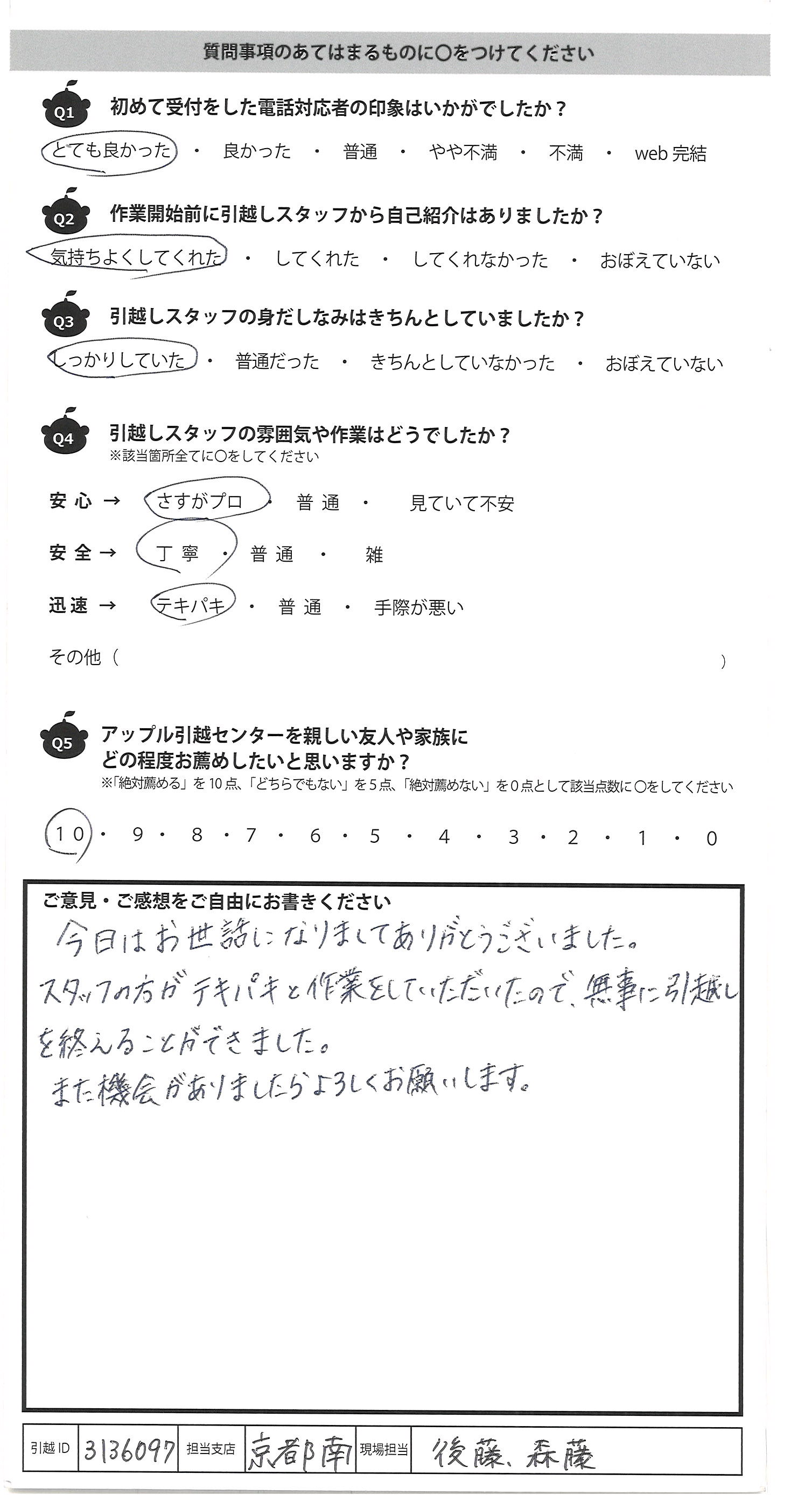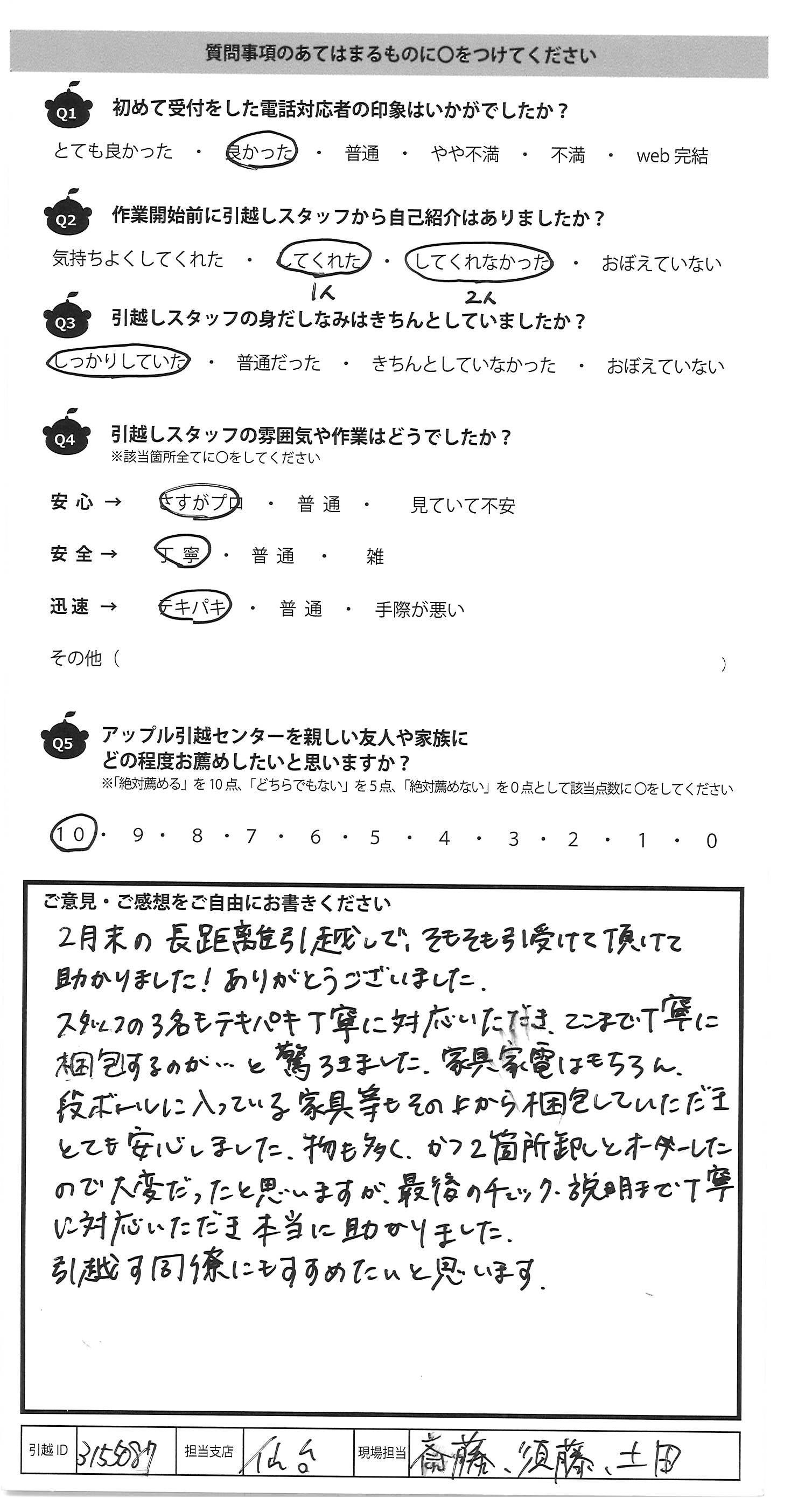 A.2月末の長距離引越しで、そもそも引受けて頂けて 助かりました!ありがとうございました。 スタッフの3名もテキパキ丁寧に対応いただき、ここまで丁寧に 梱包するのか…と驚ろきました。家具家電はもちろん、 段ボールに入っている家具等もその上から梱包していただき とても安心しました。物も多く、かつ2箇所卸しとオーダーした ので大変だったと思いますが、最後のチェック、説明まで丁寧 に対応いただき本当に助かりました。 引越す同僚にもすすめたいと思います。