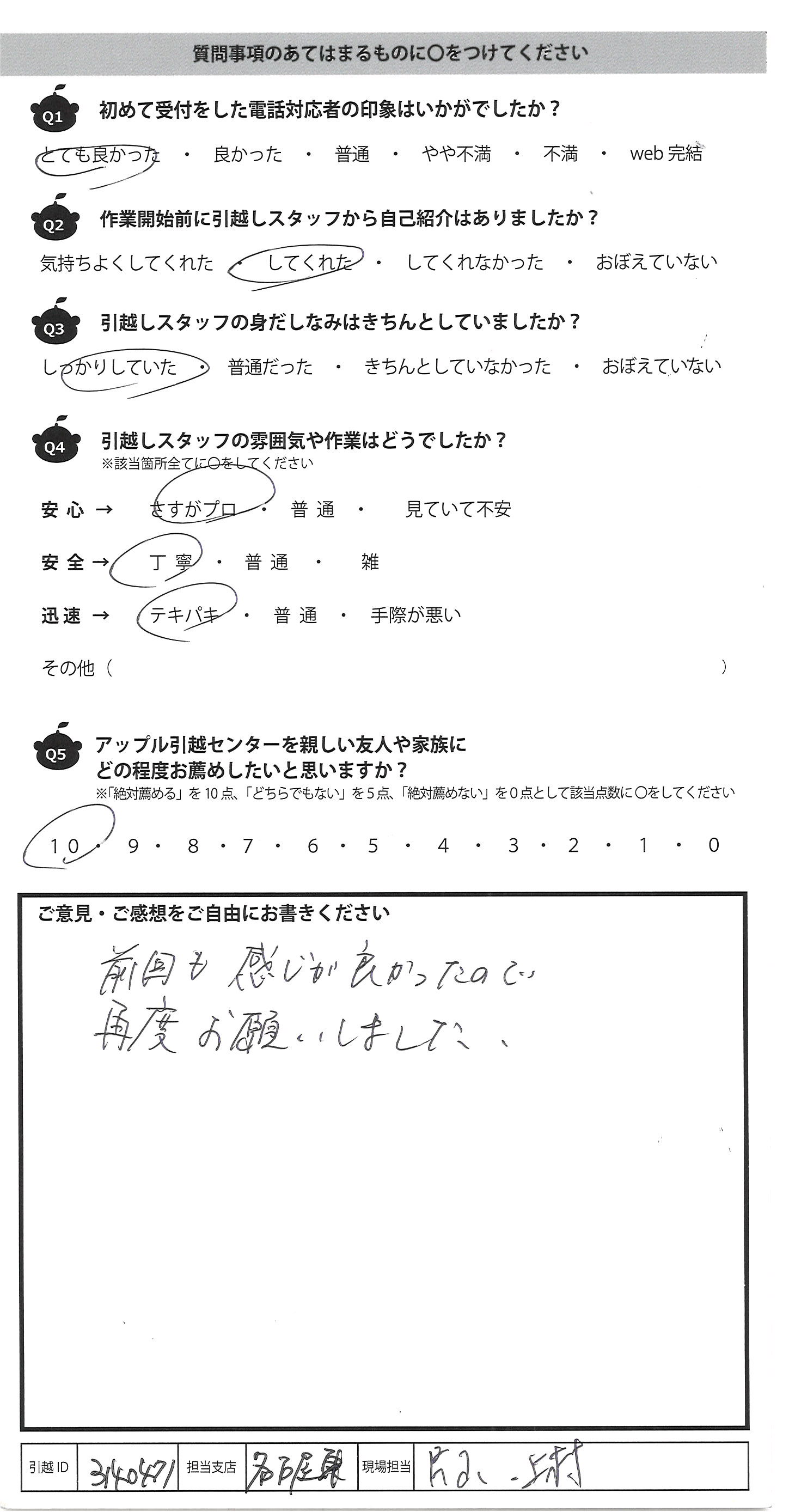 A.以前利用させていただき、今回も利用させて いただきました。 相変わらず、手際が良く、とても丁寧に 荷運びをしていただき、引越しがとても速く 終えることができました。 ありがとうございました。