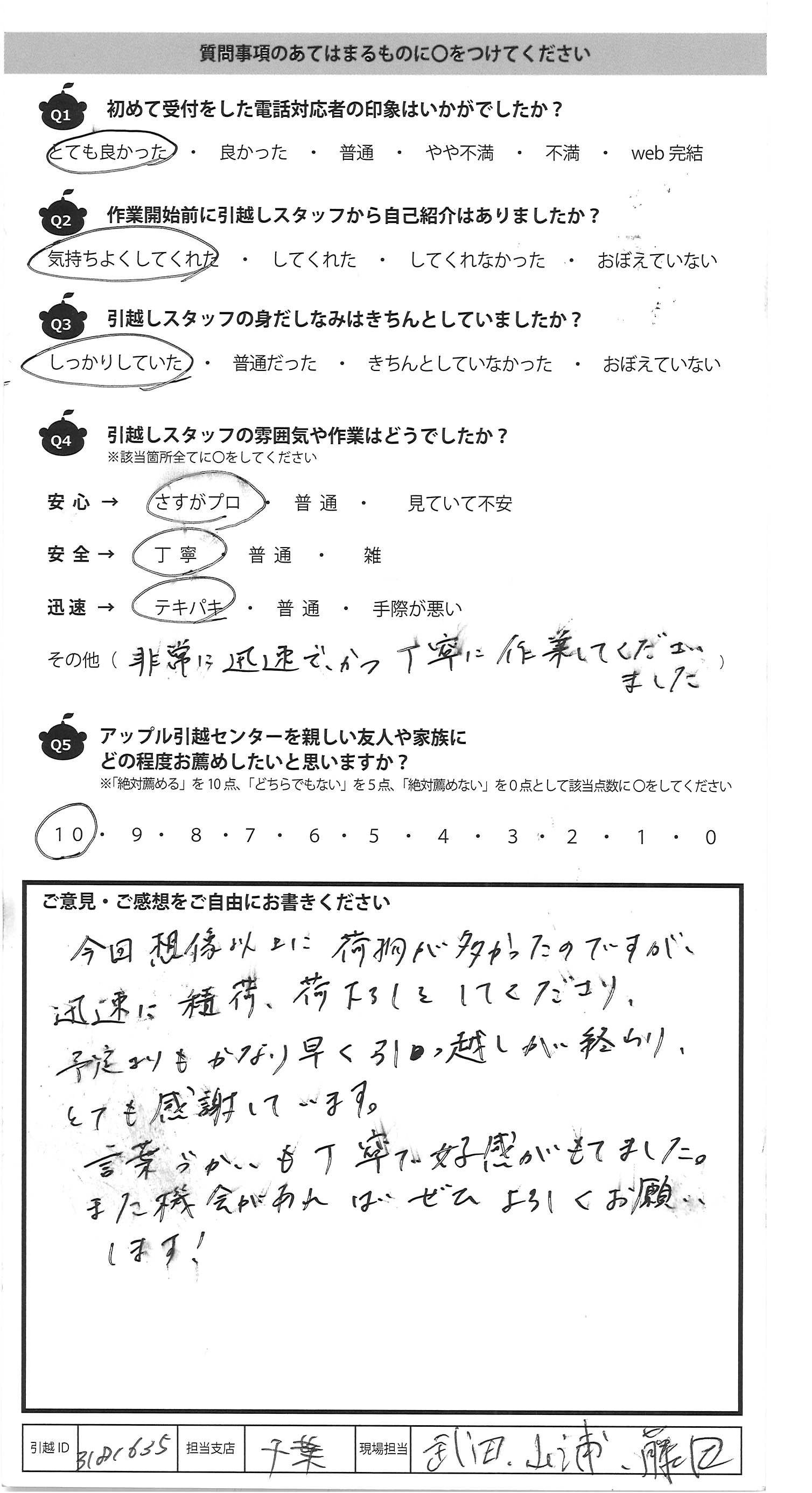 A.今回想像以上に荷物が多かったのですが、 迅速に積荷、荷下ろしをしてくださり、 予定よりもかなり早く引っ越しが終わり、 とても感謝しています。 言葉づかいも丁寧で好感がもてました。 また機会があればぜひよろしくお願い します!