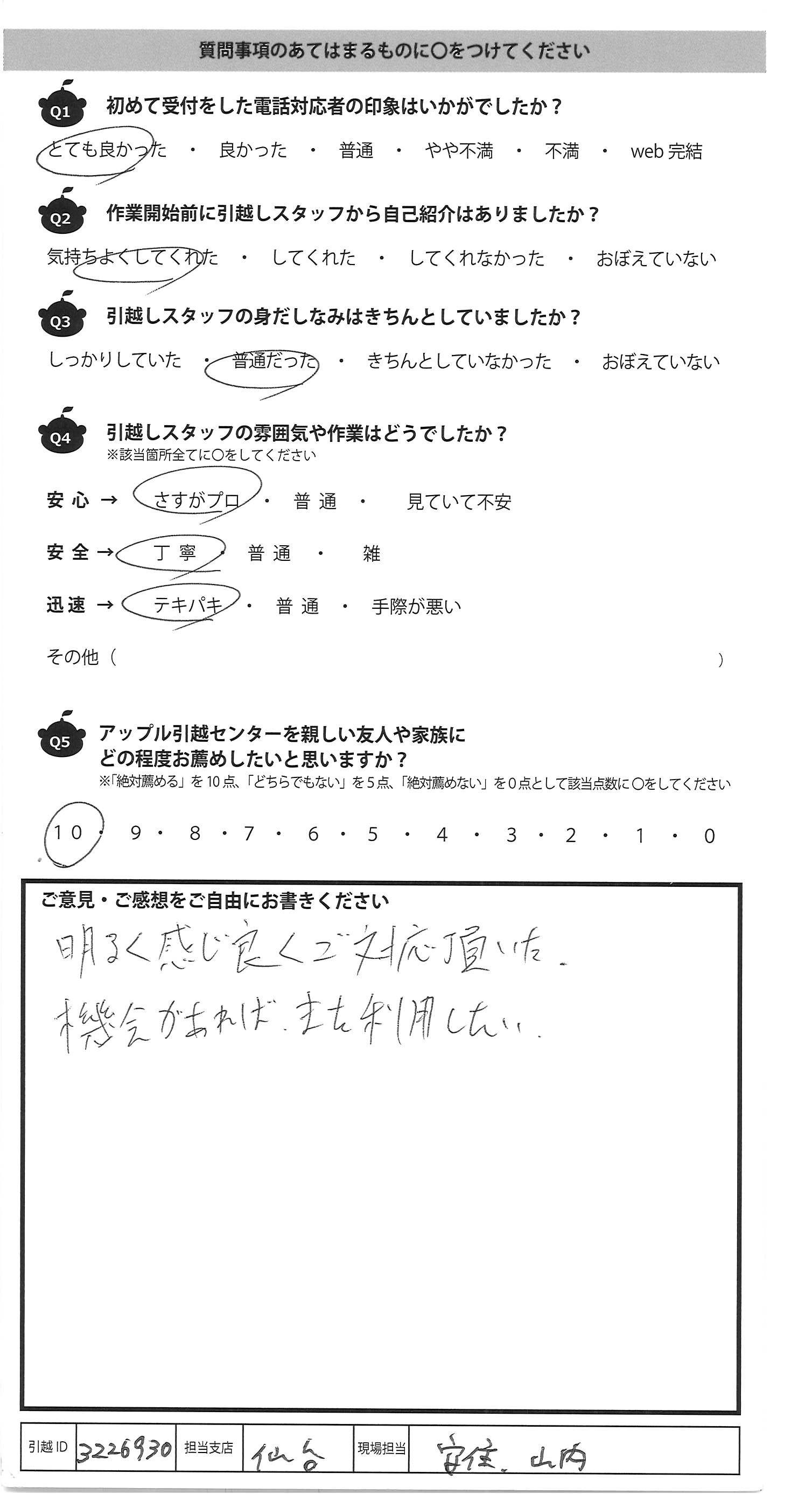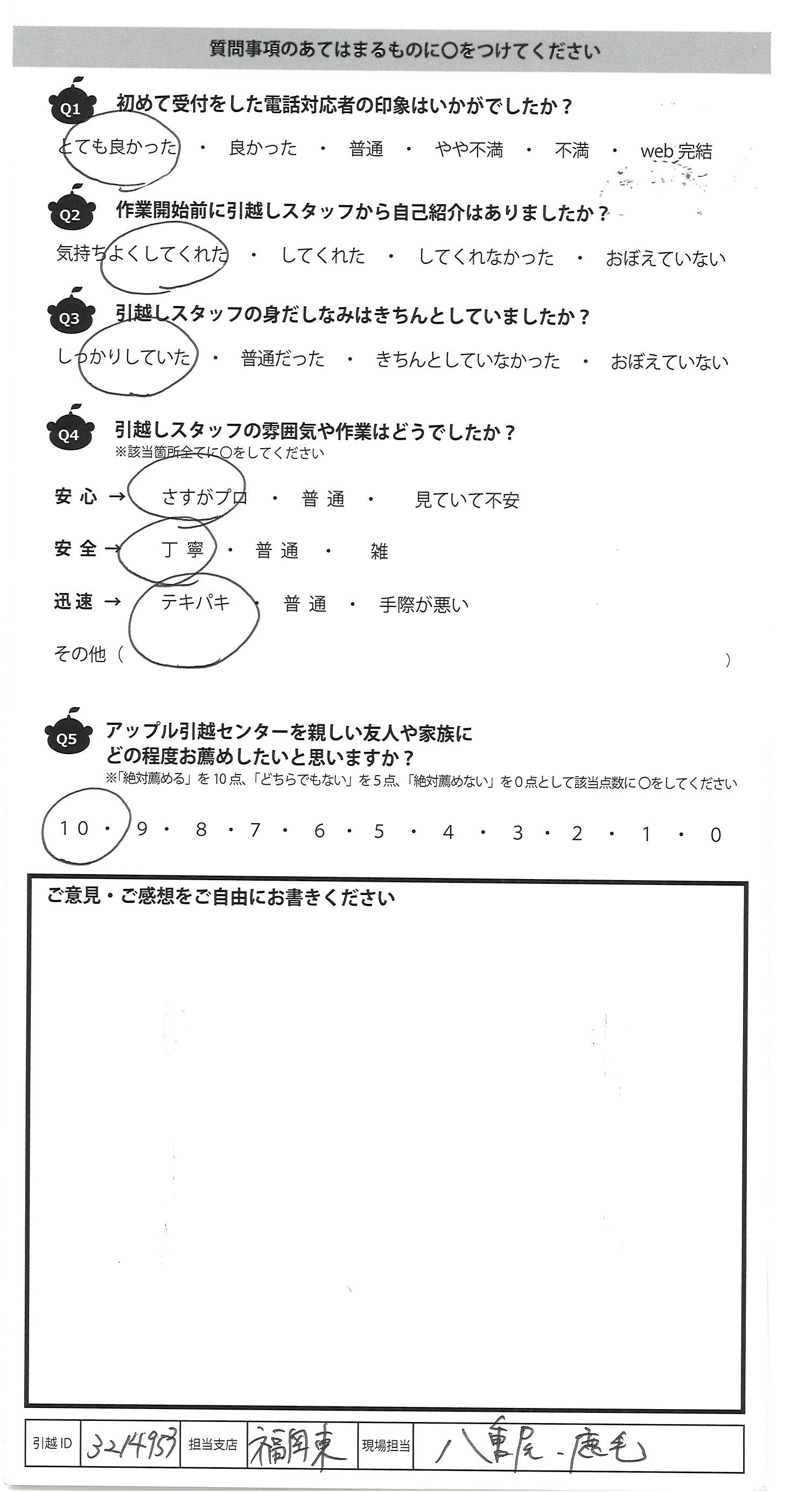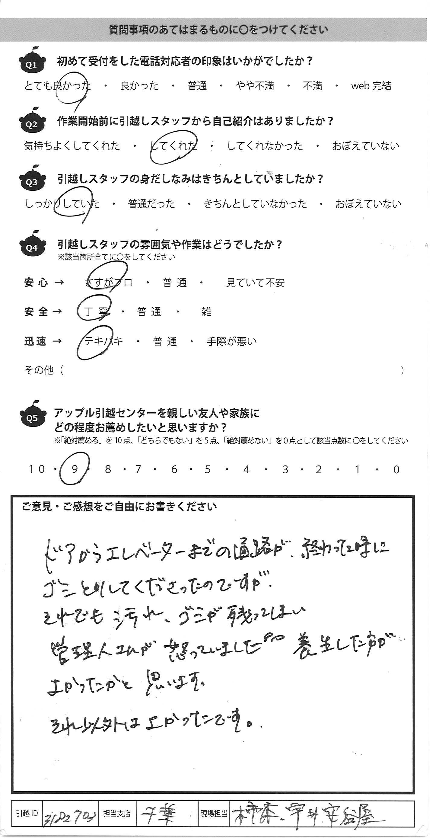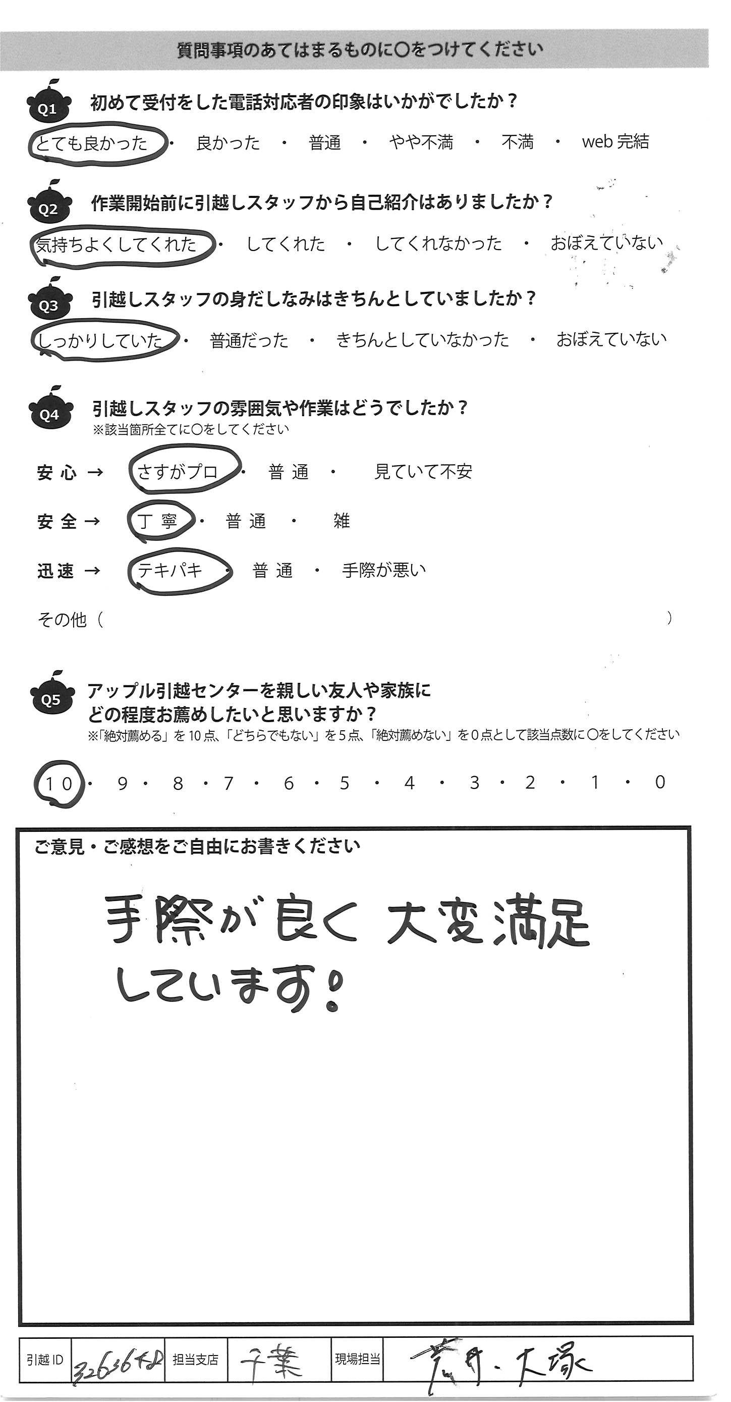 A.見積から当日まではwebで完了する のでとても楽でした。細かい 質問もwebで対応して下さり助かり ました。他業者と比較すると とても安くありがたかったです。 次回もアップルさんで依頼しようと 思います!!