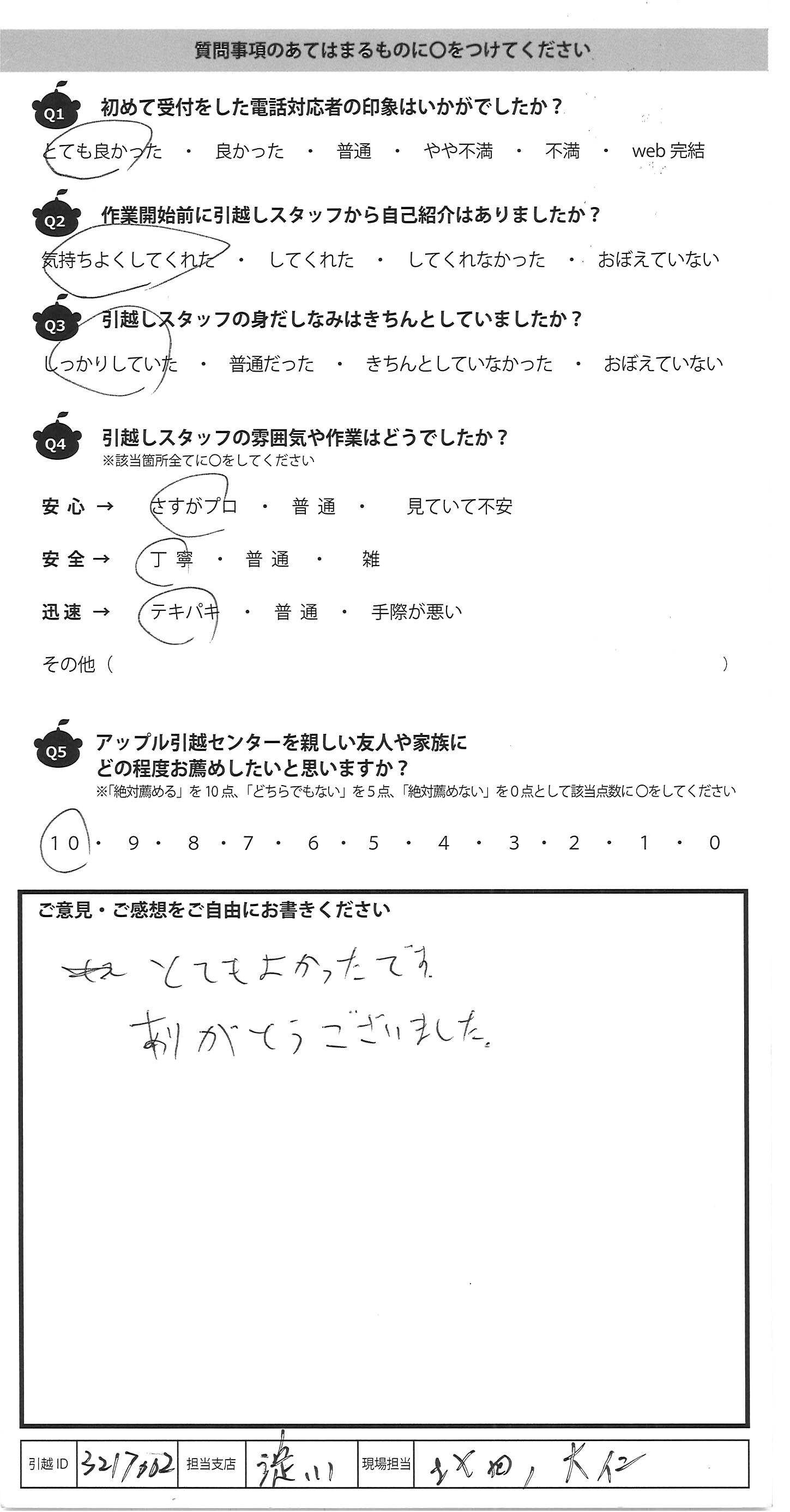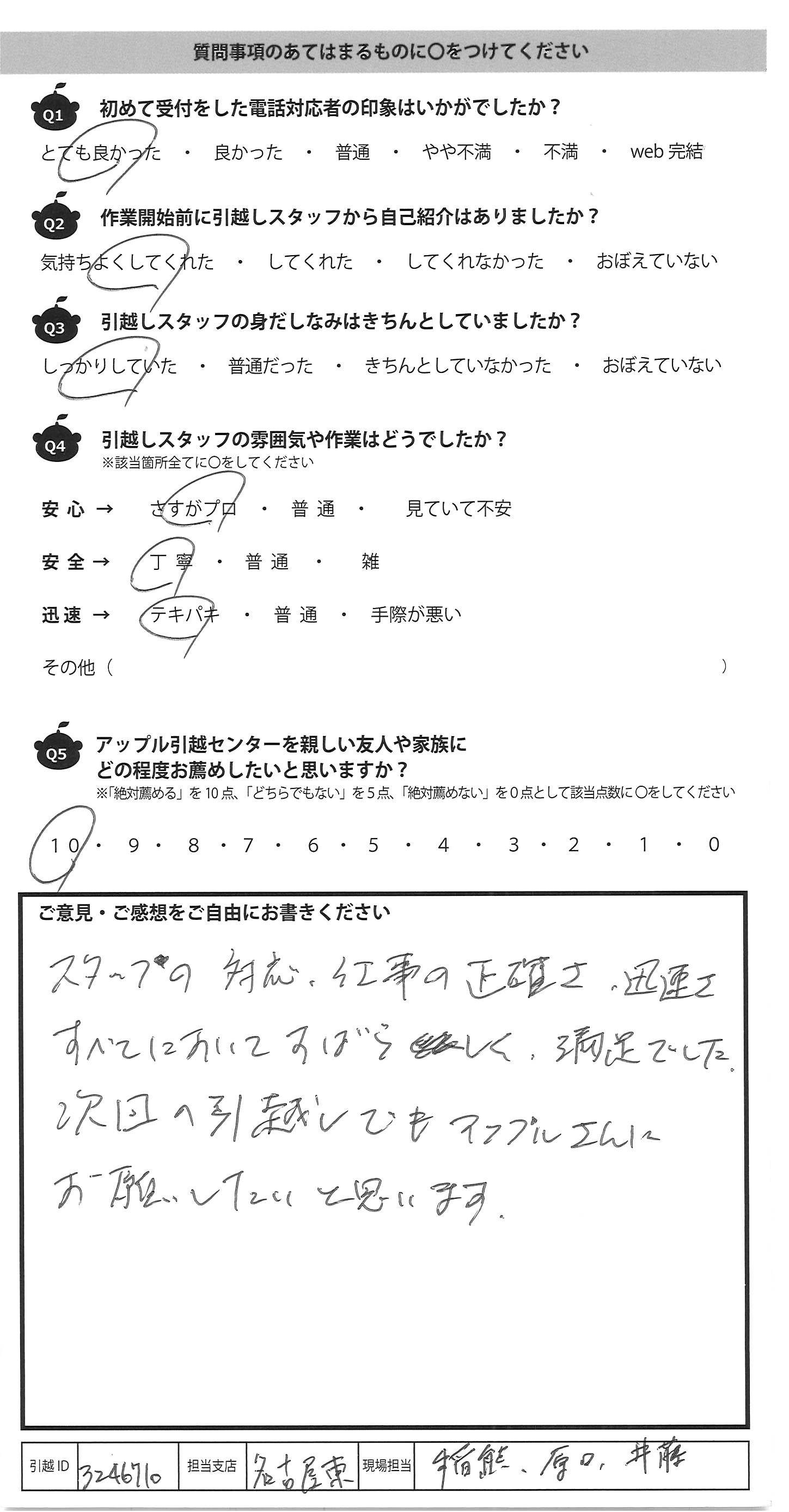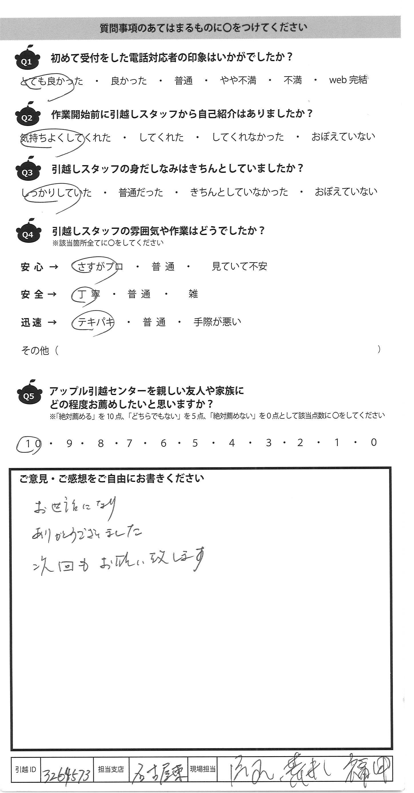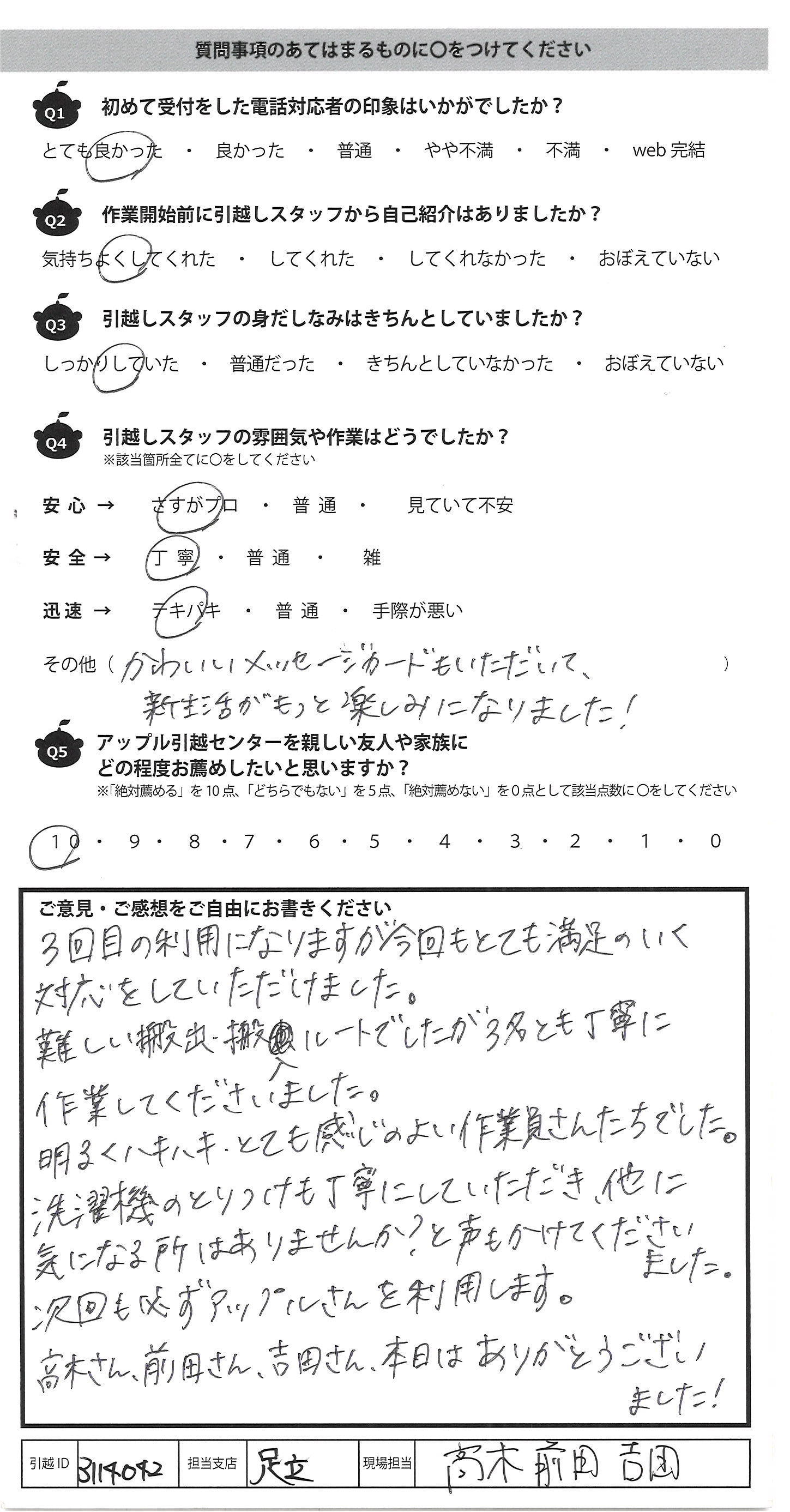 A.スタッフの対応、仕事の正確さ、迅速さ すべてにおいてすばらしく、満足でした。 次回の引越しでもアップルさんに お願いしたいと思います。