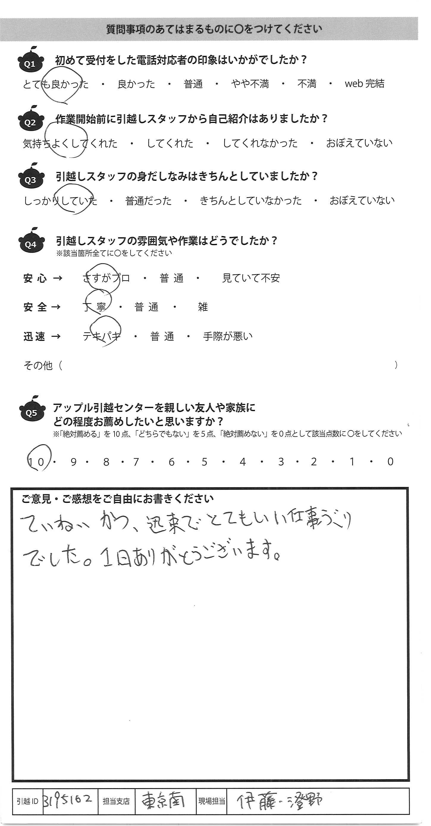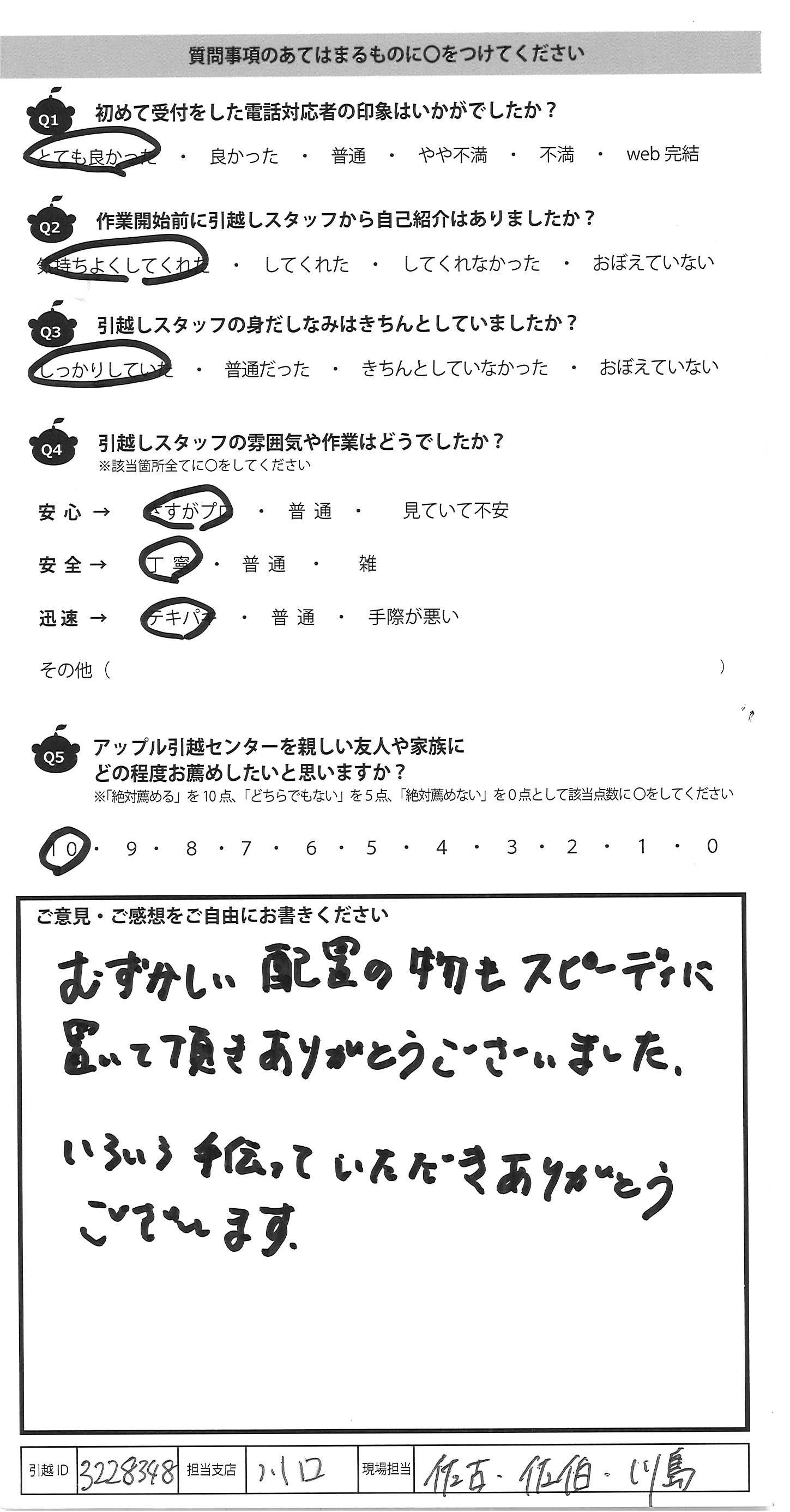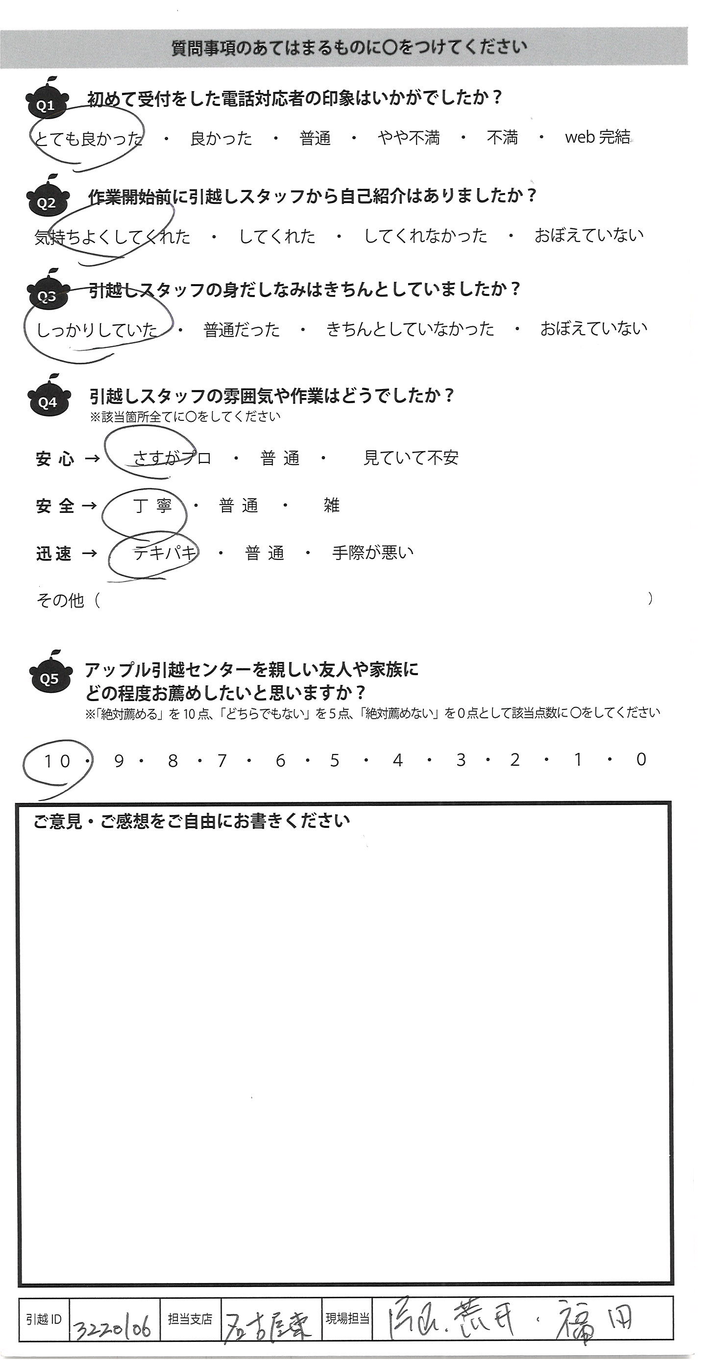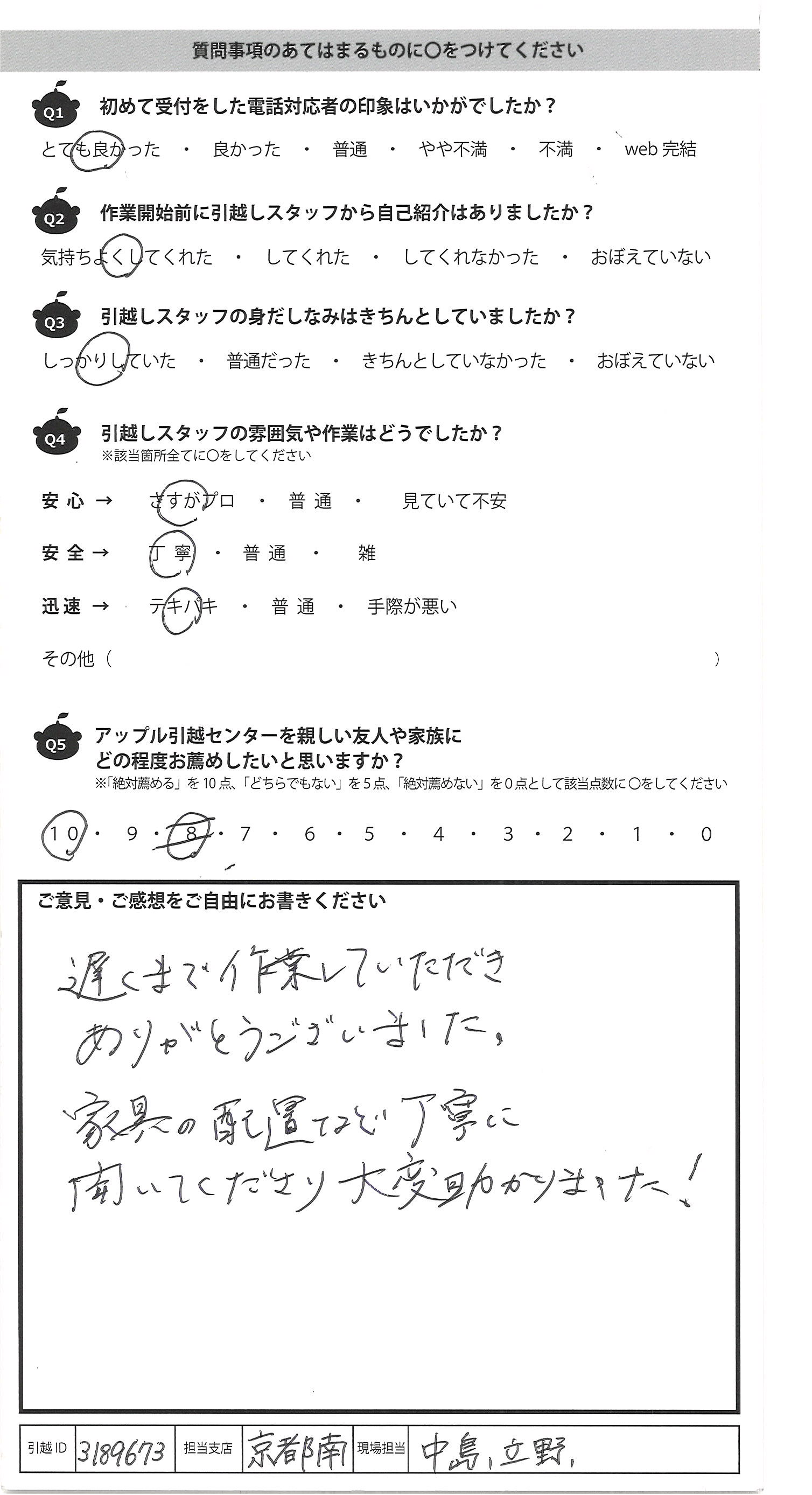 A.スタッフの対応、仕事の正確さ、迅速さ すべてにおいてすばらしく、満足でした。 次回の引越しでもアップルさんに お願いしたいと思います。