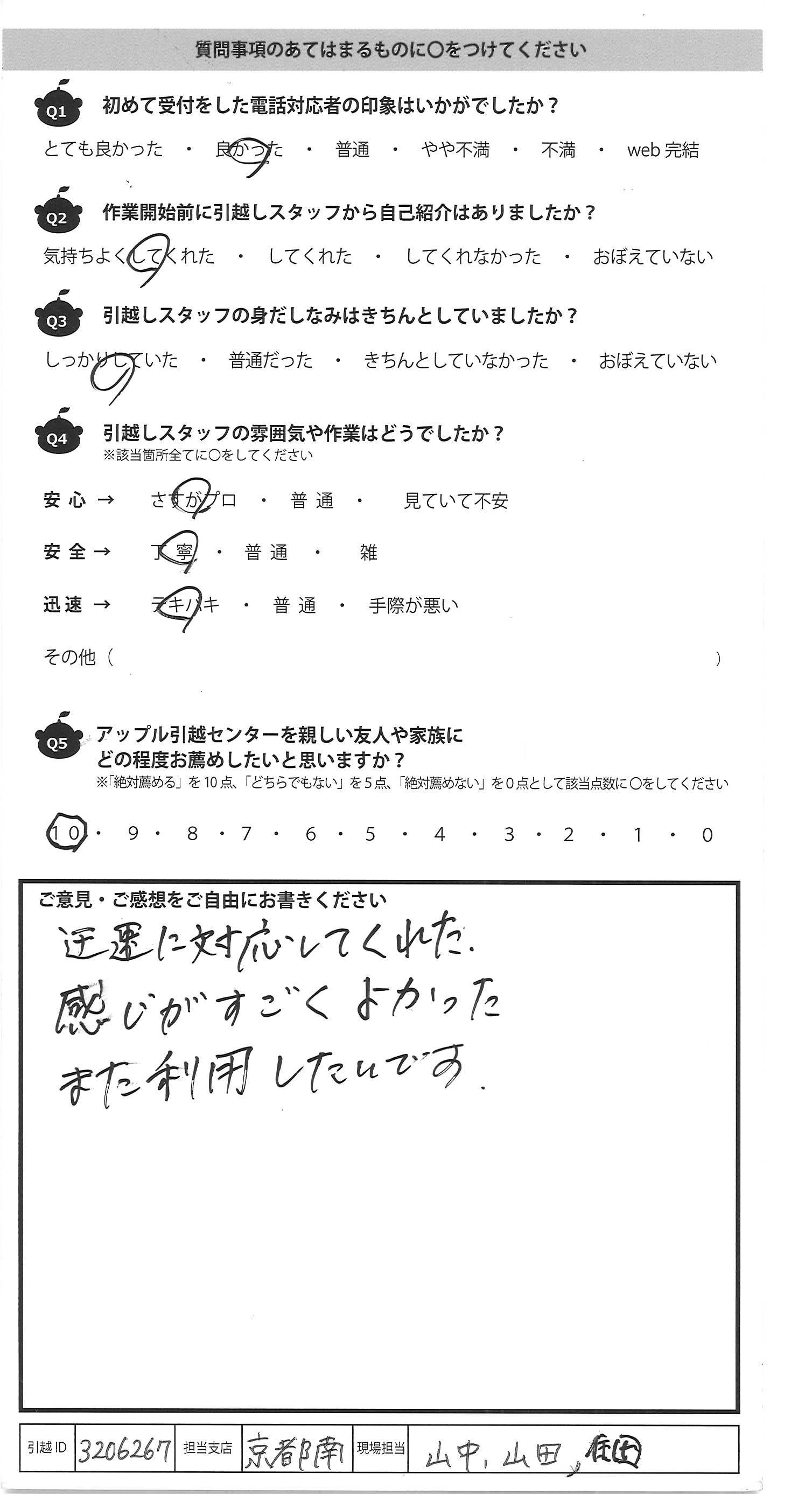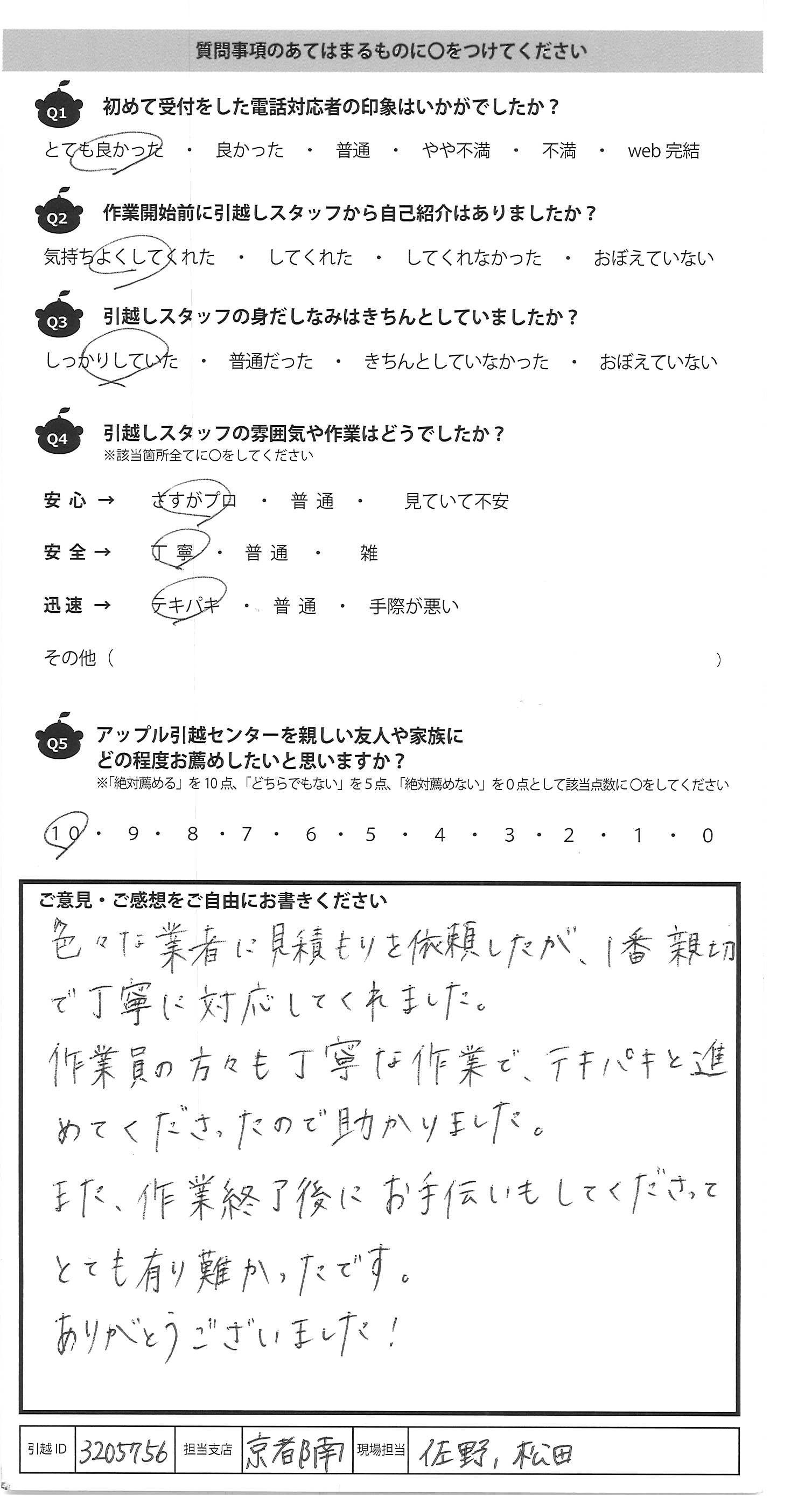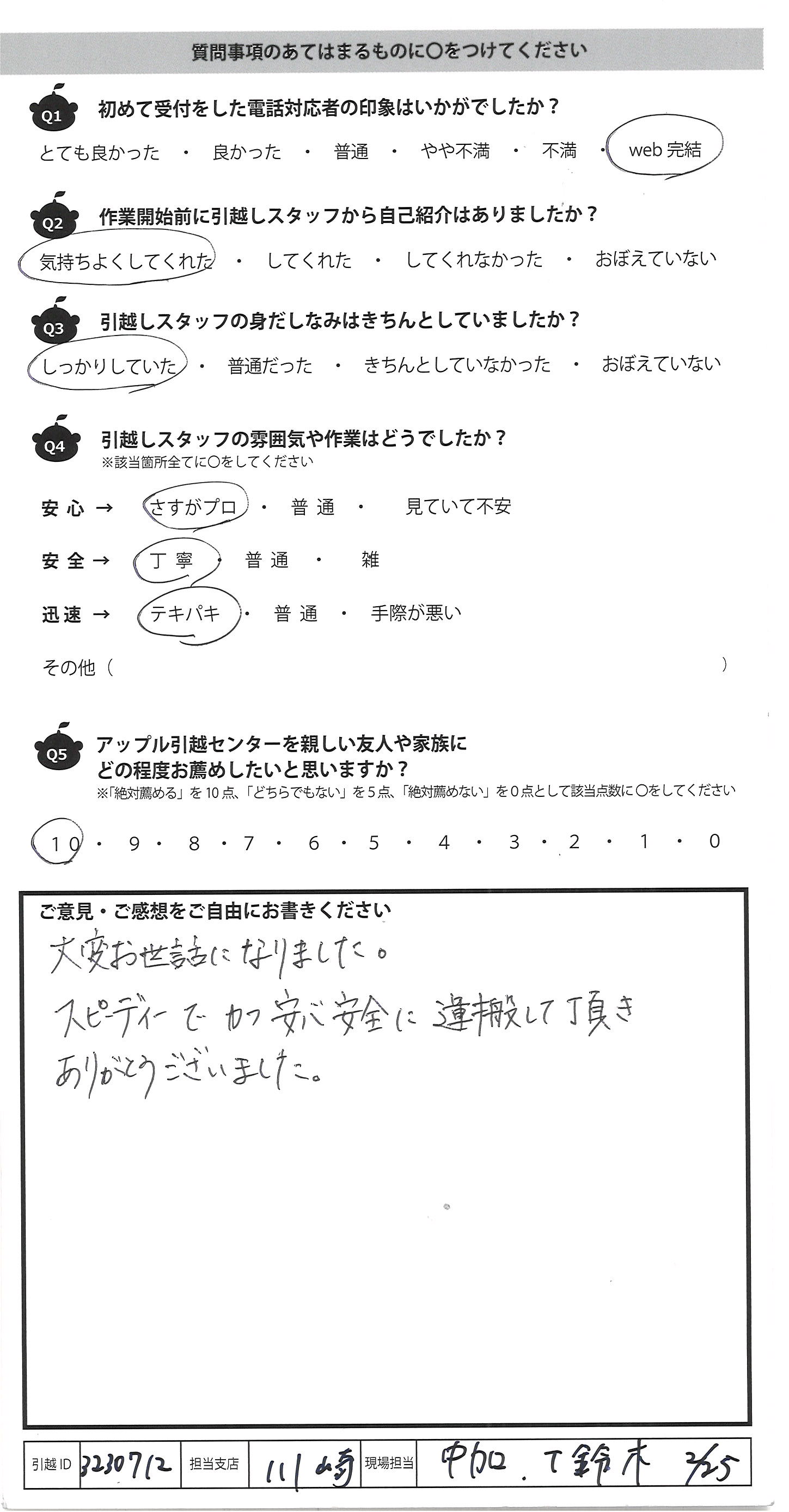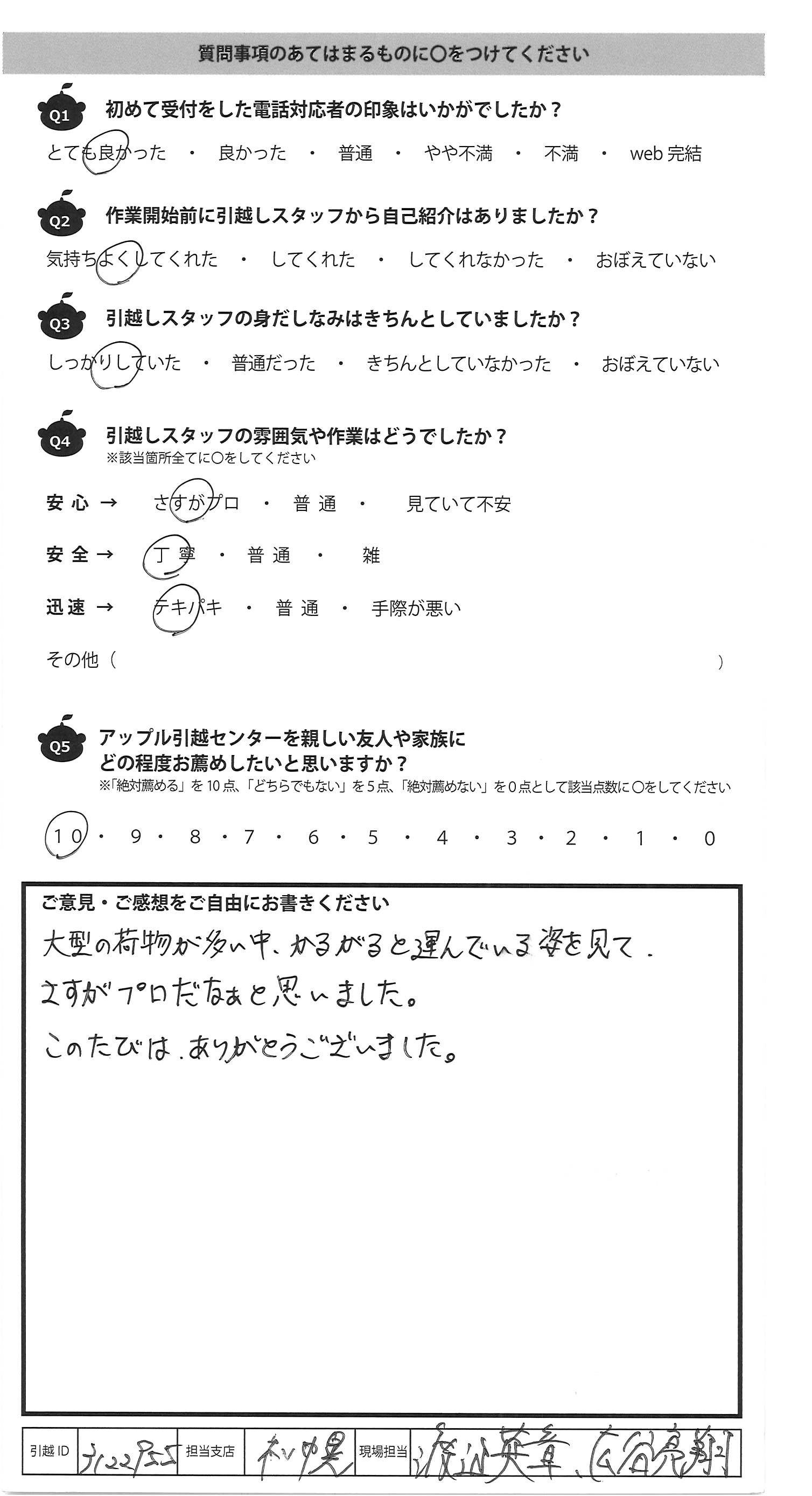A.スタッフの対応、仕事の正確さ、迅速さ すべてにおいてすばらしく、満足でした。 次回の引越しでもアップルさんに お願いしたいと思います。
