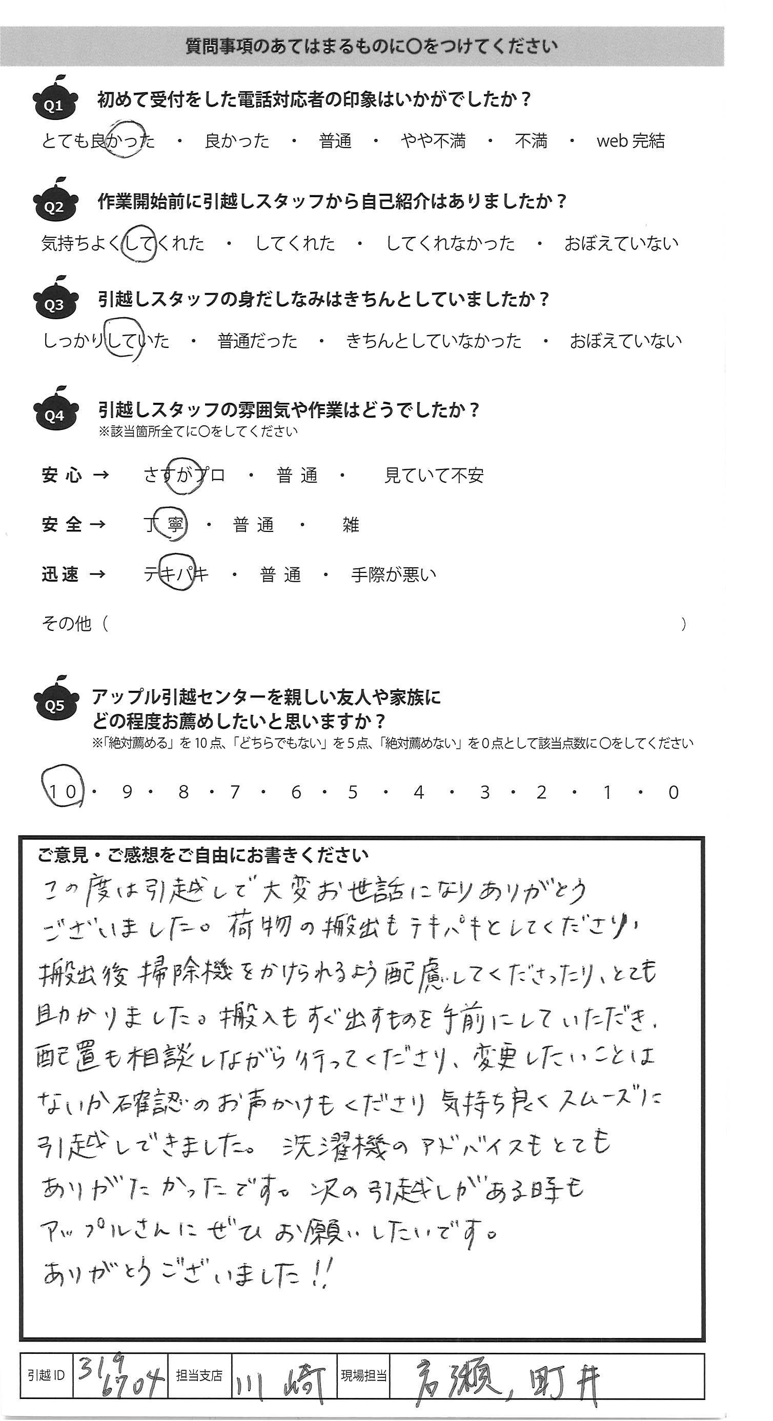 A.この度は引越しで大変お世話になりありがとう ございました。荷物の搬出もテキパキとしてくださり、 搬出後掃除機をかけられるよう配慮してくださったり、とても 助かりました。搬入もすぐ出すものを手前にしていただき、 配置も相談しながら行ってくださり、変更したいことは ないか確認のお声かけもしてくださり気持ち良くスムーズに 引越しできました。洗濯機のアドバイスもとても ありがたかったです。次の引越しがある時も アップルさんにぜひお願いしたいです。 ありがとうございました!!