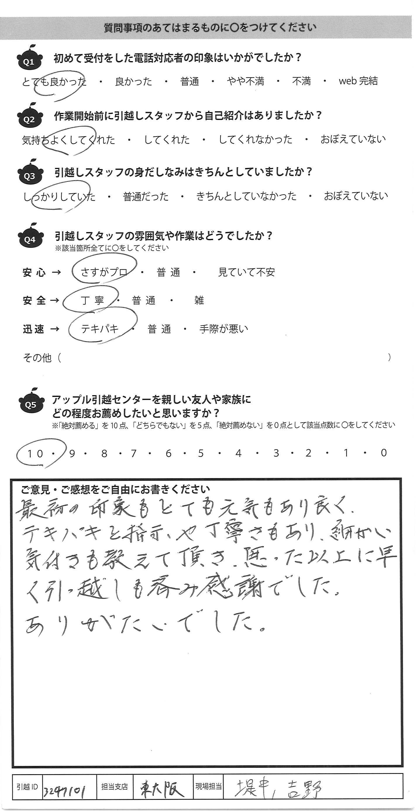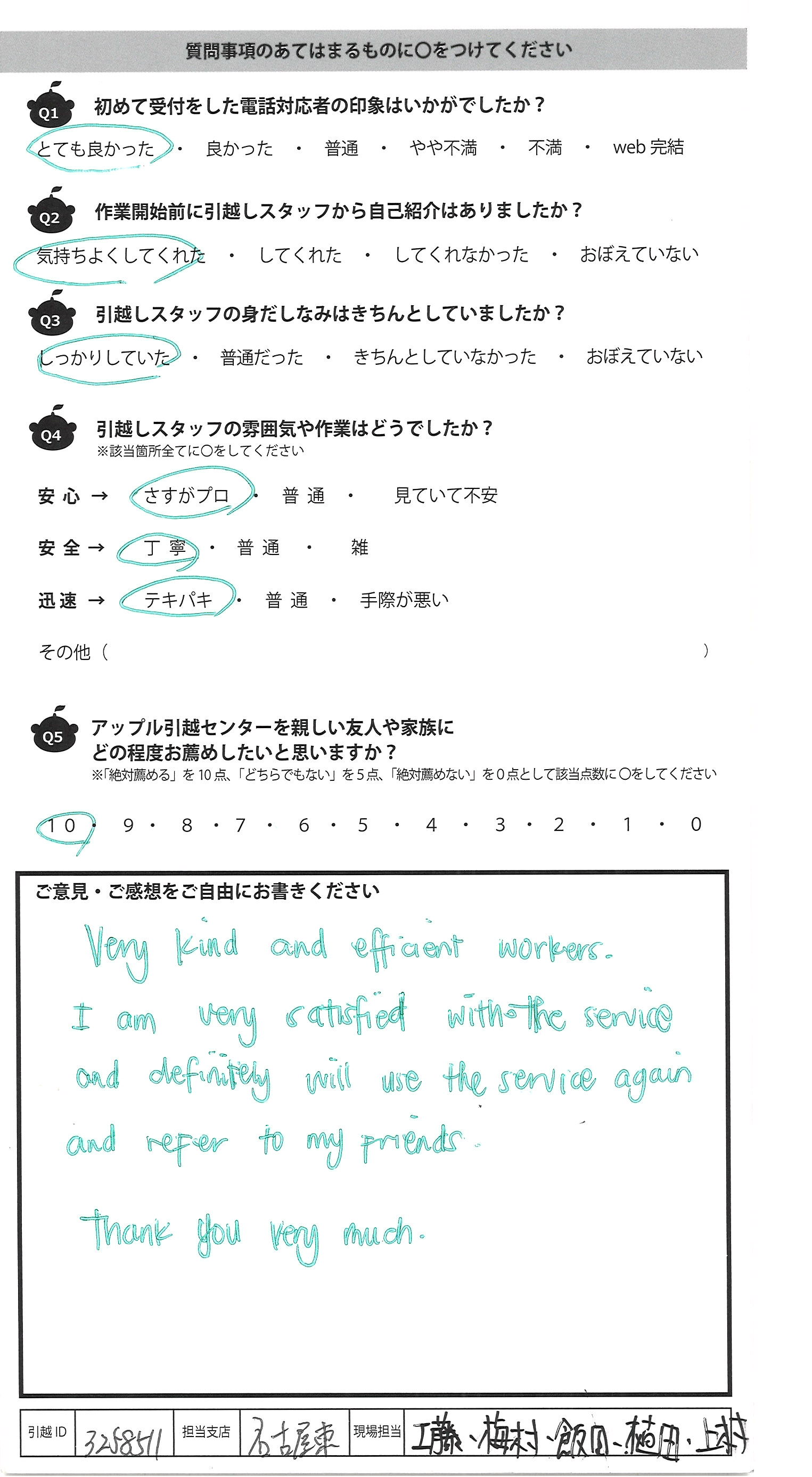 A.最初の印象もとても元気もあり良く、 テキパキと指示や丁寧さもあり、細かい 気付きも教えて頂き、思った以上に早 く引っ越しも済み感謝でした。 ありがとうございました。