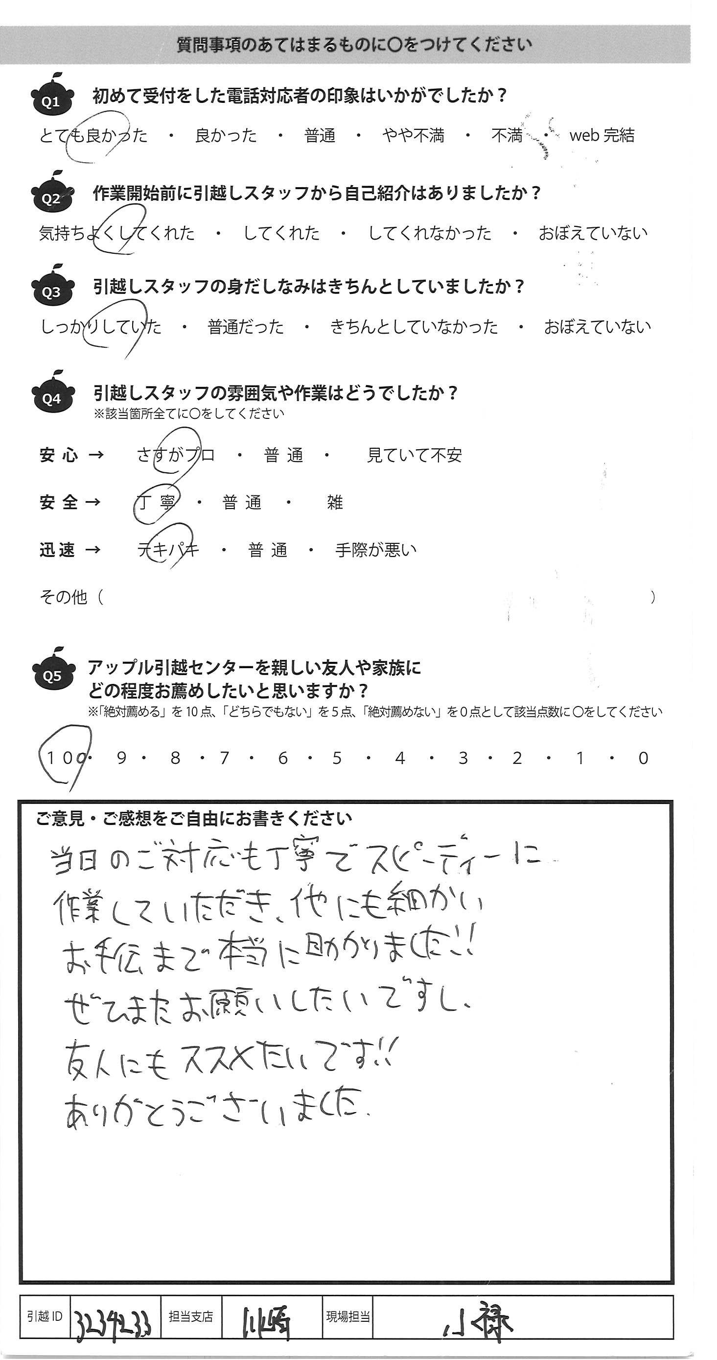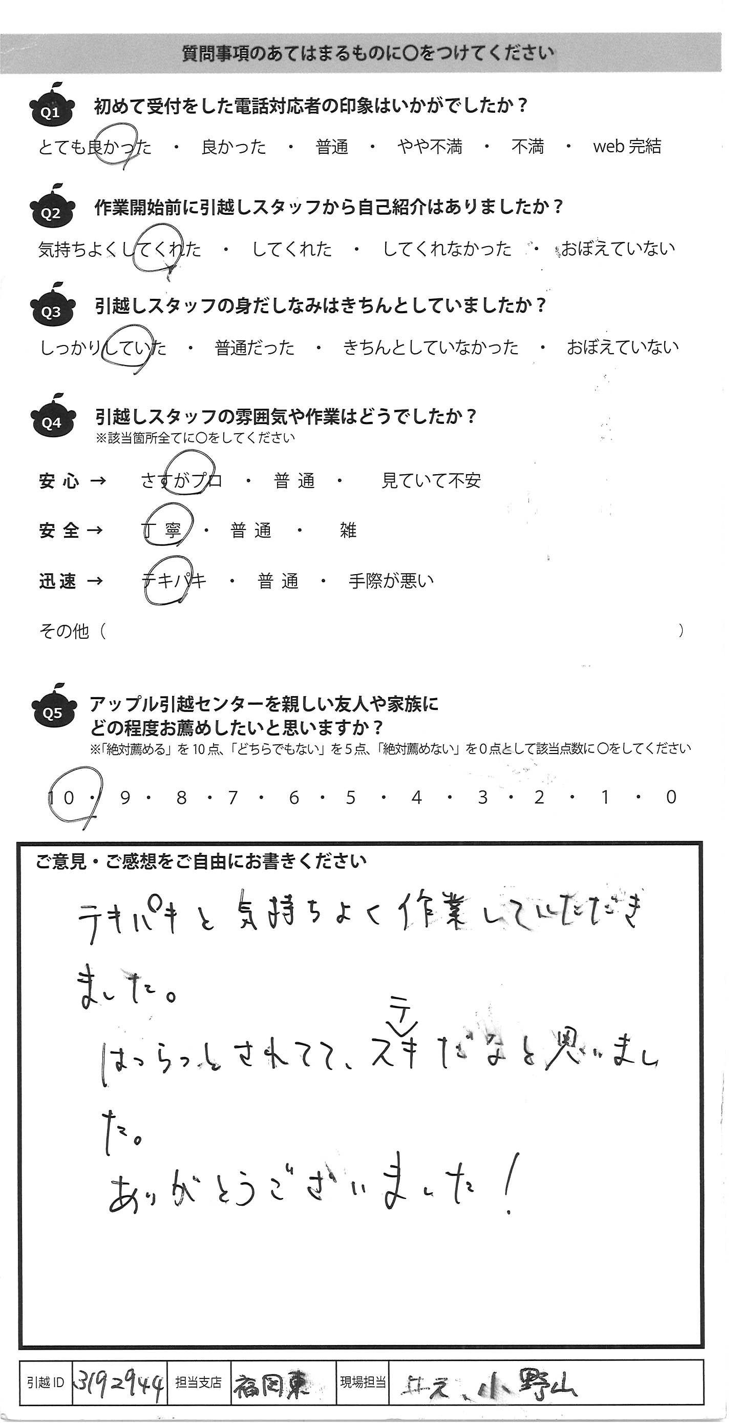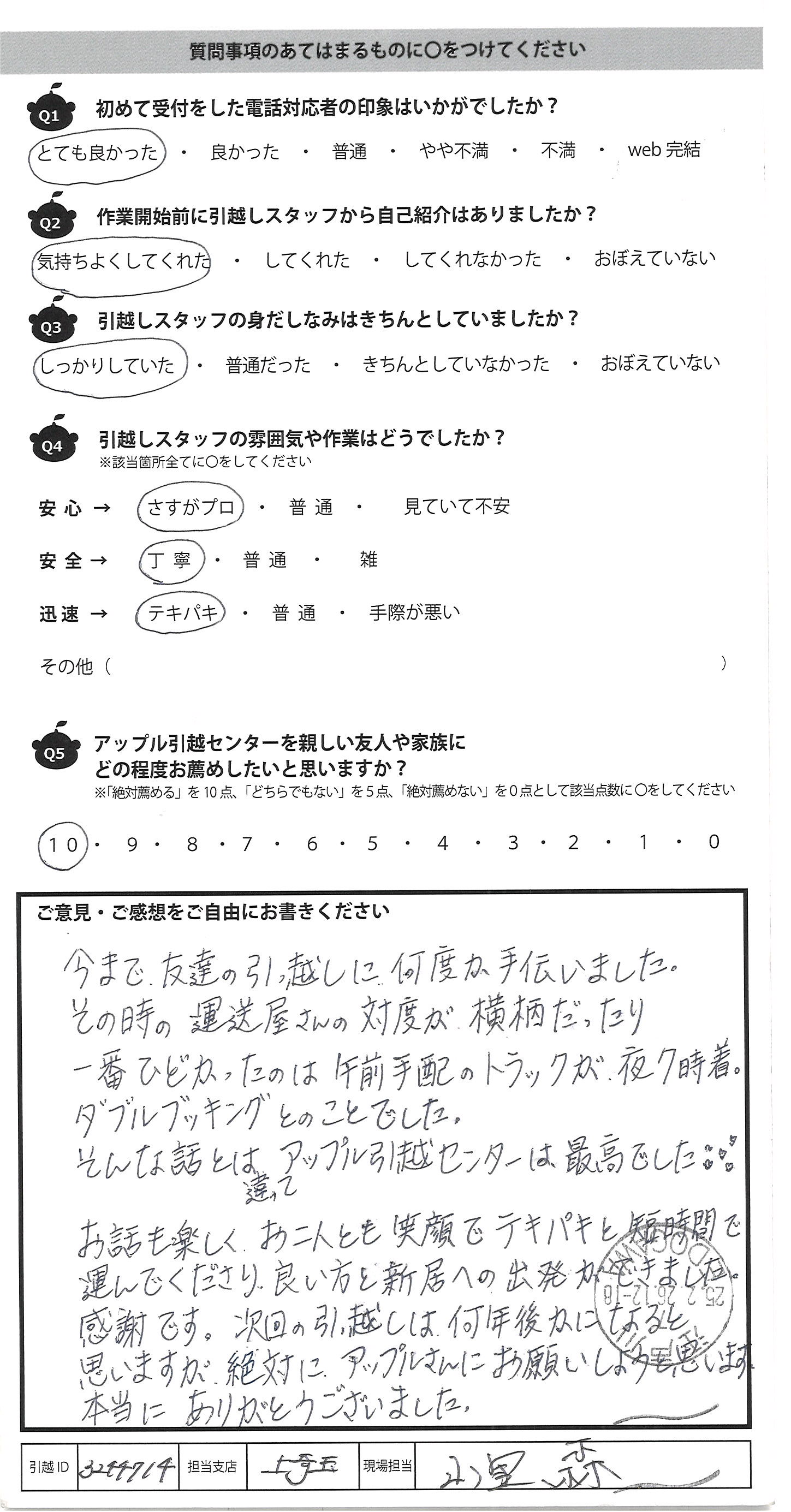 A.テキパキと動いて下さり、引っ越しがはやく 終わり、とても助かりました。 対応がとても丁寧で、安心して引っ越しが できました。ありがとうございました。