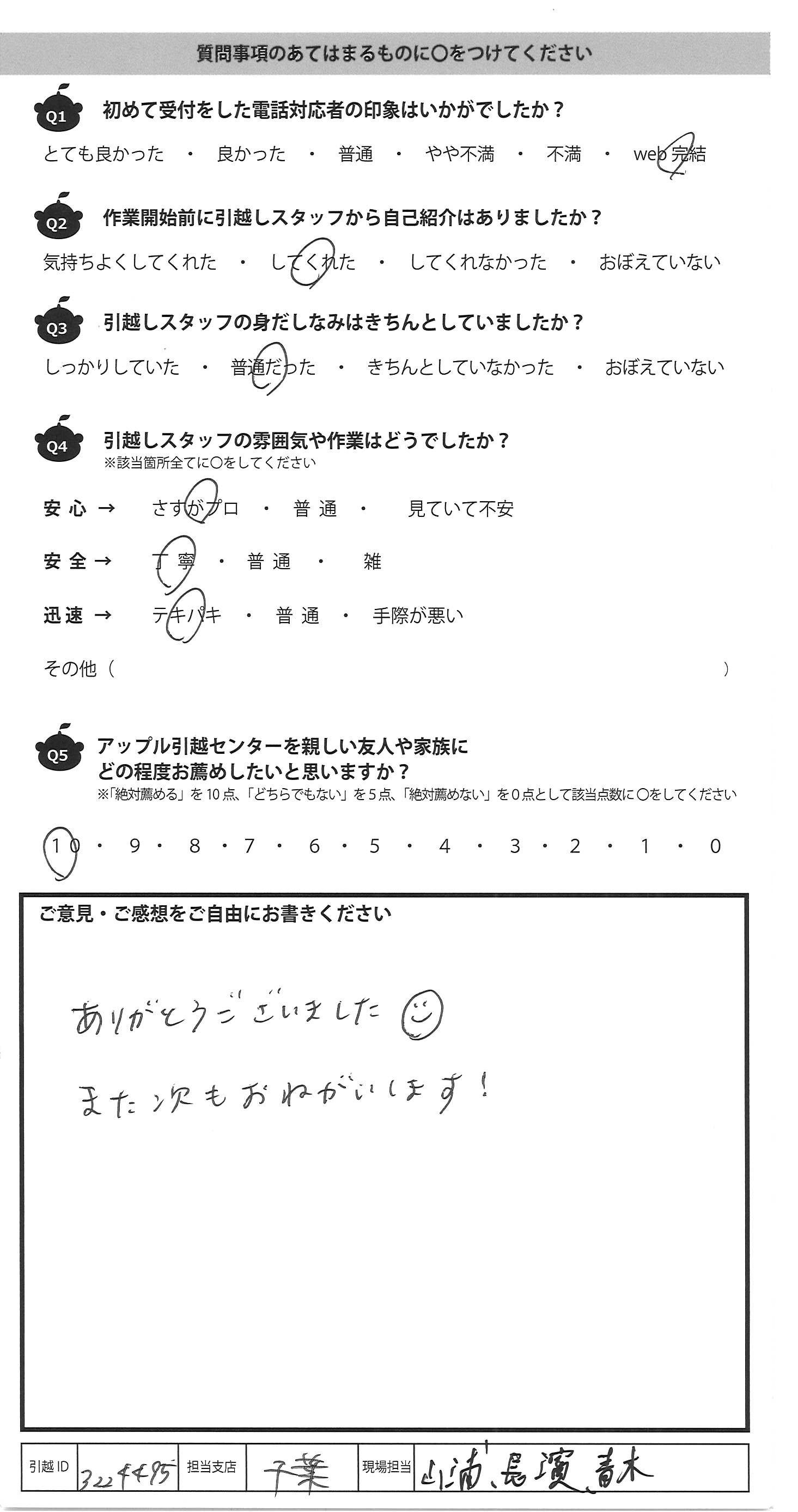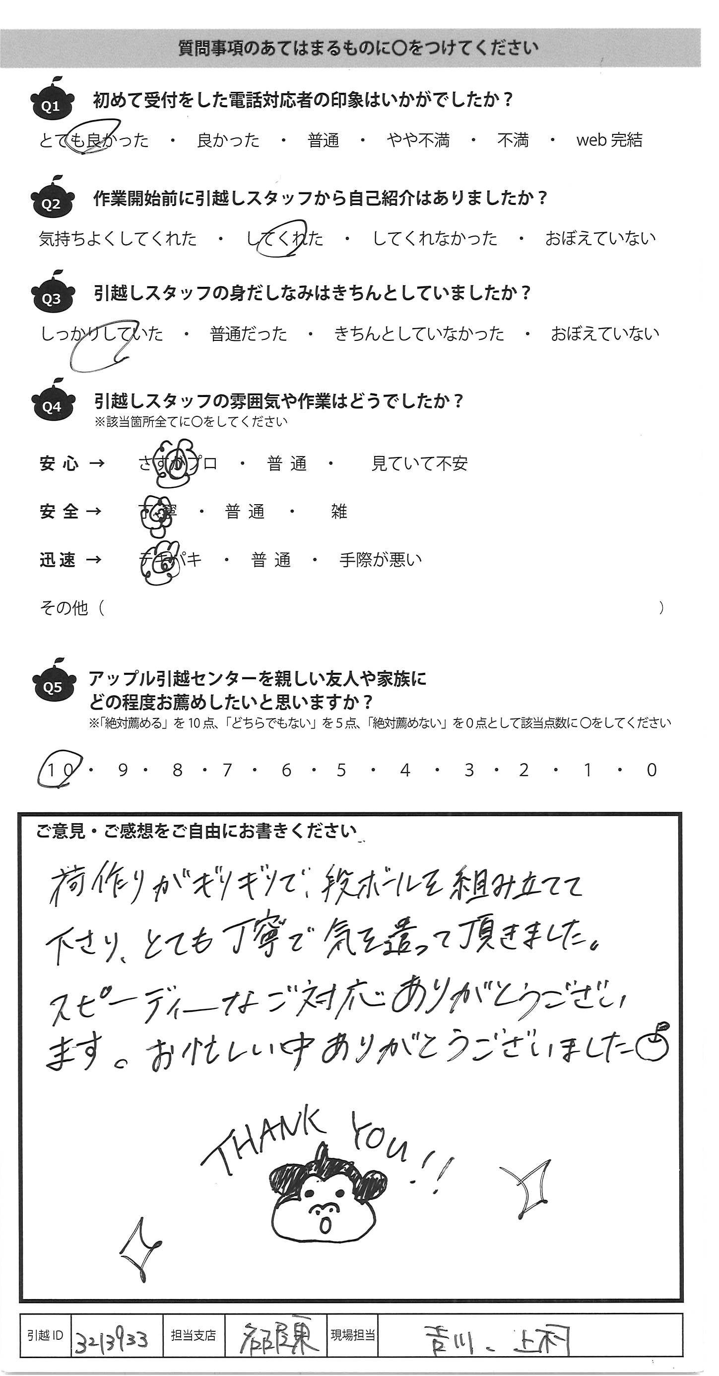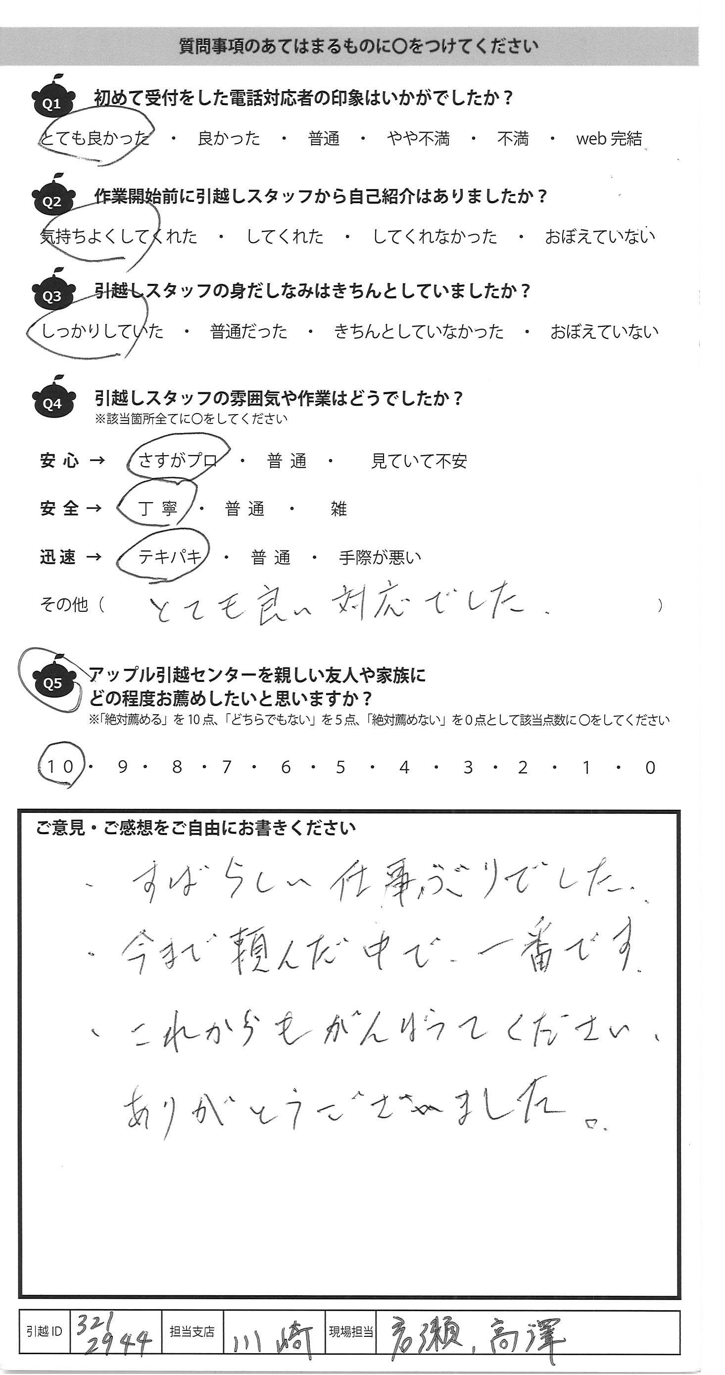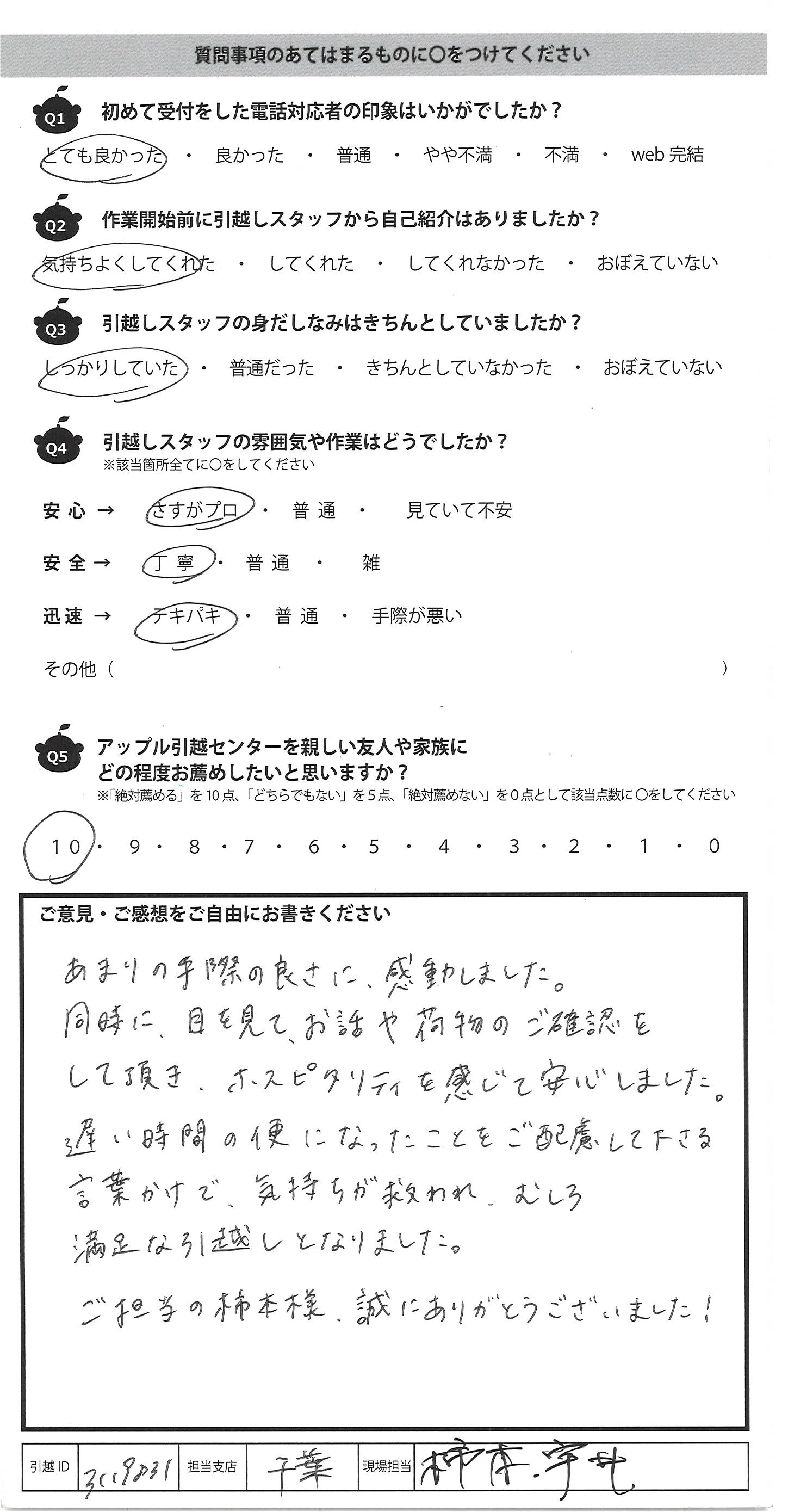 A.テキパキと動いて下さり、引っ越しがはやく 終わり、とても助かりました。 対応がとても丁寧で、安心して引っ越しが できました。ありがとうございました。