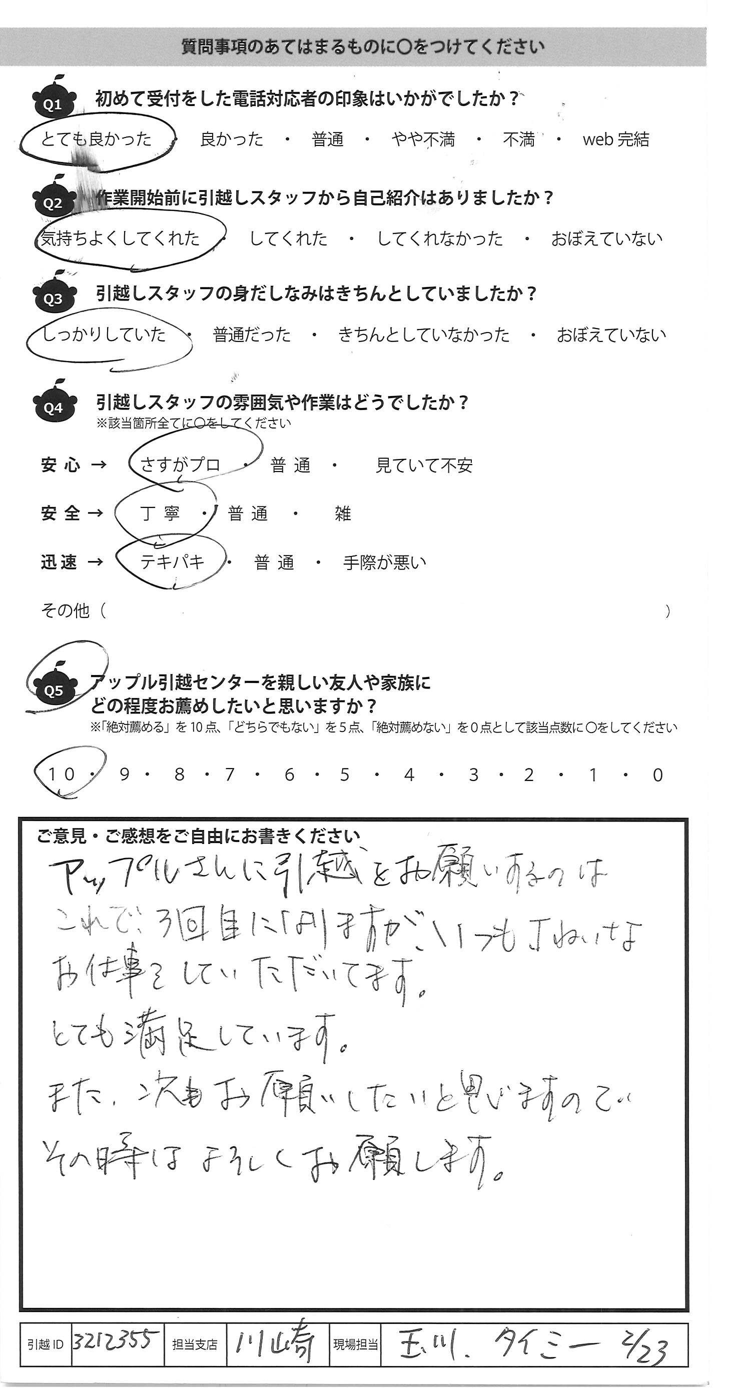 A.アップルさんに引越をお願いするのは これで3回目になりますが、いつも丁ねいな お仕事をしていただいてます。 とても満足しています。 また、次もお願いしたいと思いますので その時はよろしくお願いします。