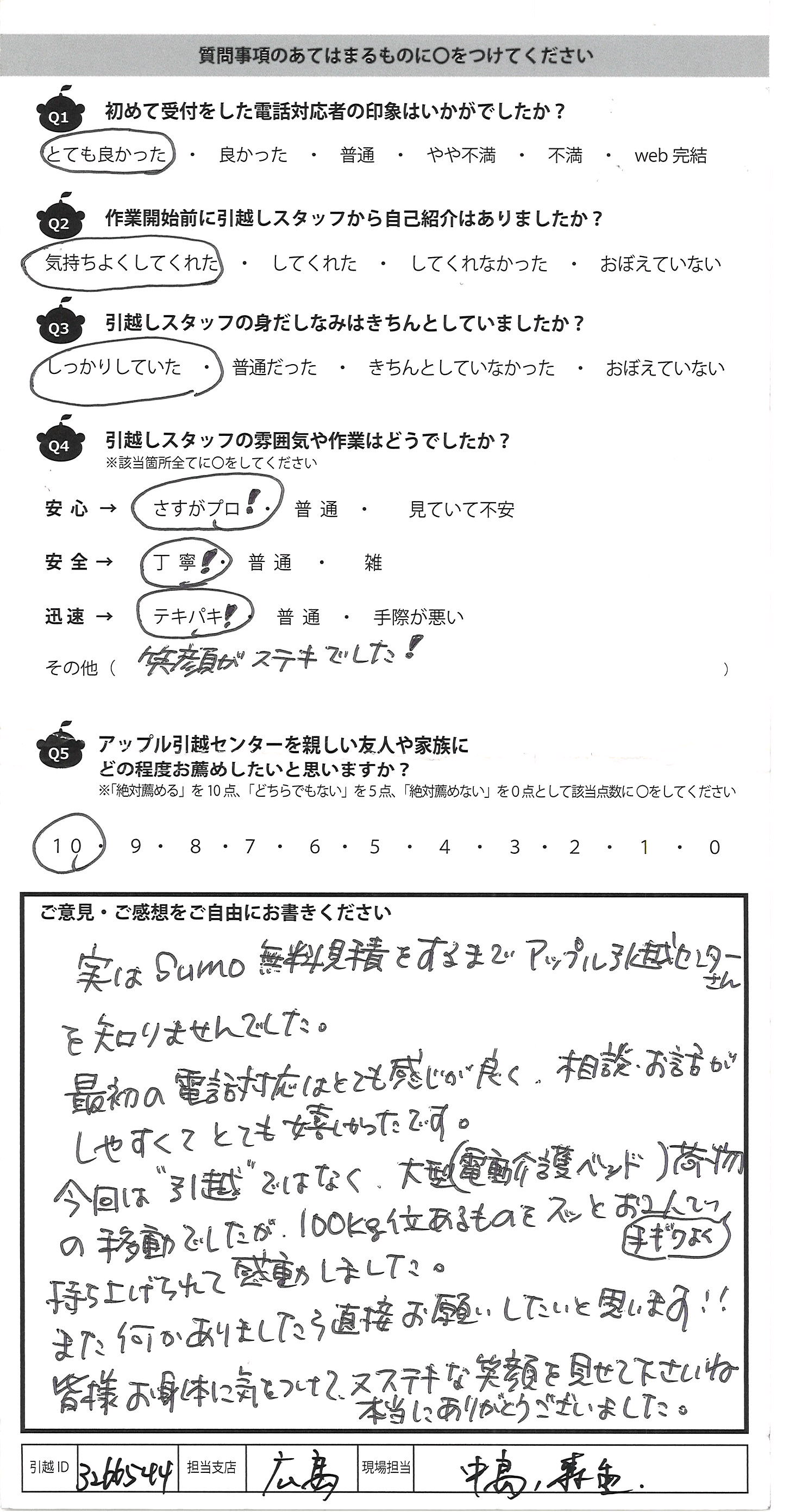 A.実はSUMO無料見積をするまでアップル引越センターさん を知りませんでした。 最初の電話対応はとても感じが良く、相談、お話が しやすくてとても嬉しかったです。 今回は引越ではなく、大型(電動介護ベッド)荷物 の移動でしたが、100㎏位あるのをスッとお2人で手ギワよく 持ち上げられて感動しました。 また何かありましたら直接お願いしたいと思います!! 皆様お身体に気をつけて、ステキな笑顔を見せて下さいね 本当にありがとうございました。