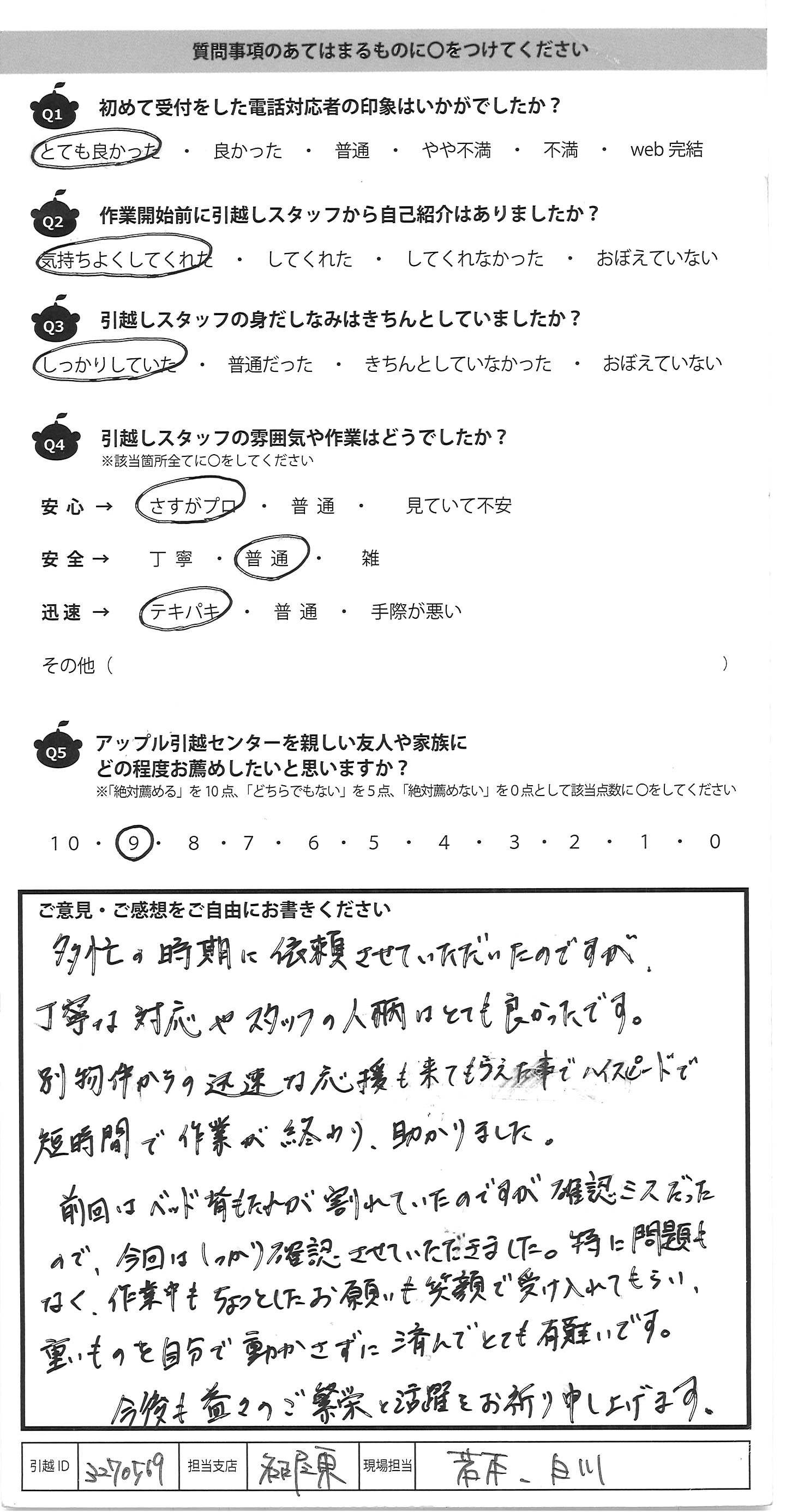 A.小野寺さんの指示でとてもスムーズに作業されていました。 細かい気遣いも感じられました。 ありがとうございました。 梱包がギリギリになって本当にすみませんでした。