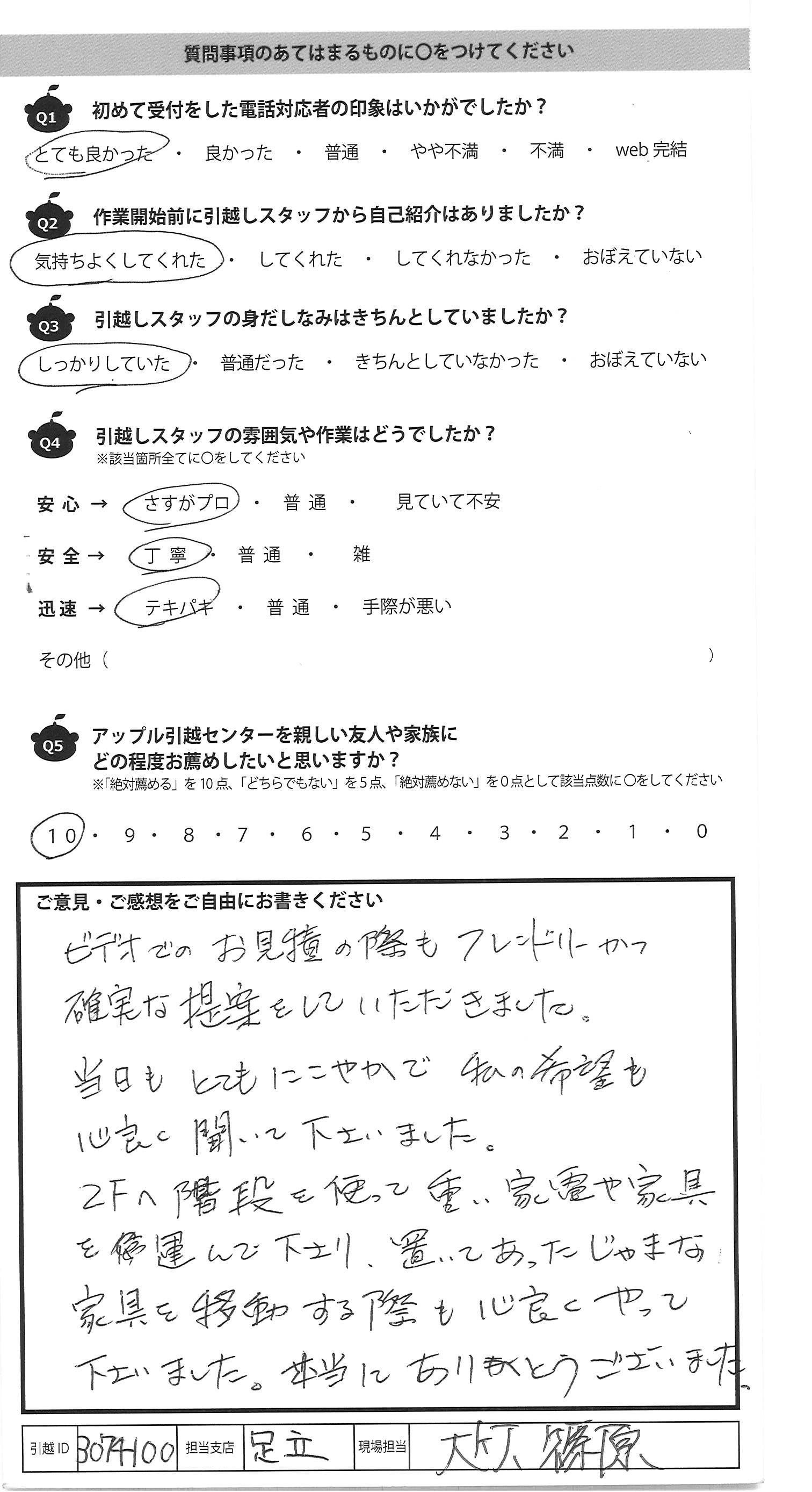 A.リーダー工藤さんの挨拶から、 現場の把握、そしてこちら側の説明も しっかりヒアリングしていただき、 圧倒的なプロの引越のスピードに感心しながら、 詰め込みまで1時間、移動に1時間(市内→市内) 運び込みに1時間。プロの仕事で感動しました。 また、詰め込み時や、運び込みにヘルプが参加しての チームワームが素晴らしかった。 目的と目標設定が明快なのでしょう。ありがとう!!