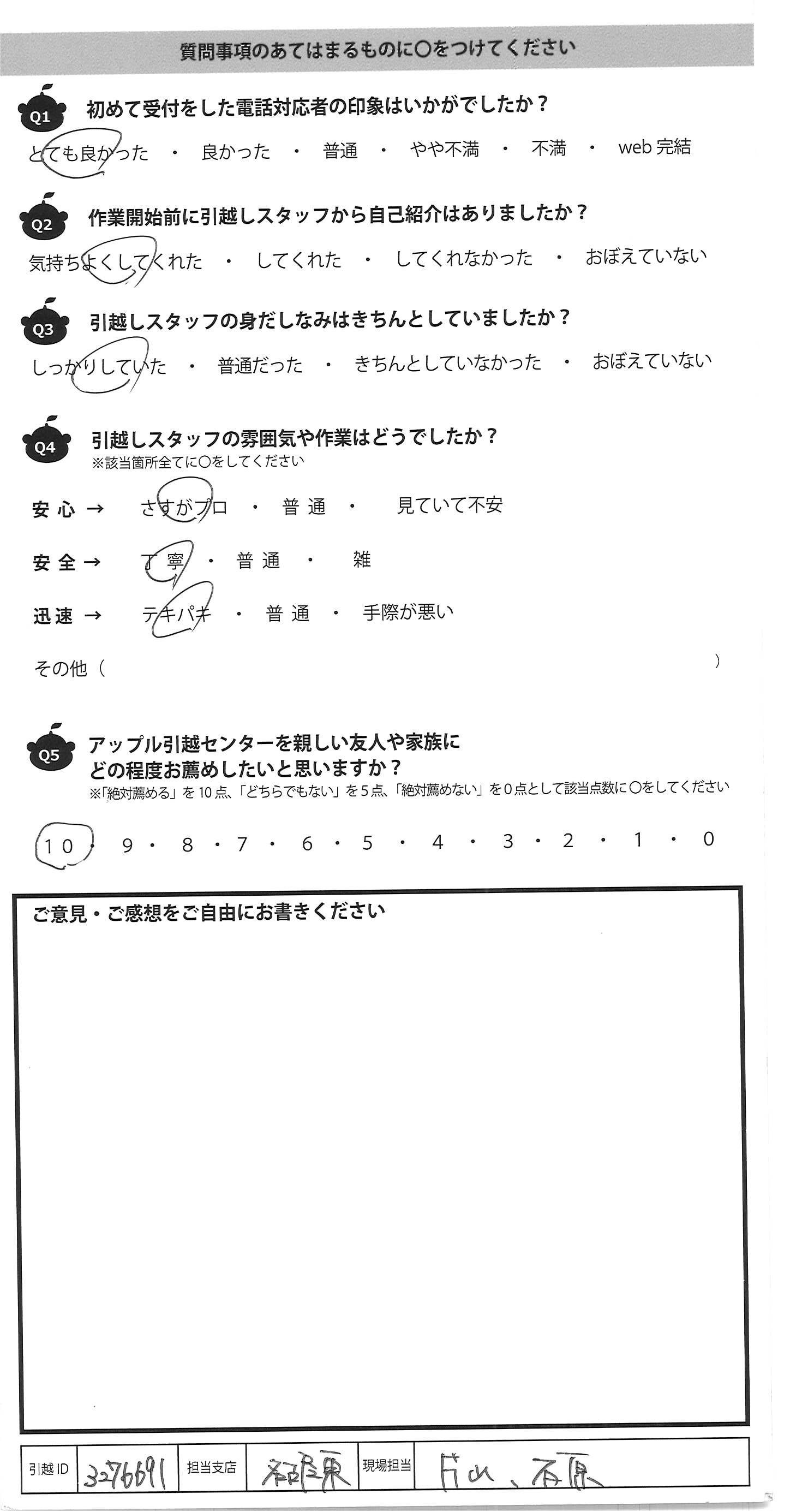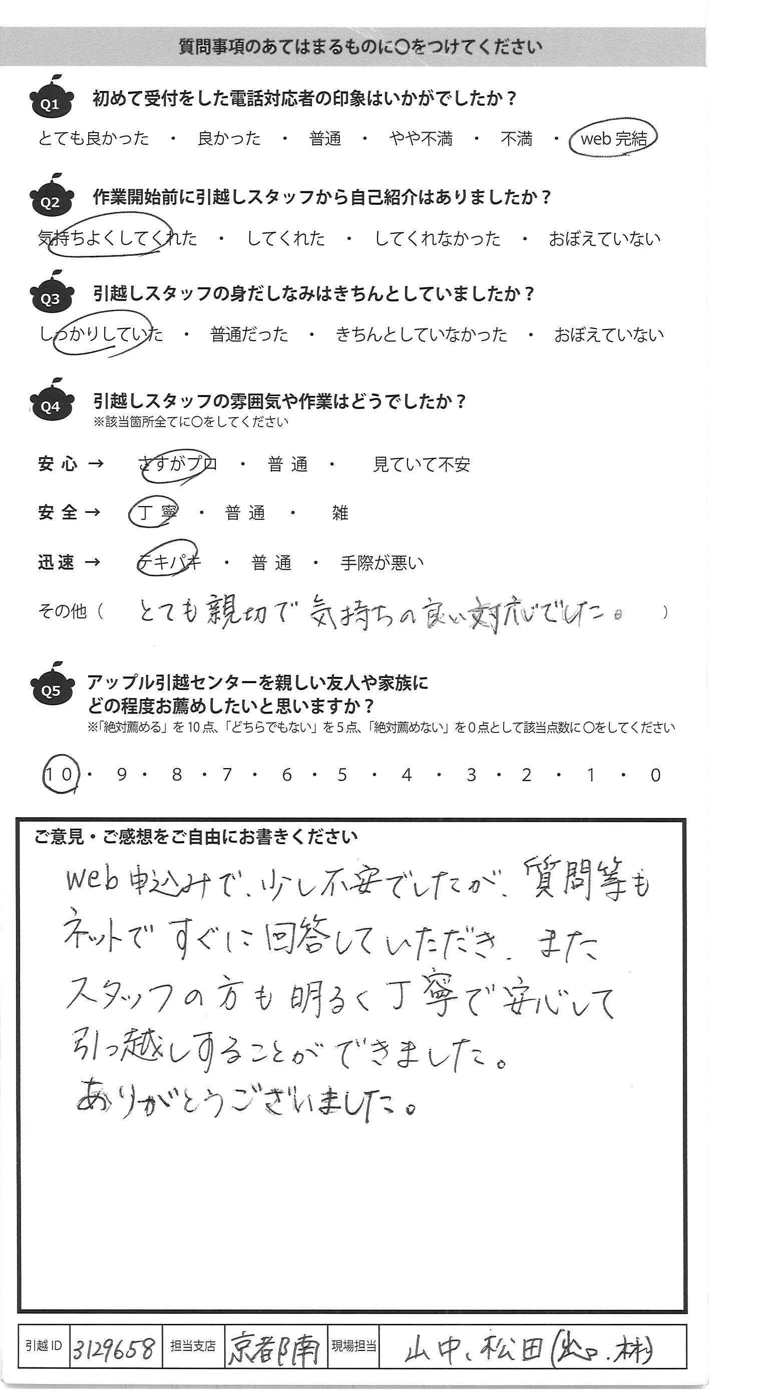 A.web申込みで、少し不安でしたが、質問等も ネットですぐに回答していただき、また スタッフの方も明るく丁寧で安心して 引っ越しすることができました。 ありがとうございました。