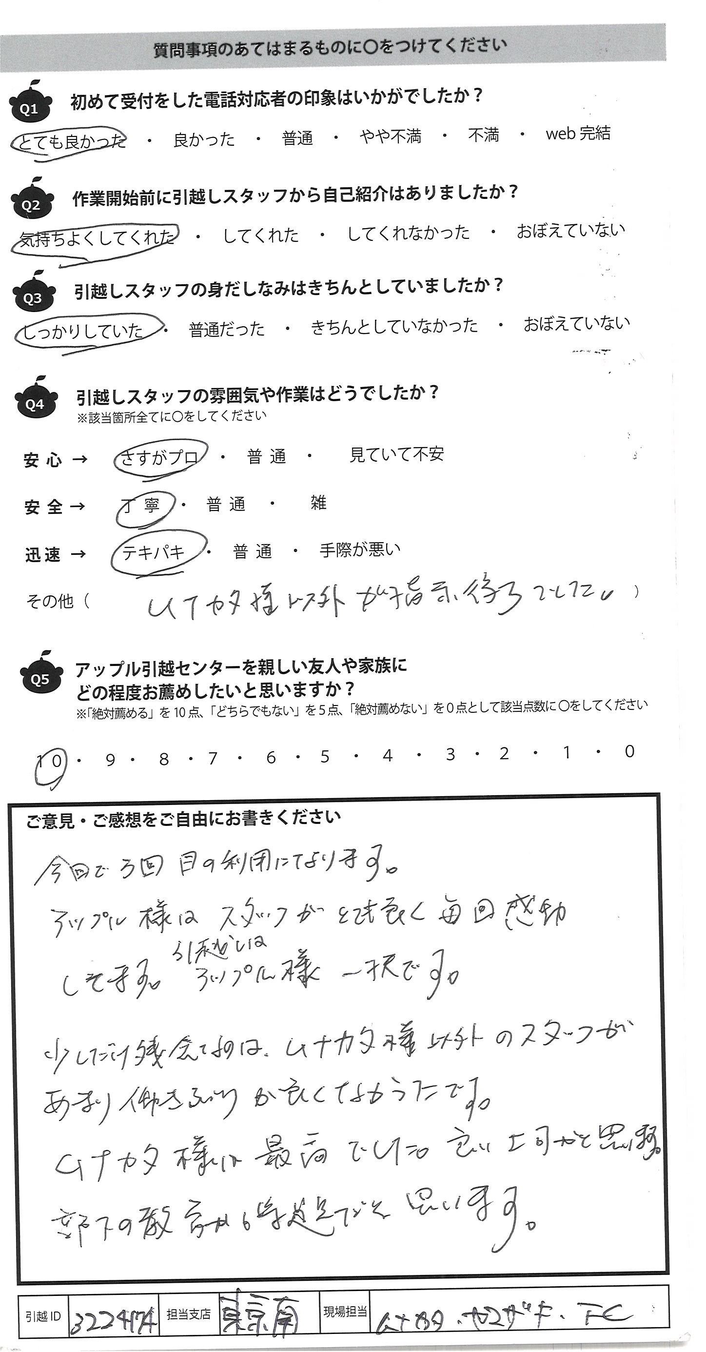 A.今回で3回目の利用になります。 アップル様はスタッフがとても良く毎回感動 してます。引越しはアップル様一択です。 少しだけ残念なのは、ムナカタ様以外のスタッフが あまり働きぶりが良くなかったです。 ムナカタ様は最高でした。良い上司かと思います。 部下の教育が だと思います。