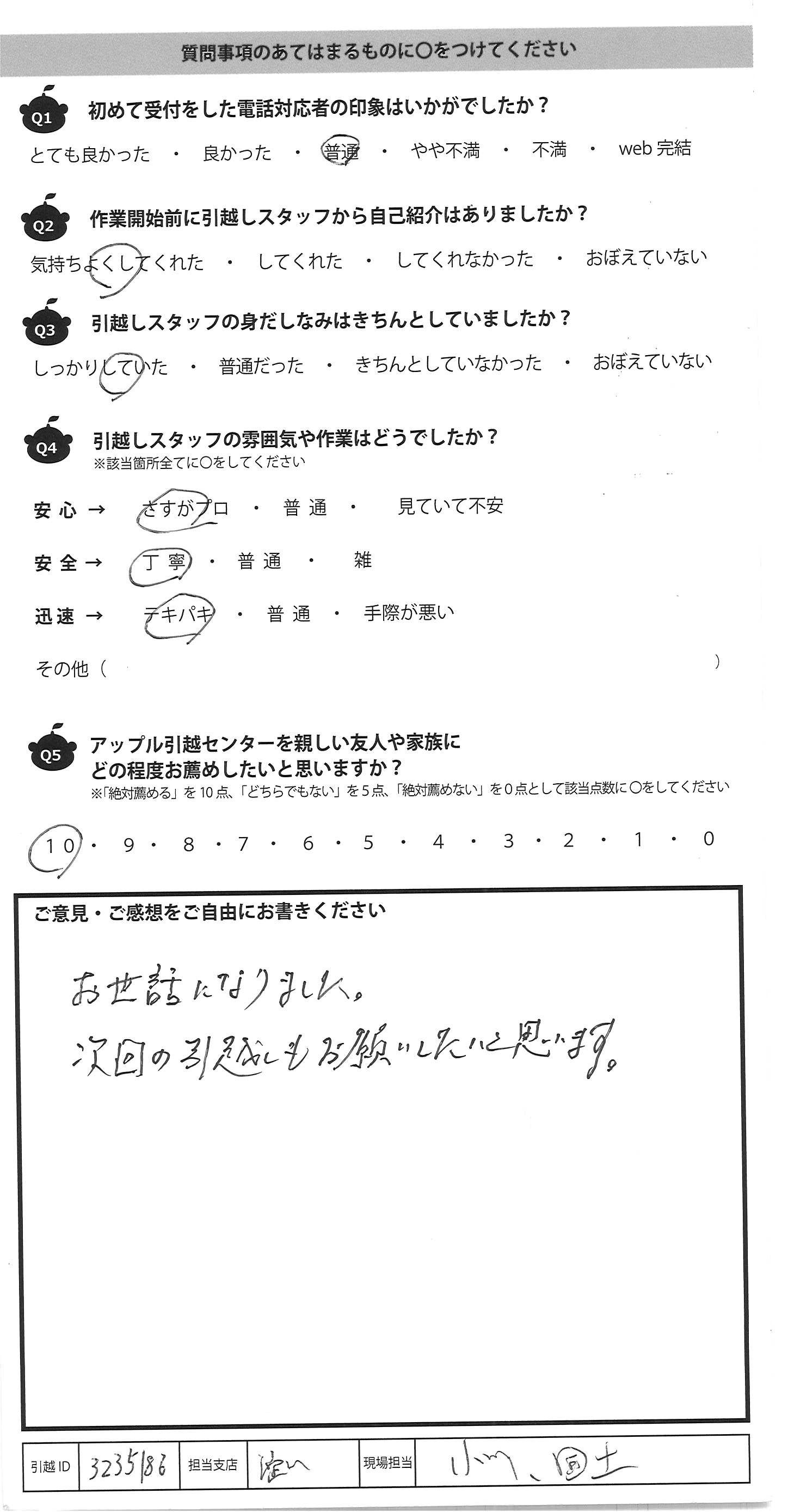 A.お世話になりました。 次回の引越しもお願いしたいと思います。