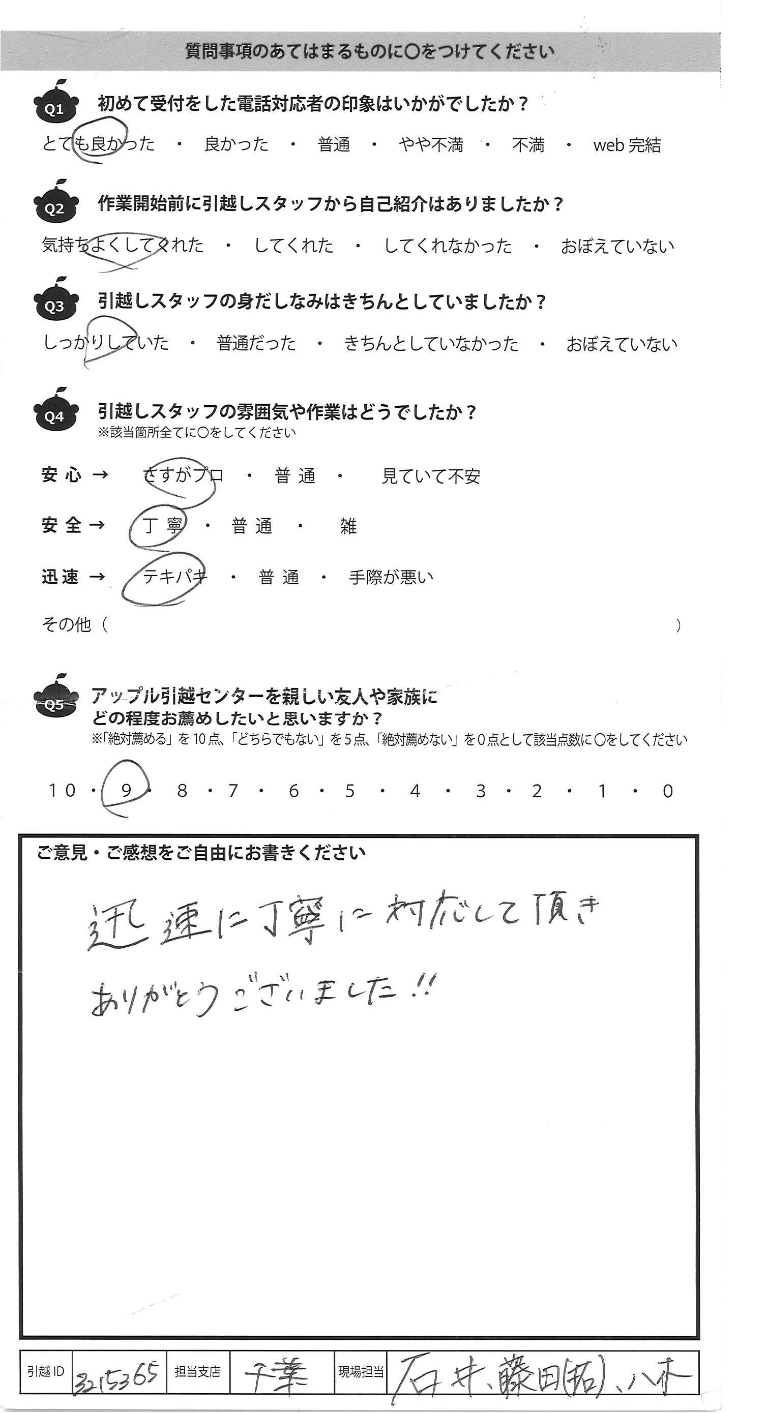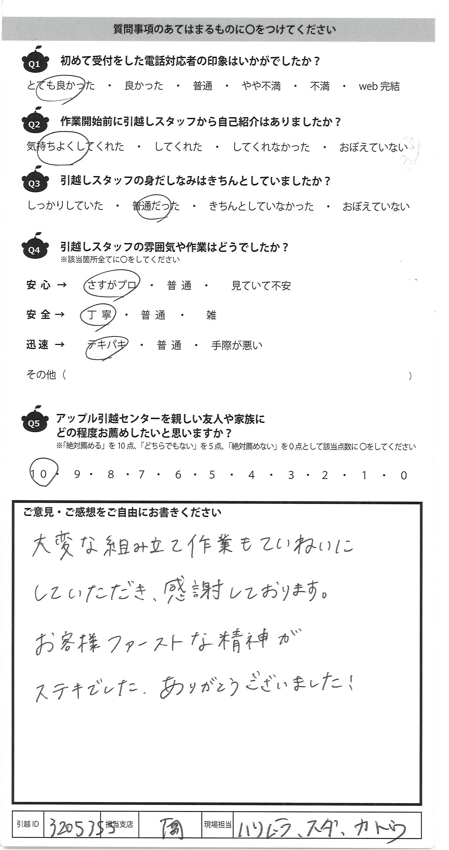 A.遅い時間からのスタートでしたが 作業スピードも早く、現地ではスタッフ様の 増員もありスムーズに引越を終える事が でき大変感謝しております この度は大変お世話になり ありがとうございました