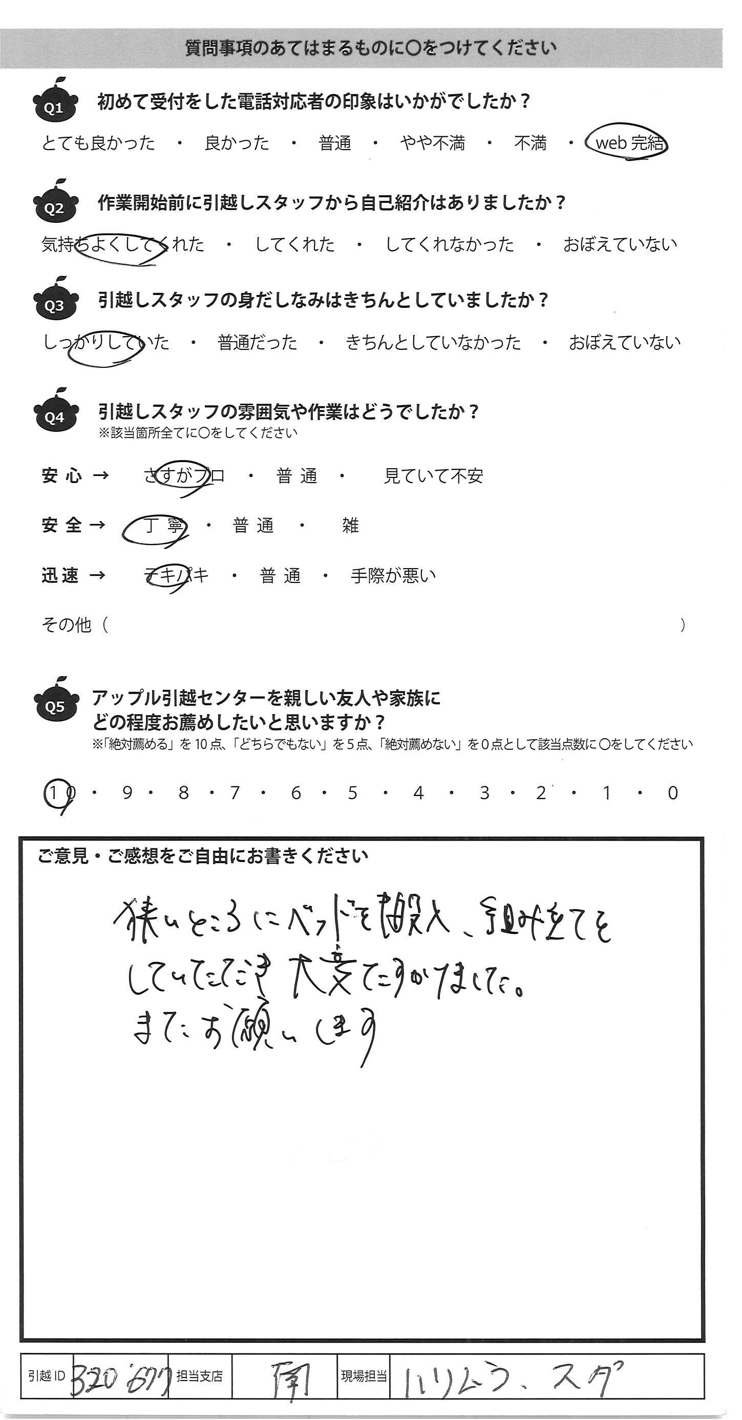A.狭いところにベッドを搬入、組み立てを していただき大変たすかりました。 またお願いします