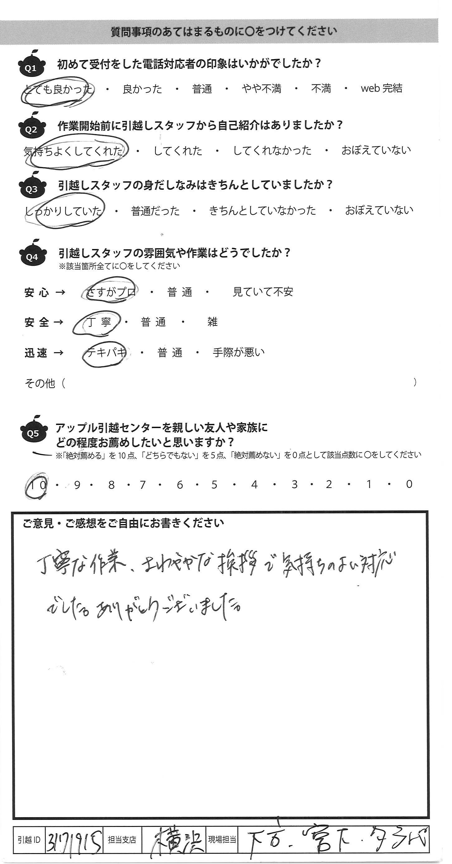 A.最初の挨拶から明るく、第一印象が良かったです。 作業も丁寧かつ速く、あっという間に終わり、大変 ありがたかったです。また、作業中に話しかけても 丁寧に答えてくださいました。 お二人に引っ越しのお手伝いをしていただけて 良かったと思える作業でした。 お世話になりました。ありがとうございました。