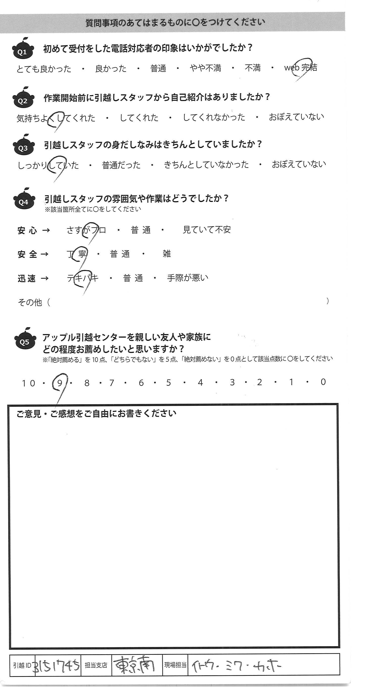 A.電話をかけた時から私の話を よく聞いて下さり、普通の引越しでは なく複雑なお願いをしたにも関らず 感じもよく、当日も私のお願いに気持 ちよく対応して下さり助かりました。 毎回とても満足です。 ありがとうございました。