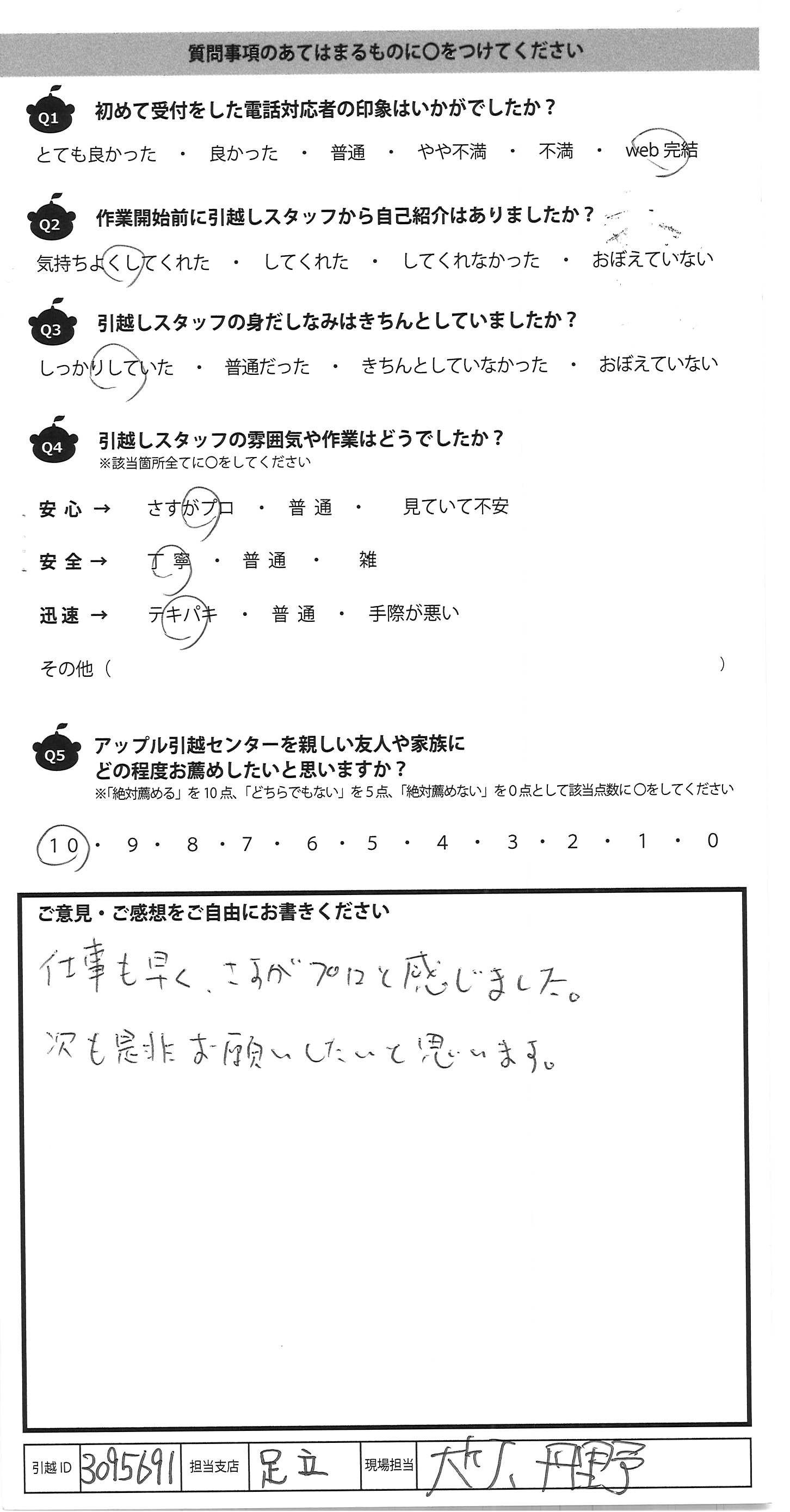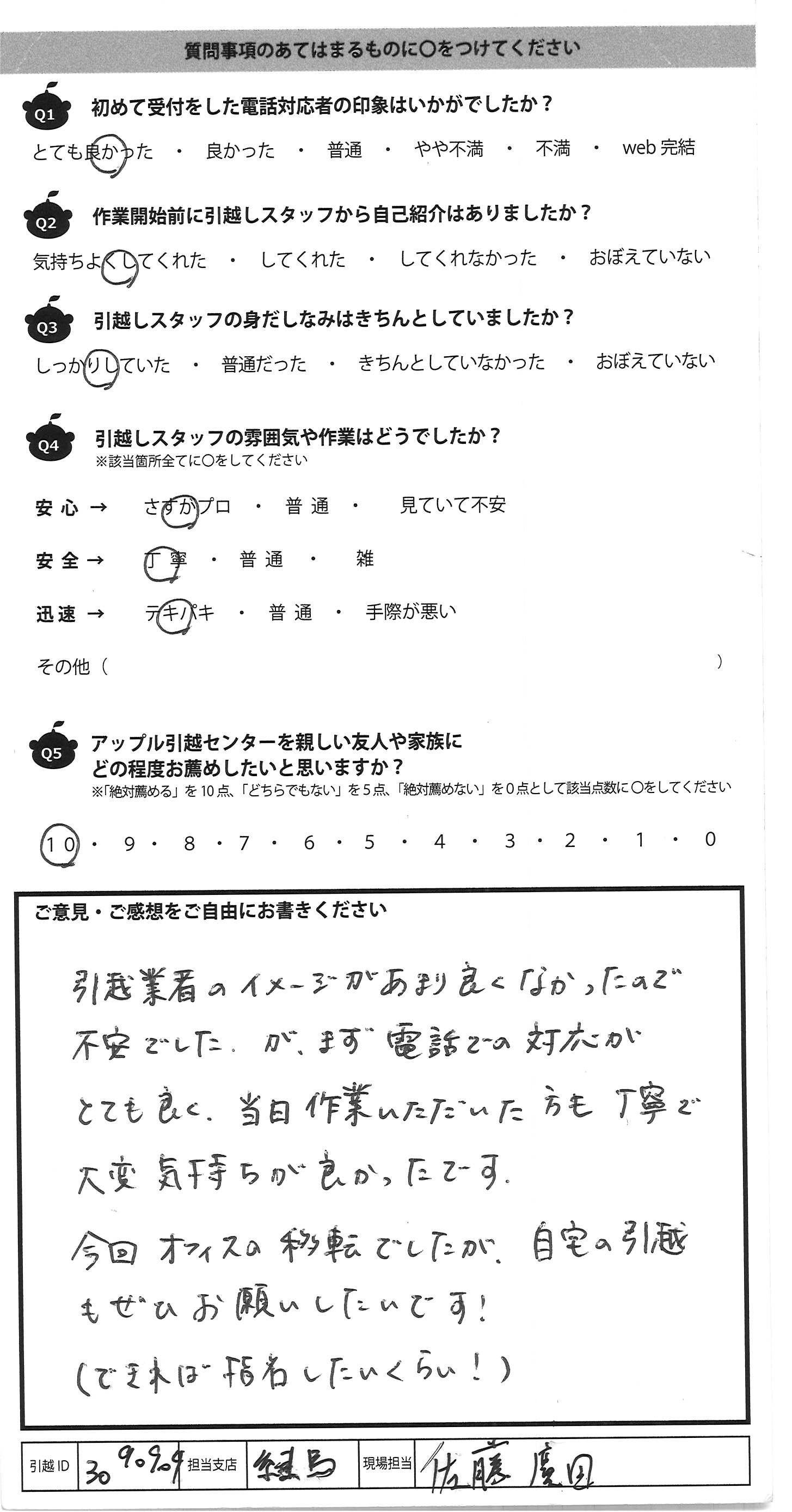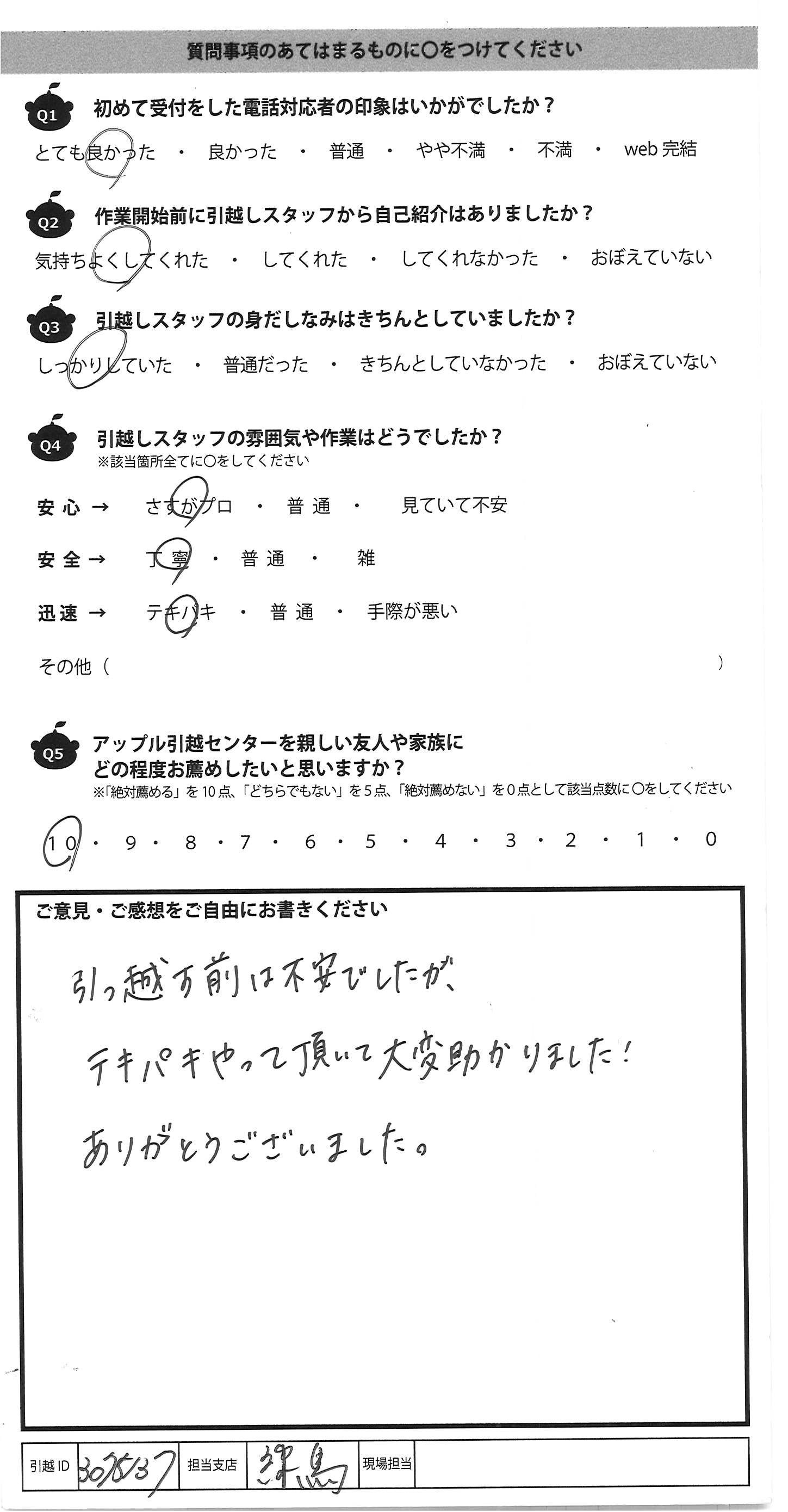 A.引っ越す前は不安でしたが、 テキパキやって頂いて大変助かりました! ありがとうございました。