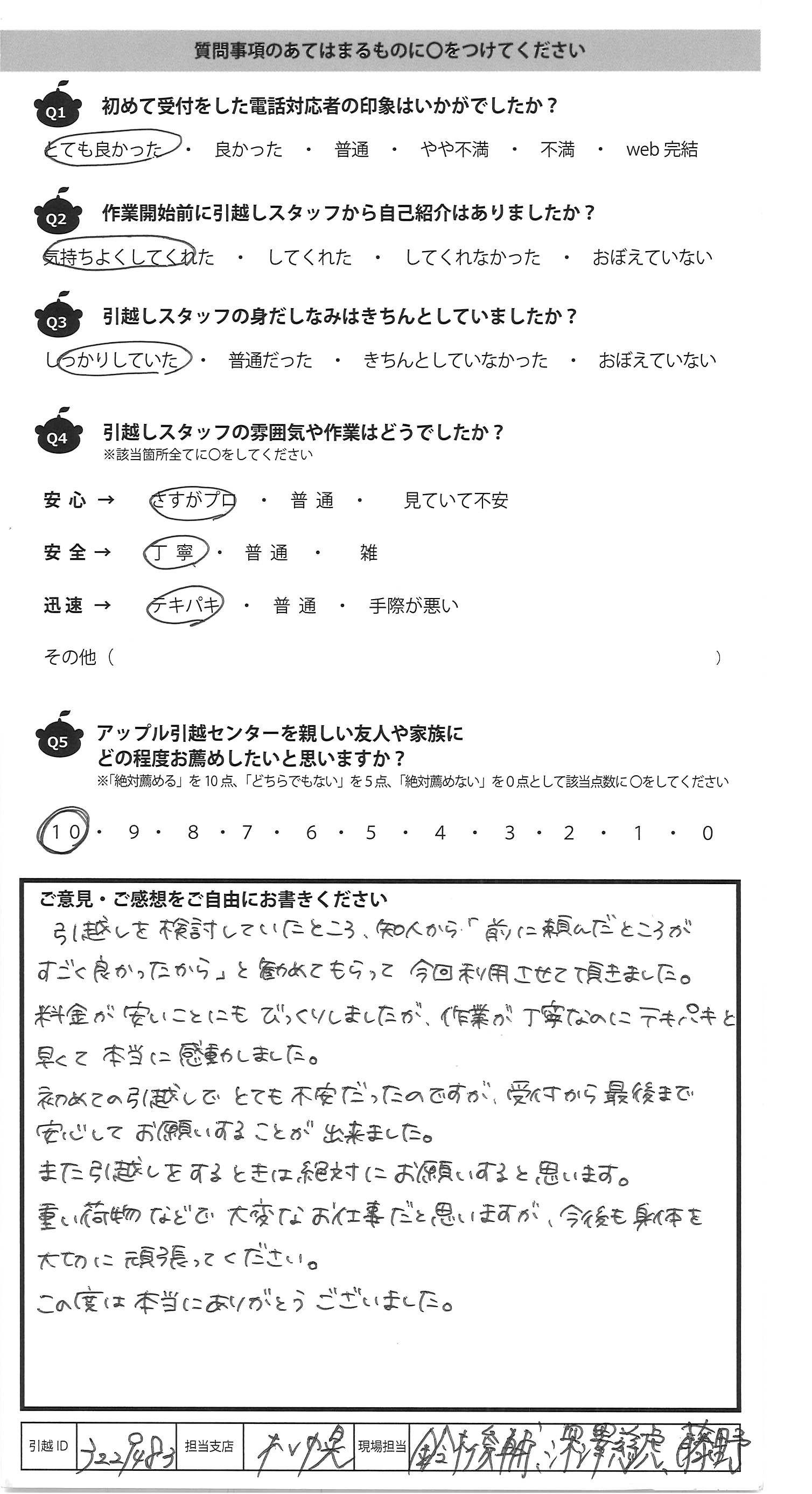 A.引越しを検討していたところ、知人から「前に頼んだところが すごく良かったから」と勧めてもらって今回利用させて頂きました。 料金が安いことにもびっくりしましたが、作業が丁寧なのにテキパキと 早くて本当に感動しました。 初めての引越しでとても不安だったのですが、受付から最後まで 安心してお願いすることが出来ました。 また引越しをするときは絶対にお願いすると思います。 重い荷物などで大変なお仕事だと思いますが、今後も身体を 大切に頑張ってください。 この度は本当にありがとうございました。