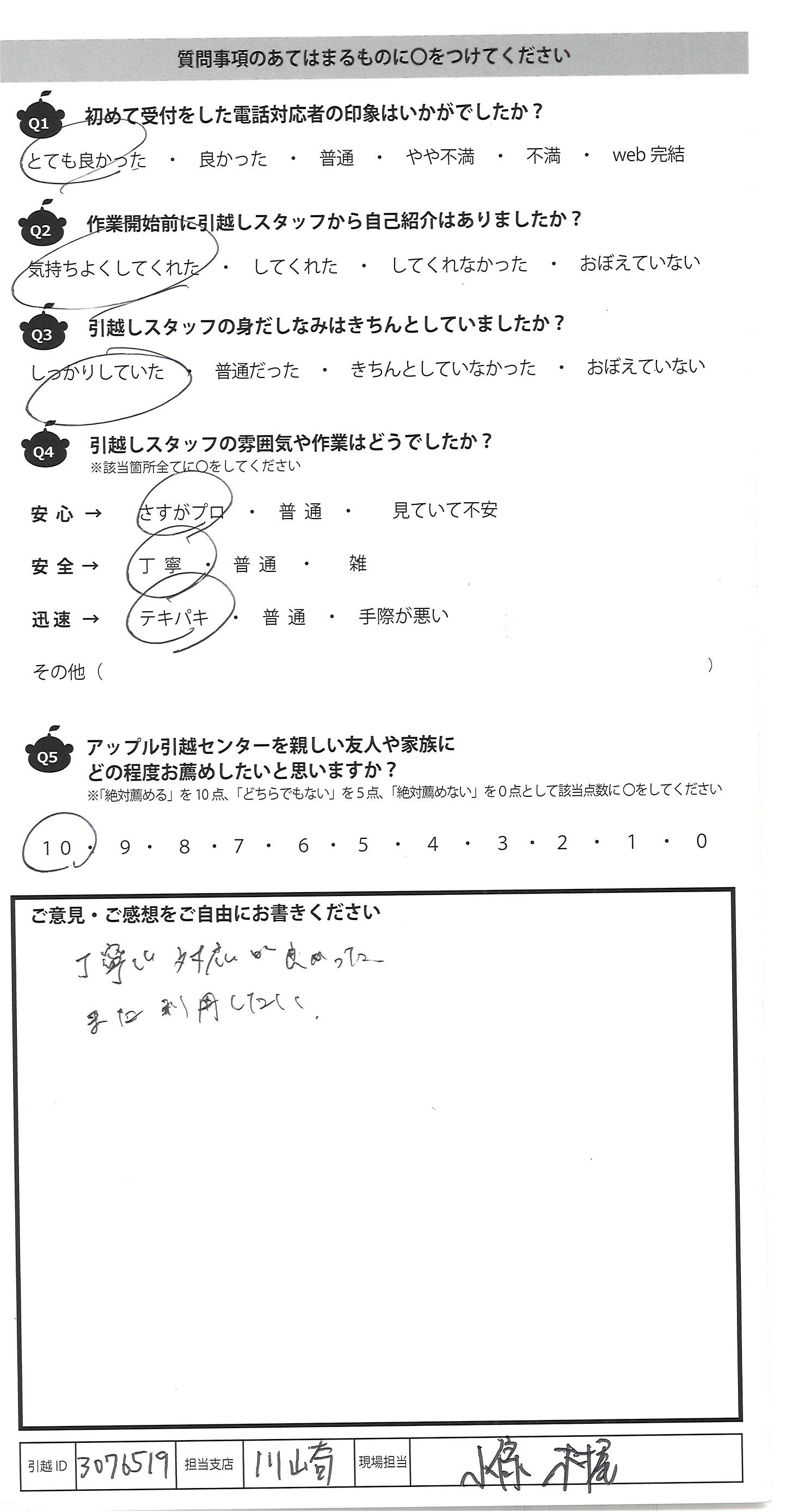 A.作業前から作業完了後まで どなたにも対応良く、 すごく良かったです! もしまた引っ越すことが あればお願いしたいと思う。 ありがとうございました