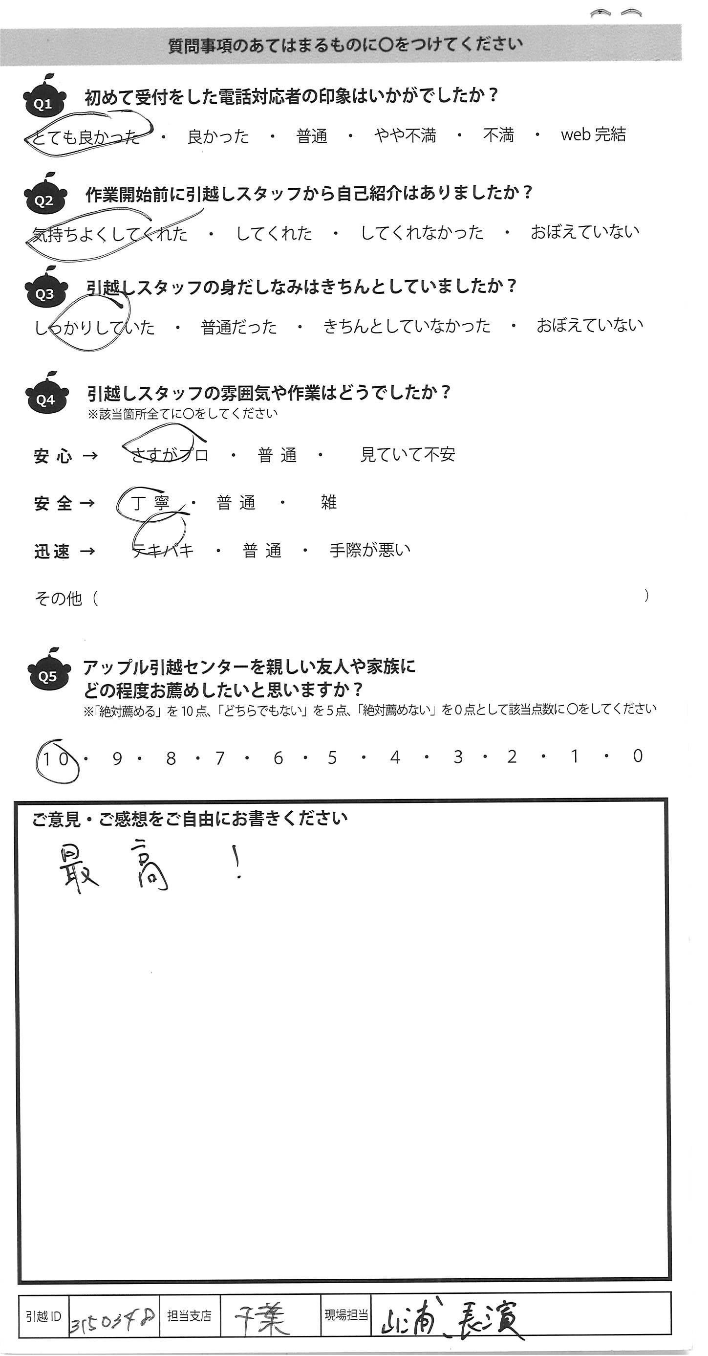 A.前回利用させていただいたときと同様に丁寧に作業をしていただきました。ただ、作業終了時にトラックの中を一緒に確認する作業が実施されませんでした。その後、終了時にもらった書類には実施済みにチェックが入っていたので少し気になりました。また、アンケートの紙が入っていなかったことも、あとから発覚しました。作業は丁寧で迅速だったため、最後の抜けが少し気になります。また機会がありましたら利用させていただきたいです。ありがとうございました。