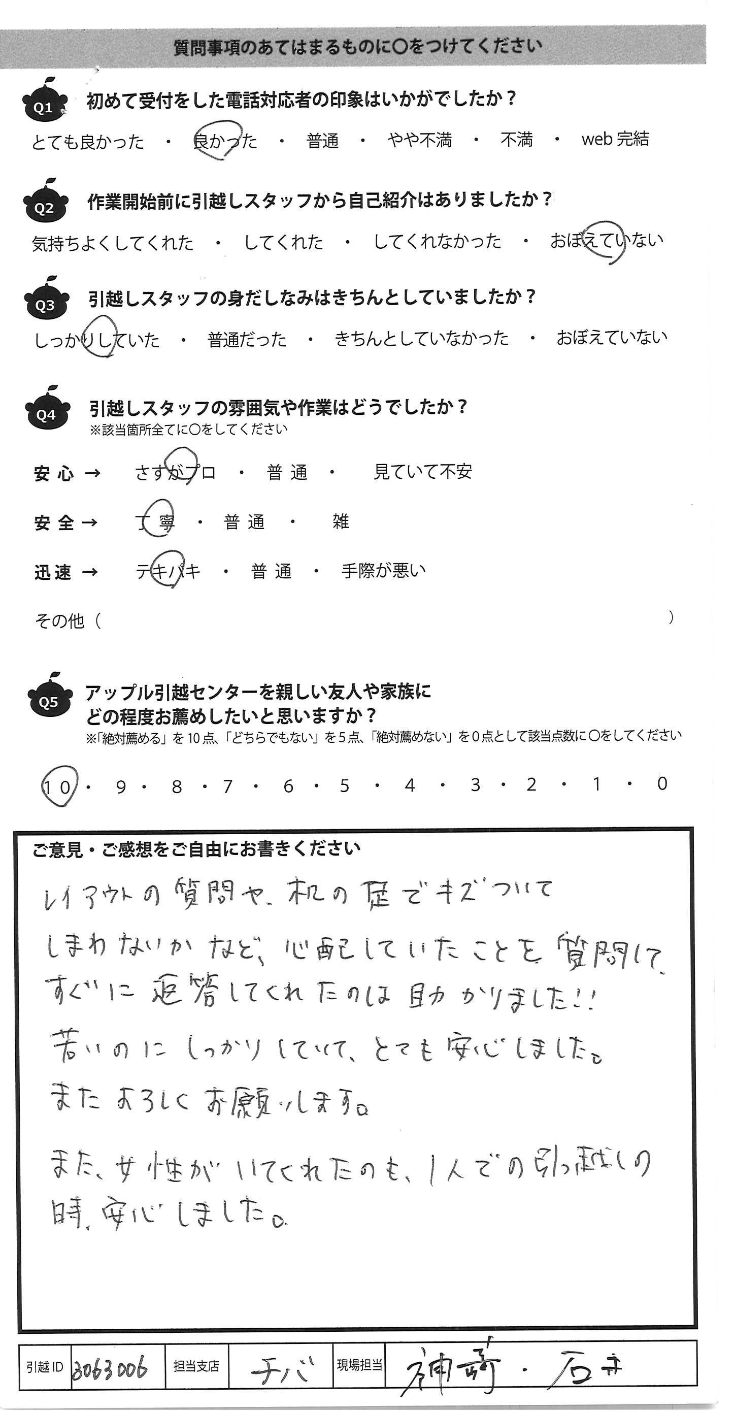 A.レイアウトの質問や、机の足でキズついて しまわないかなど、心配していたことを質問して、 すぐに返答してくれたのは助かりました!! 若いのにしっかりしていて、とても安心しました。 またよろしくお願いします。 また、女性がいてくれたのも、1人での引っ越しの 時、安心しました。