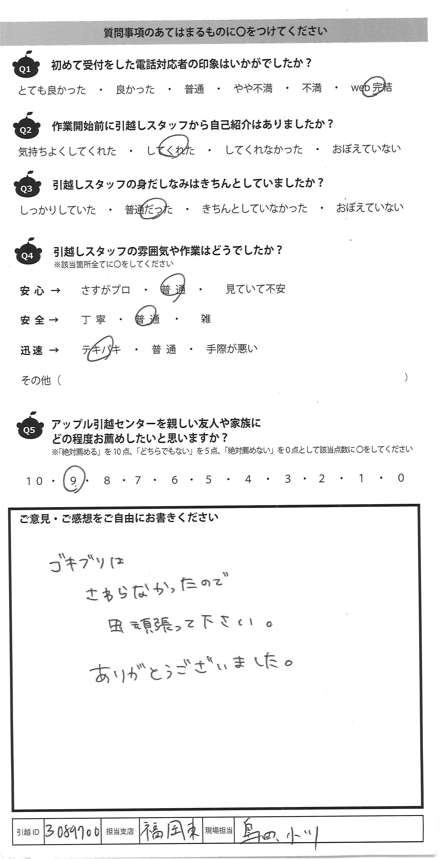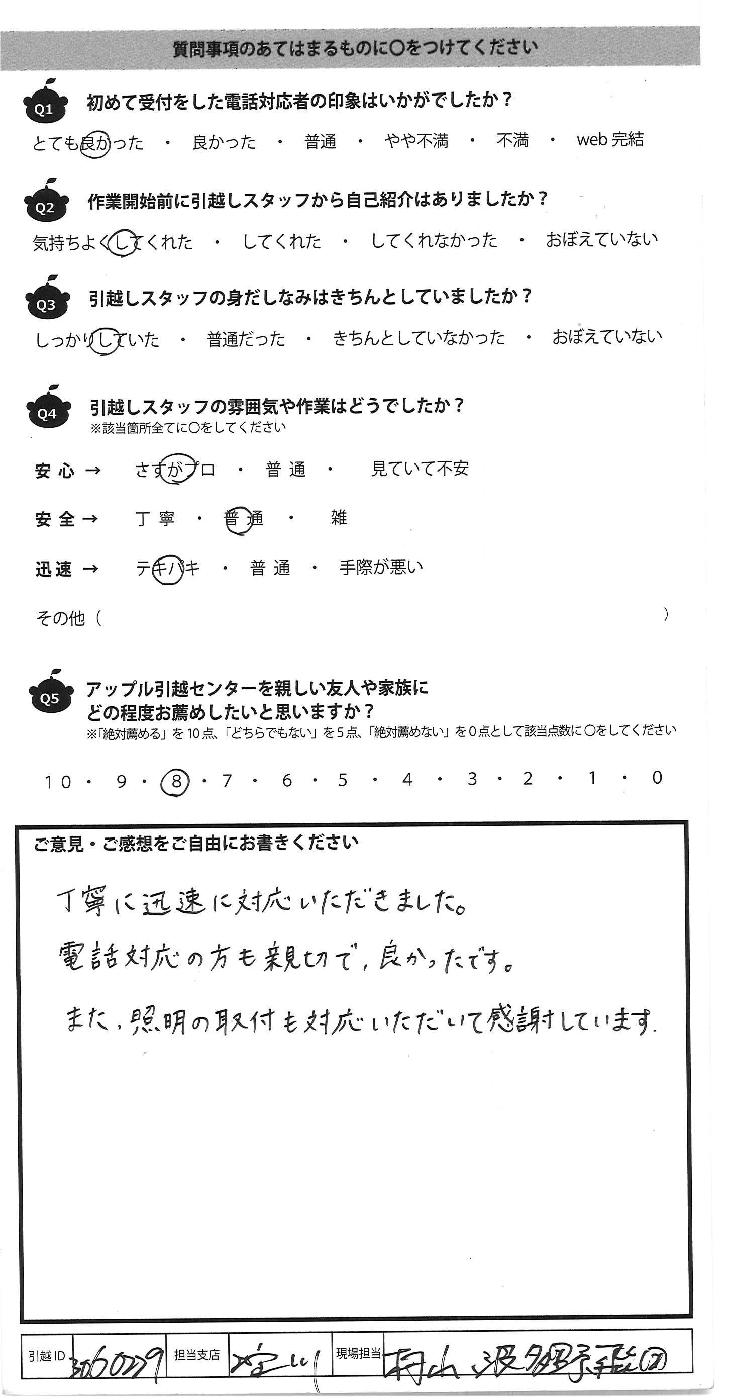 A.手際よく行業して頂きありがとうございました。 気持ち良い引越しができました。