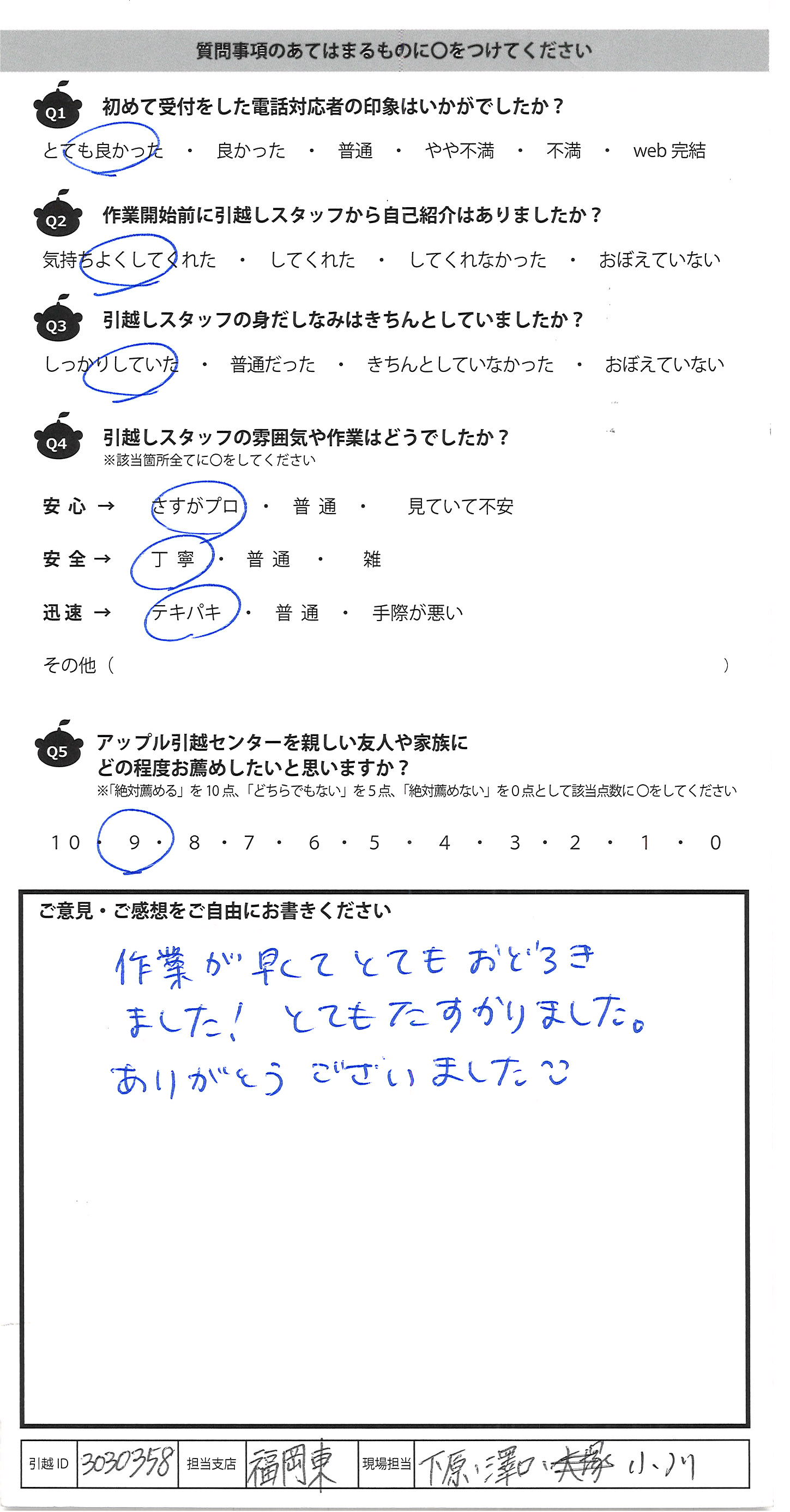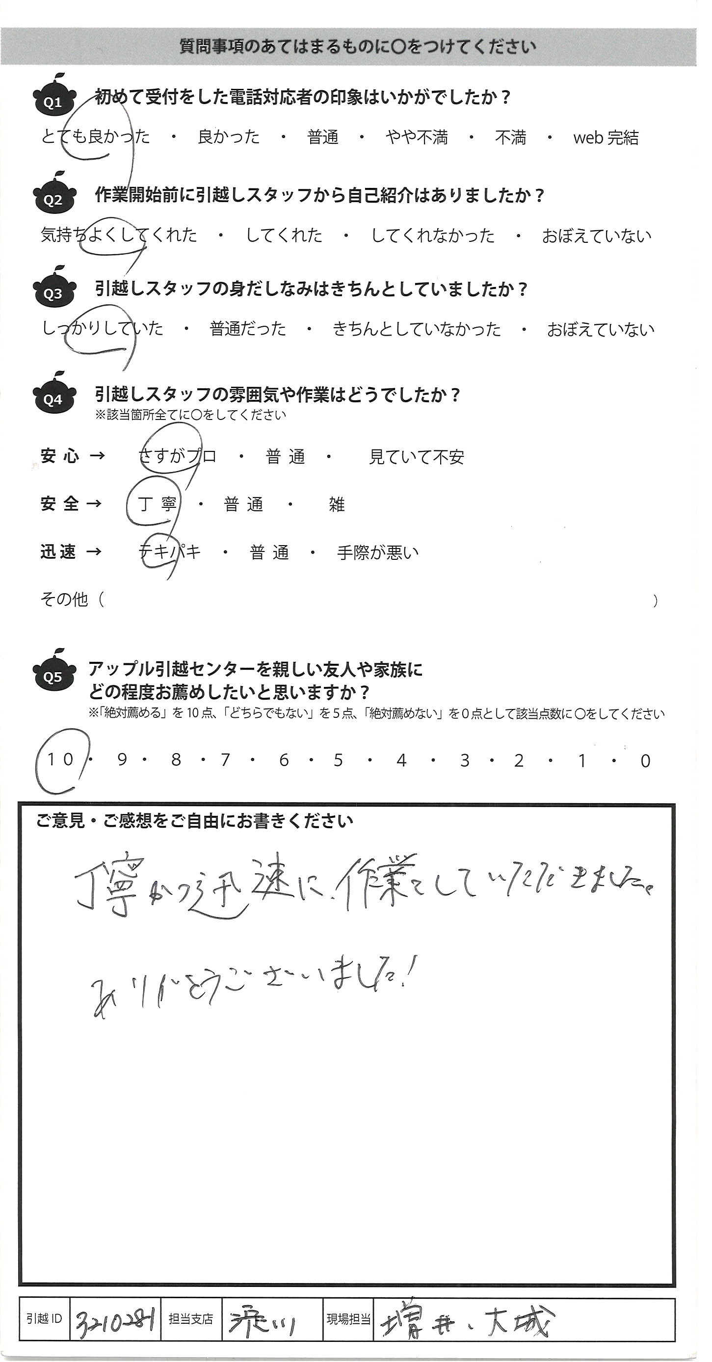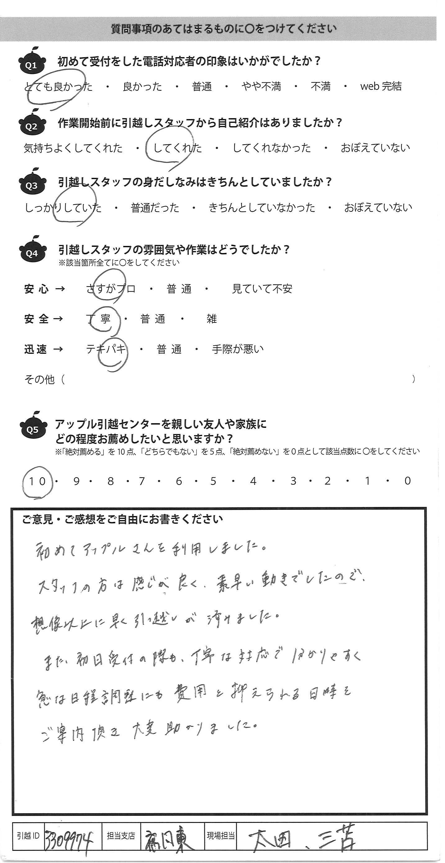 A.気持ちとしては10ですが何事でも私は人に「すすめる」ということはしませんので 若い方が3人で責任者の方に指示をあおいだりしながら元気で 今回満足な引越ができました。ありがとうございます。 初めてお話をした松本さん(女性)がとても良かったので アップルさんに決めた感じです、説明も的確でした。 一戸建てから3DKへで荷物が多く引越日が 近づいてきとき予約をした息子に「お母さま、間に合わ れますか」ときいて下さり、前日、ちょっとしたことで電話で 質問した私に「がんばられましたね」と言って下さい ました仕事に時間をとられる毎日の中で一生懸命 荷物をまとめ、時間が足りないと泣きたい気持ちの私 にはうれしい言葉でした、ありがとうございました。