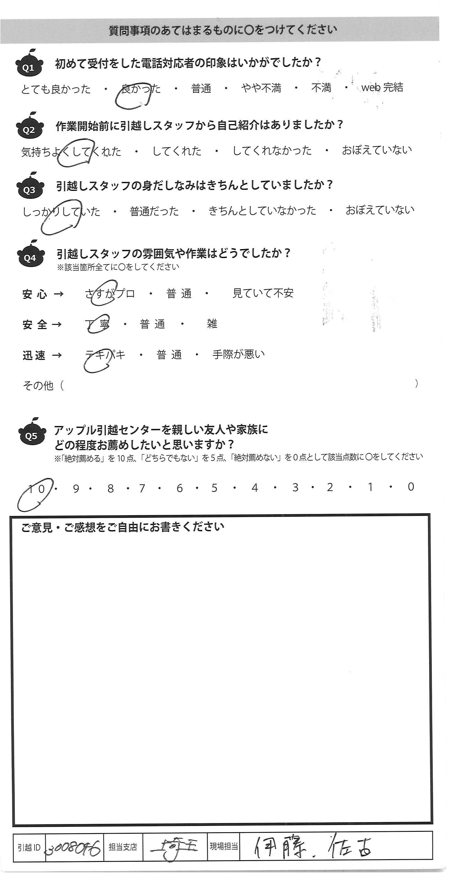 A.今回はありがとうございました。 すごく話しやすくて良かったです。 また引越しする事があれば利用したいと 思いました。