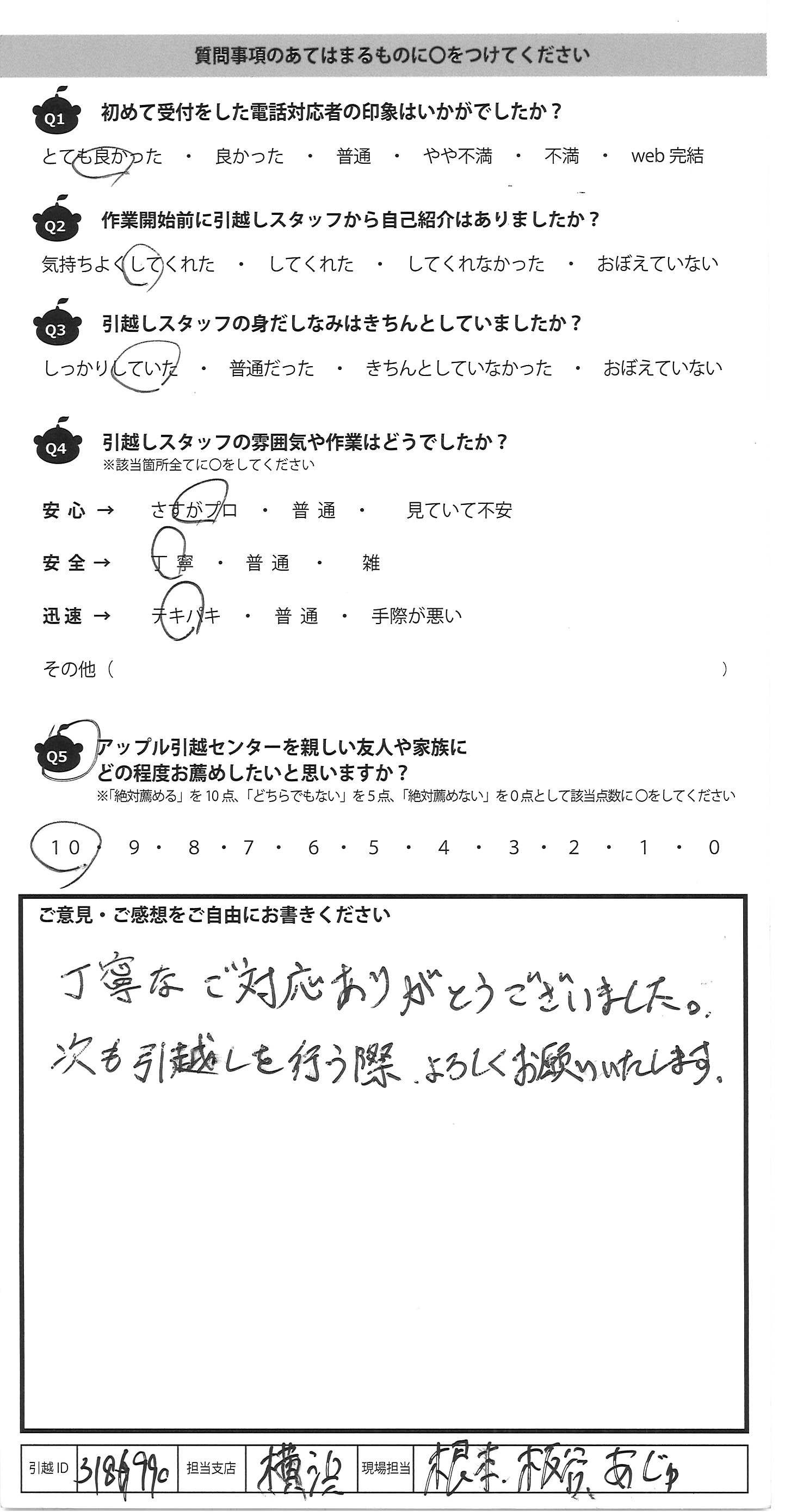 A.丁寧なご対応ありがとうございました。 次も引越しを行う際、よろしくお願いいたします。