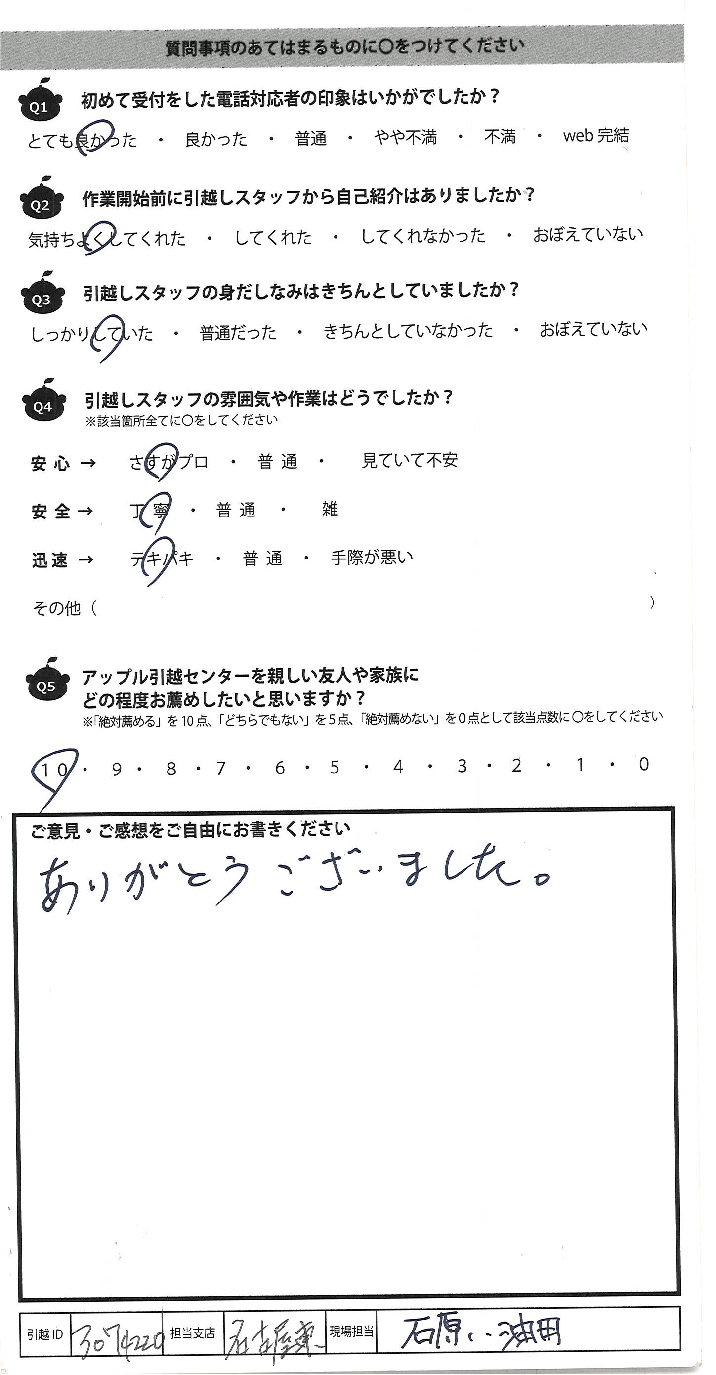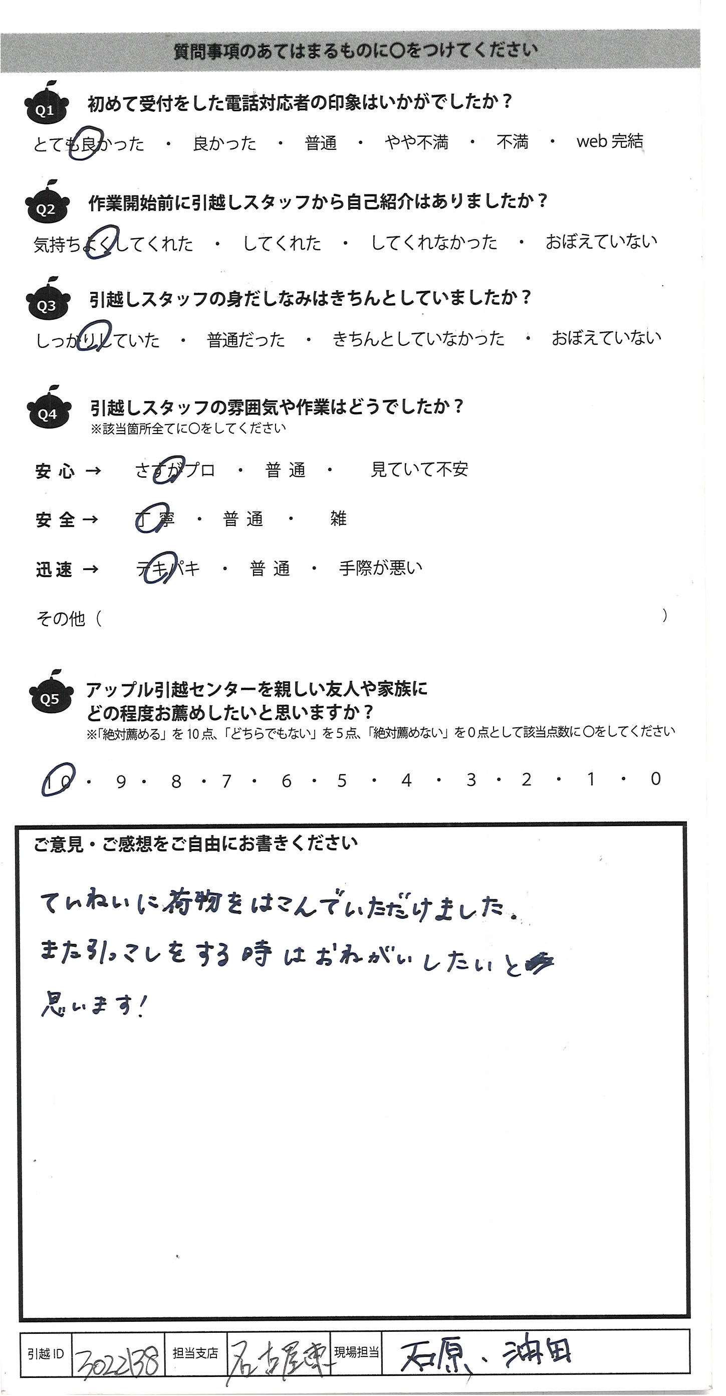 A.この度は大変お世話になりました。 運び出すものの確認や、急な追加対応にも応じていただき大変助かりました。 また、スタッフの方々の手際がよく 指示出しも的確に行われているなと感じました。次回引っ越す際にはまた利用させていただきたいと思います。