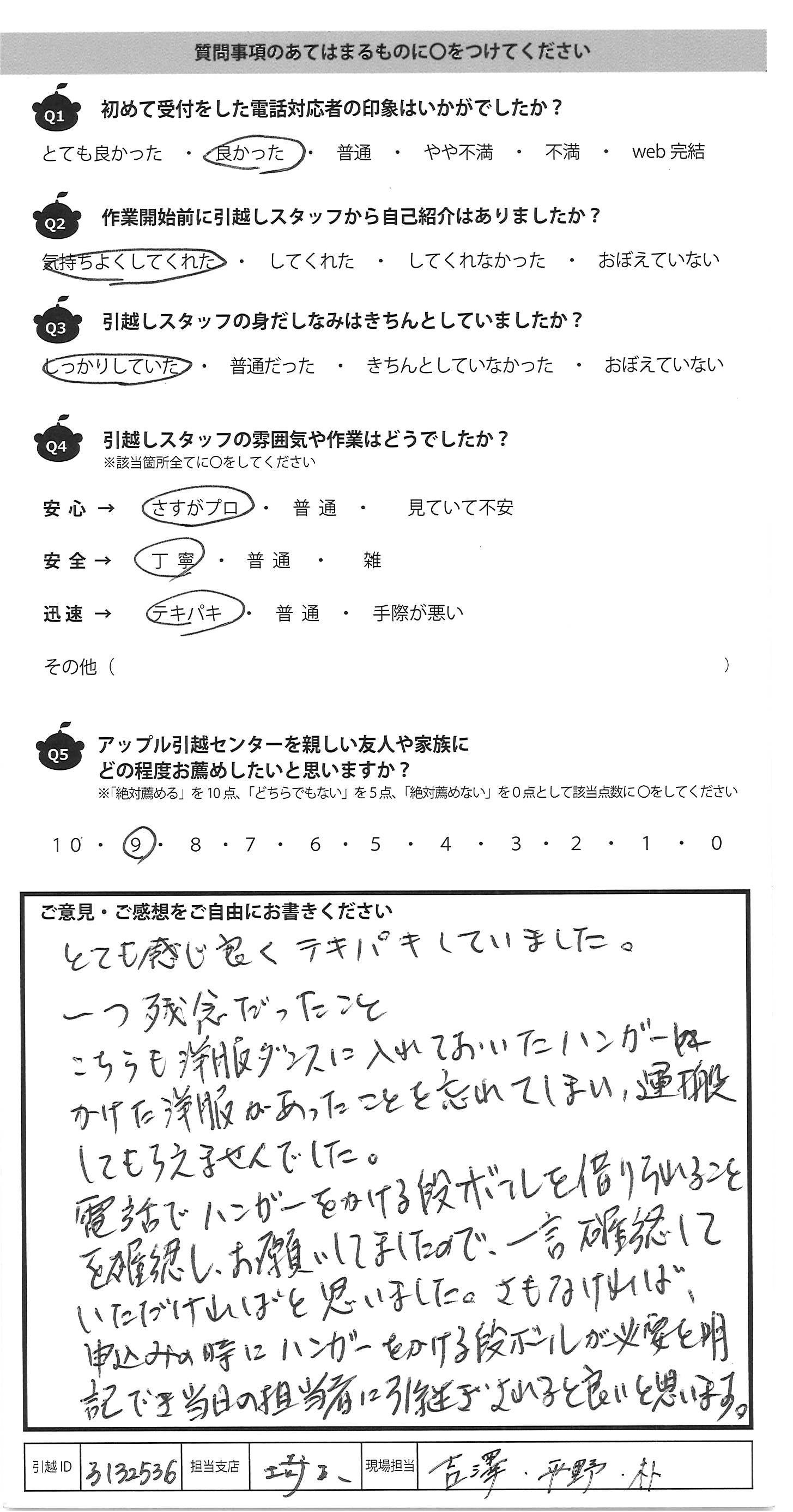 A.とても感じ良くテキパキしていました。 一つ残念だったこと こちらも洋服ダンスに入れておいたハンガーに かけた洋服があったことを忘れてしまい、運搬 してもらえませんでした。 電話でハンガーをかける段ボールを借りられること を確認し、お願いしてましたので、一言確認して いただければと思いました。さもなければ、 申込みの時にハンガーをかける段ボールが必要を明 記でき当日の担当者に引継ぎされると良いと思います。