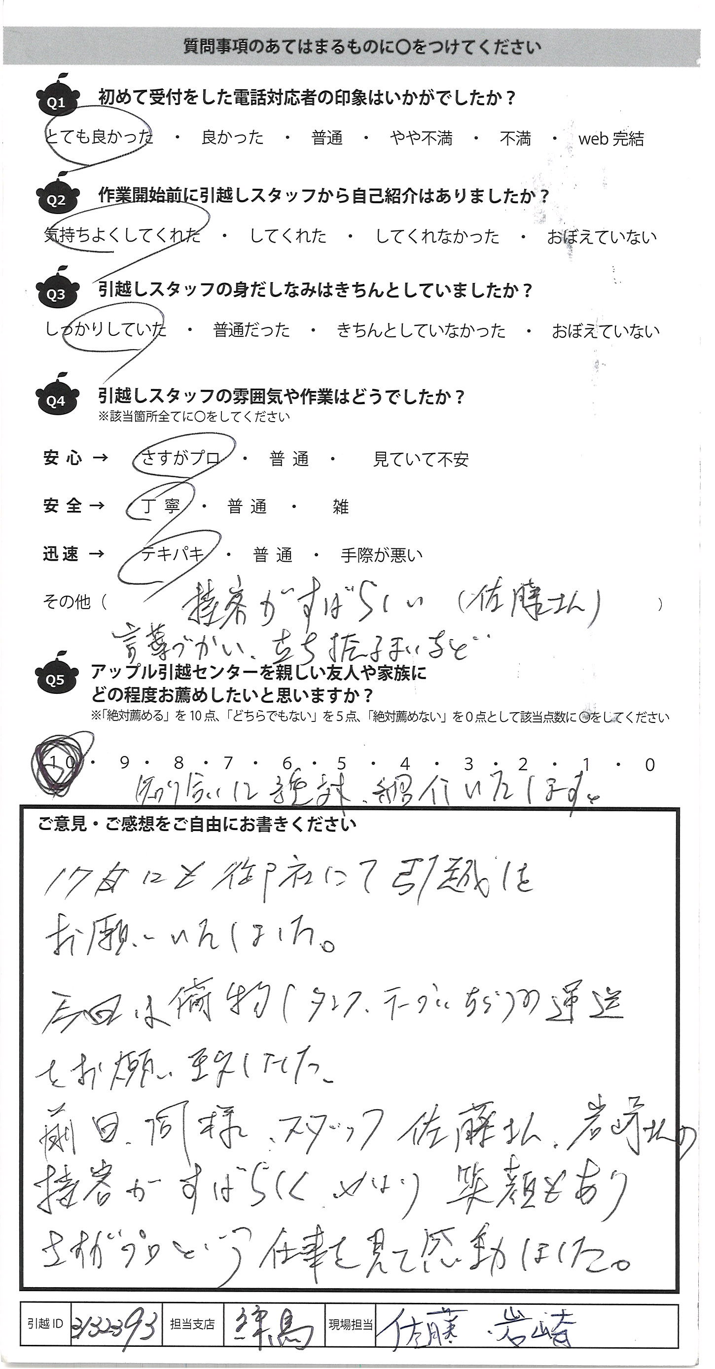 A.知り合いに絶対、紹介いたします。 17日にも御社にて引越しを お願いいたしました。 今回は荷物(タンステーブル )の運送 をお願い致しました。 前回、同様、スタッフ佐藤さn、岩崎さんの 接客がすばらしく、やはり笑顔もあり さすがプロという仕事を見て感動しました。