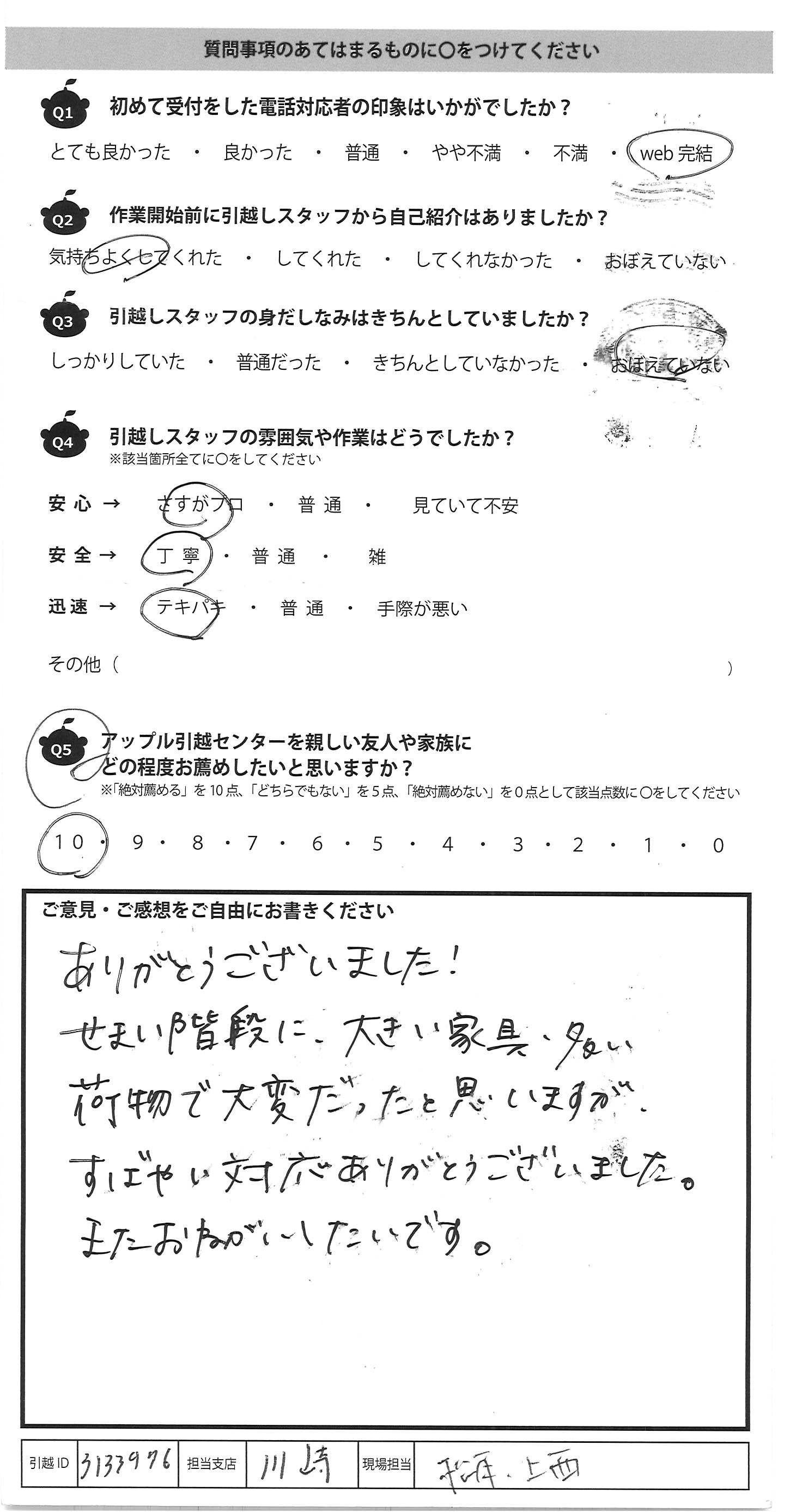 A.ありがとうございました! せまい階段に、大きい家具、多い 荷物で大変だったと思いますが、 すばやい対応ありがとうございました。 またおねがいしたいです。