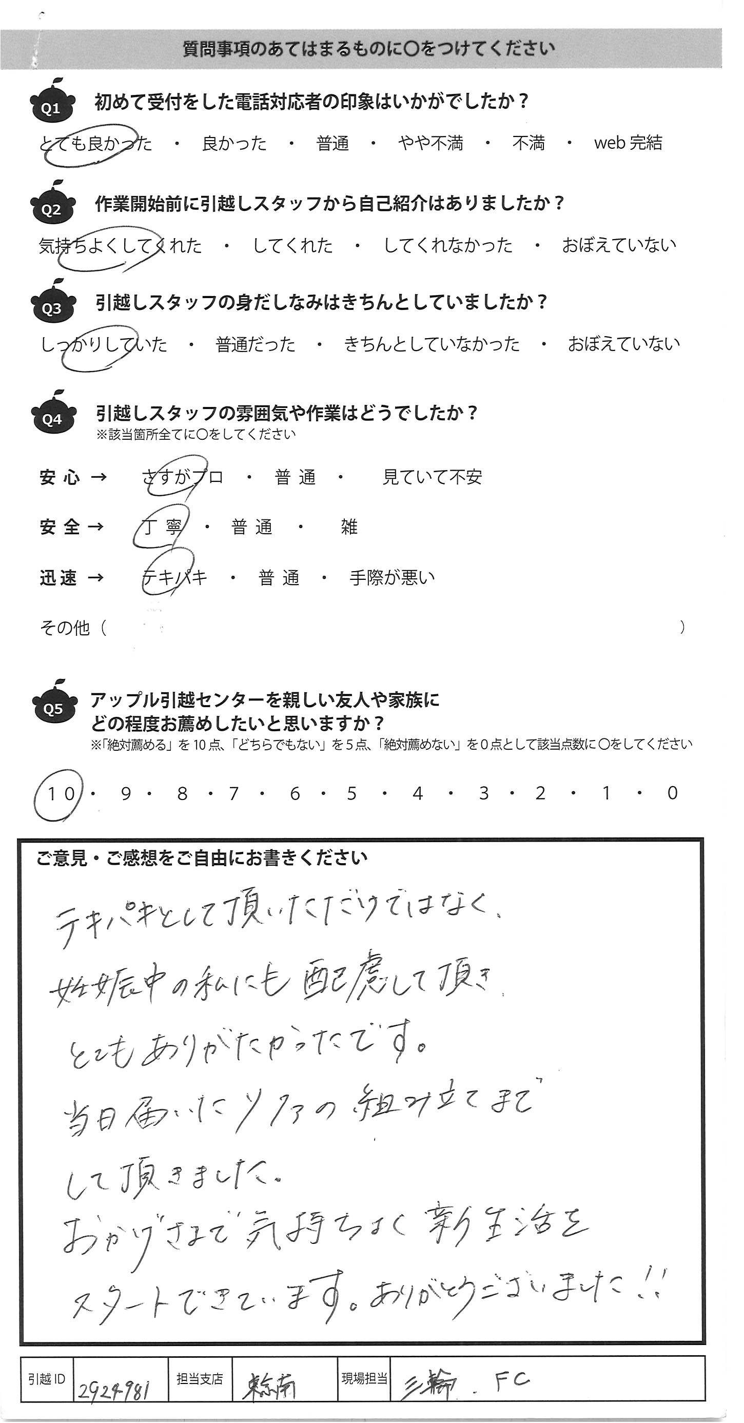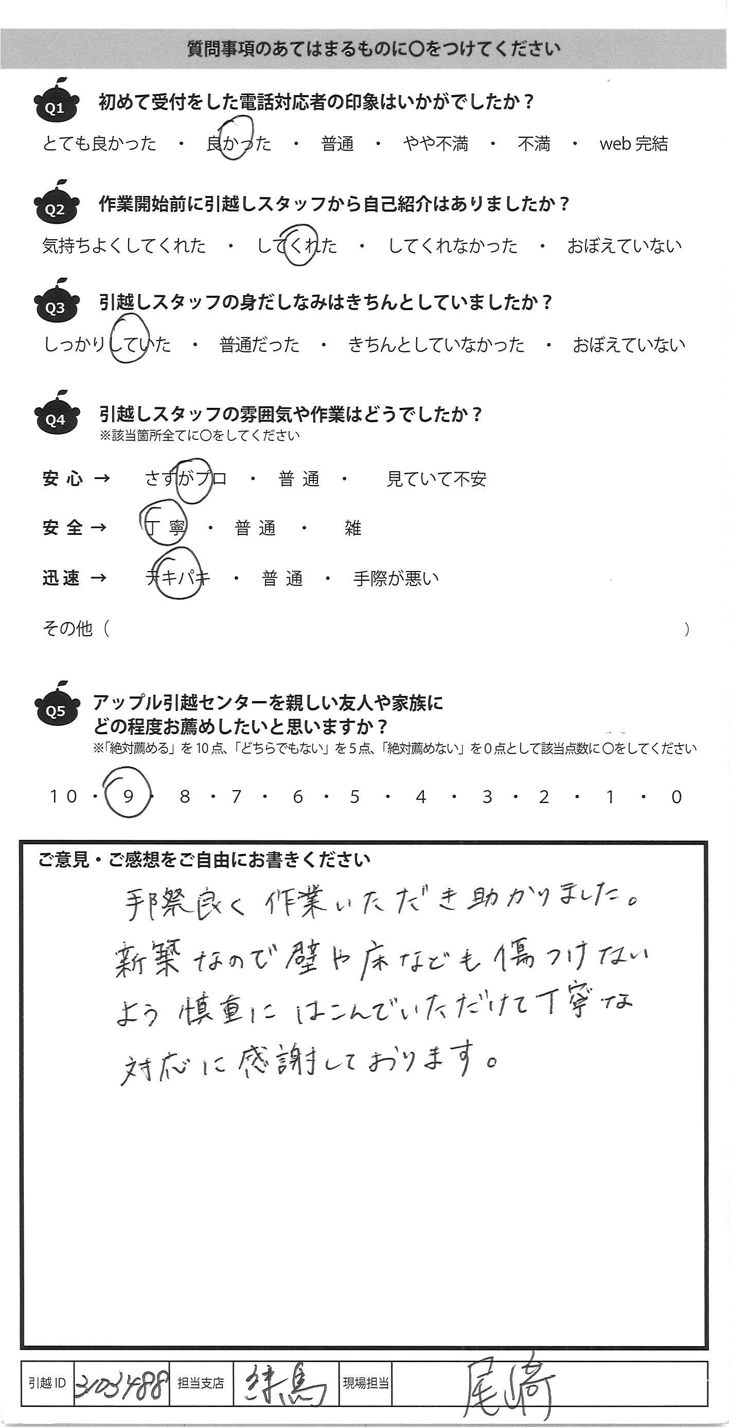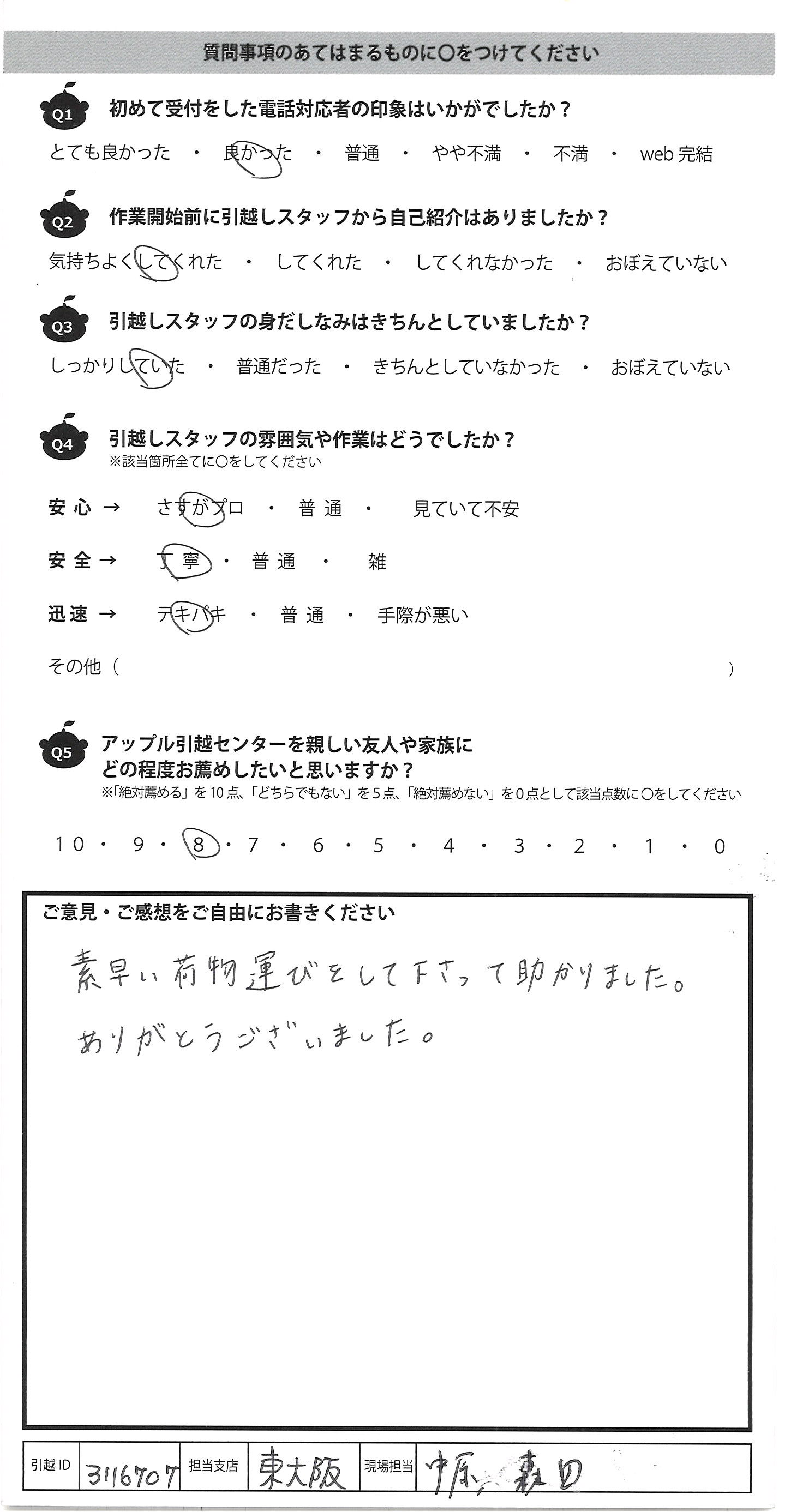 A.今回が3度目の利用でしたが、毎回リピートしたくなる 作業&対応ですっかりアップル引越センターのファンです。 今回も手厚く対応頂き、娘のことも気にかけて下さり とてもありがたかったです。寒い中遅い時間までありが とうございました! また引越の機会がありましたらお願いしたいと思 いますので宜しくお願いいたします。 又、引越する友人がいましたらおすすめしておきます