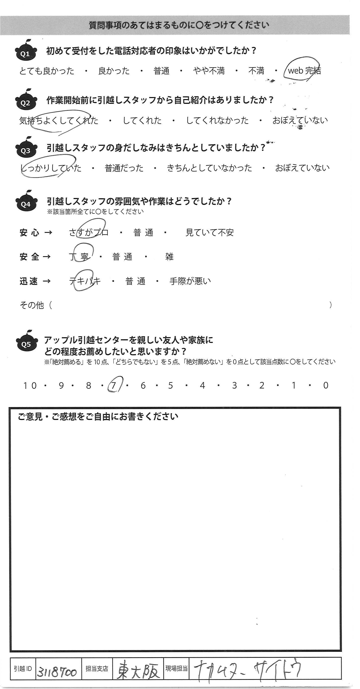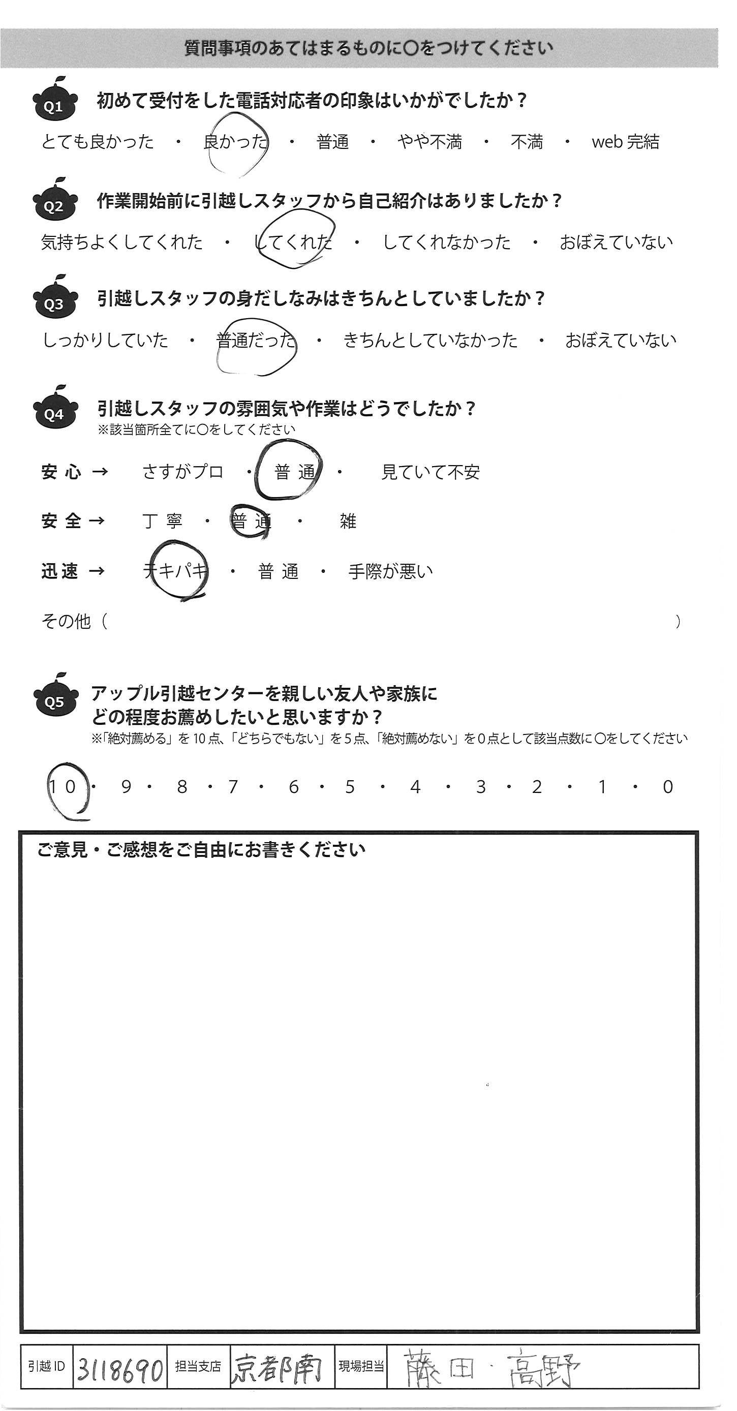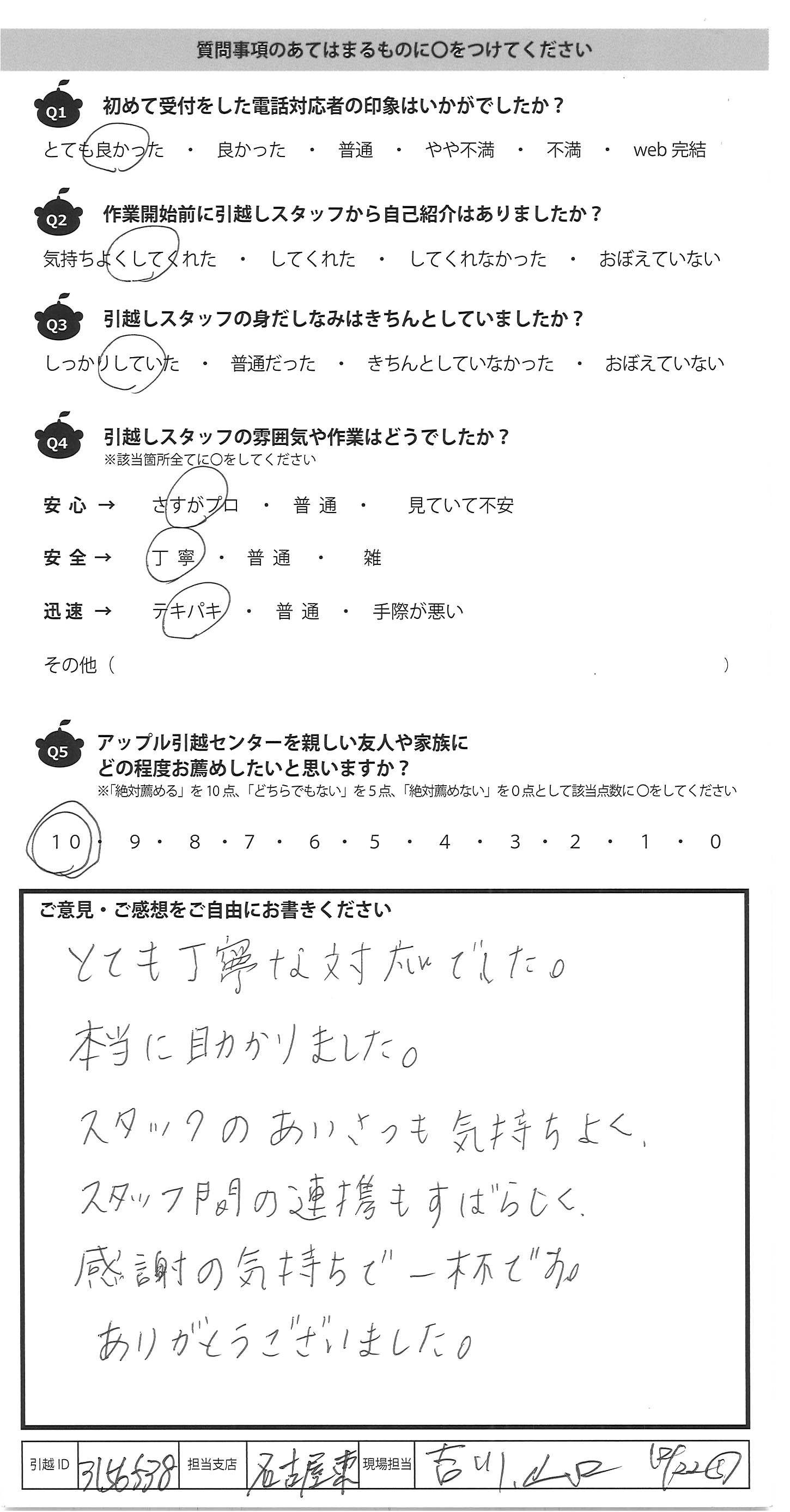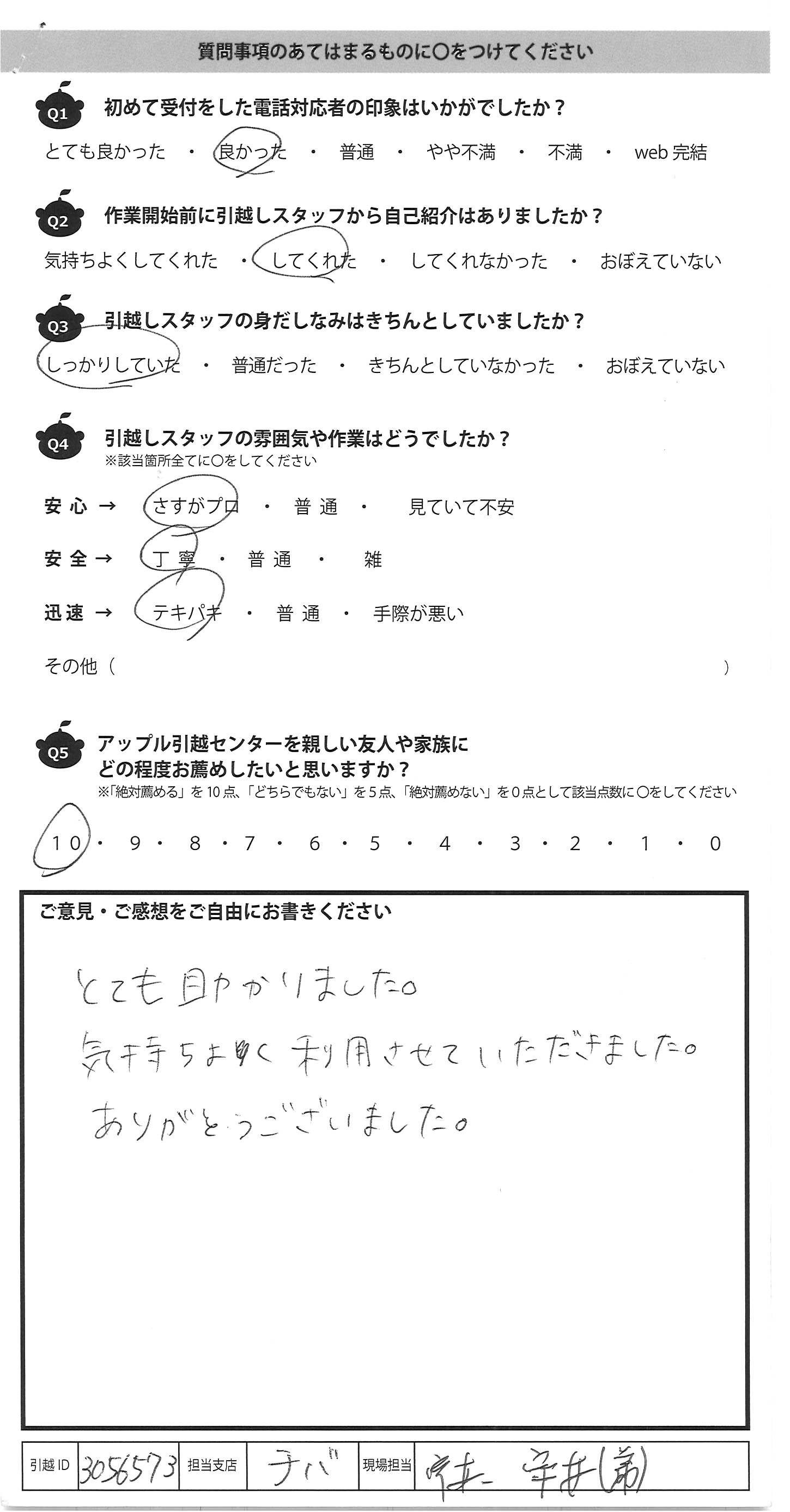 A.今回が3度目の利用でしたが、毎回リピートしたくなる 作業&対応ですっかりアップル引越センターのファンです。 今回も手厚く対応頂き、娘のことも気にかけて下さり とてもありがたかったです。寒い中遅い時間までありが とうございました! また引越の機会がありましたらお願いしたいと思 いますので宜しくお願いいたします。 又、引越する友人がいましたらおすすめしておきます